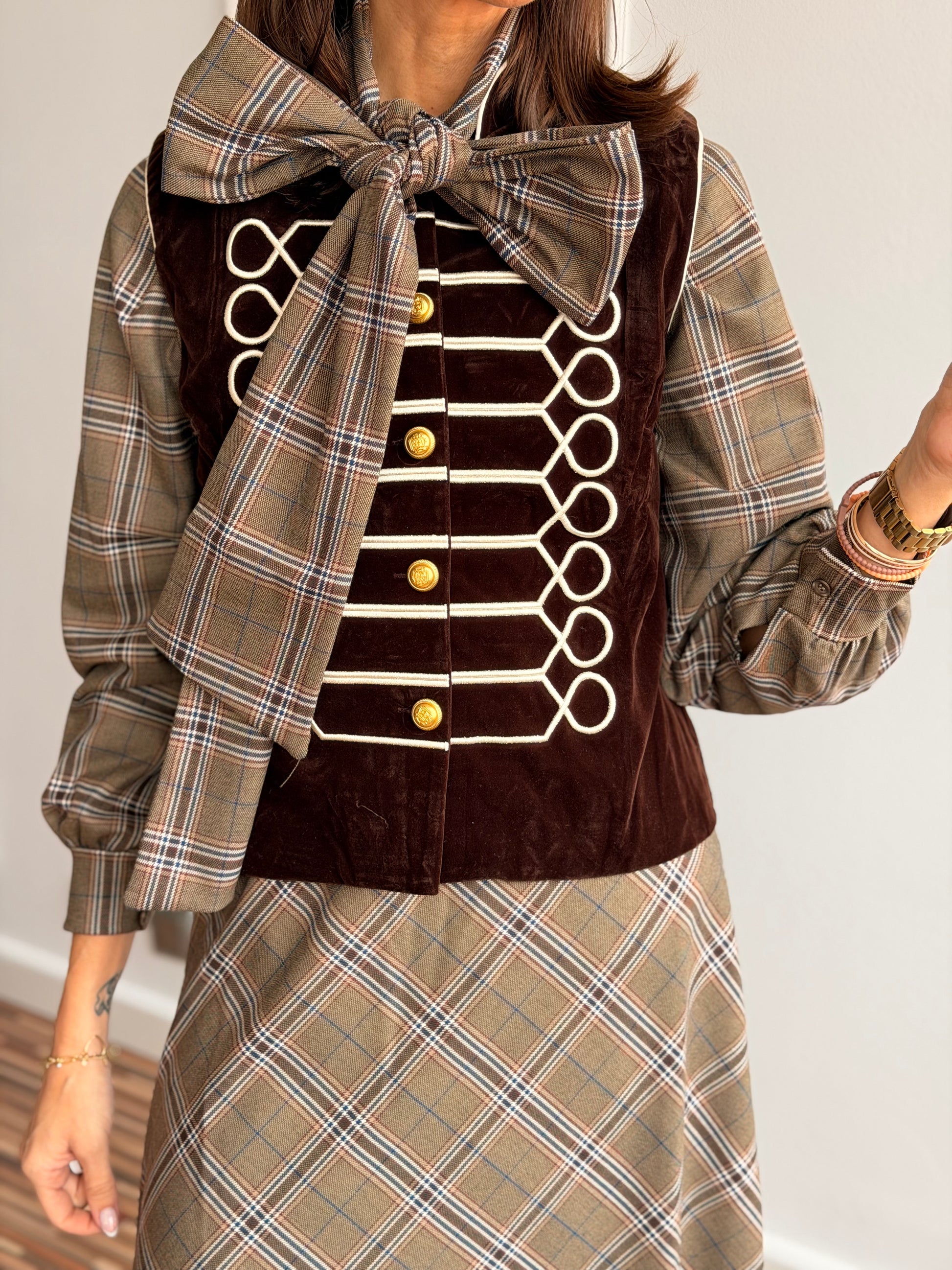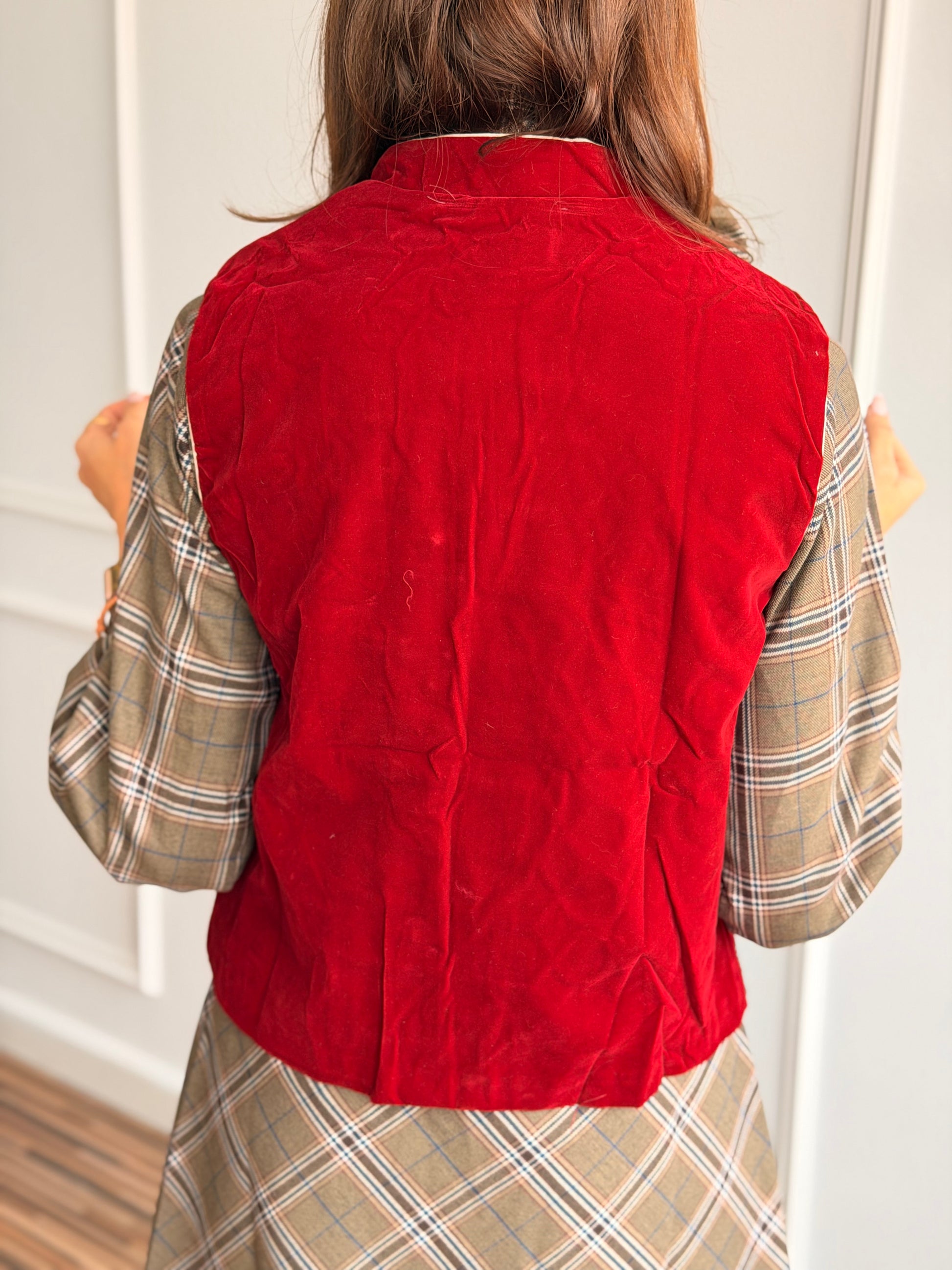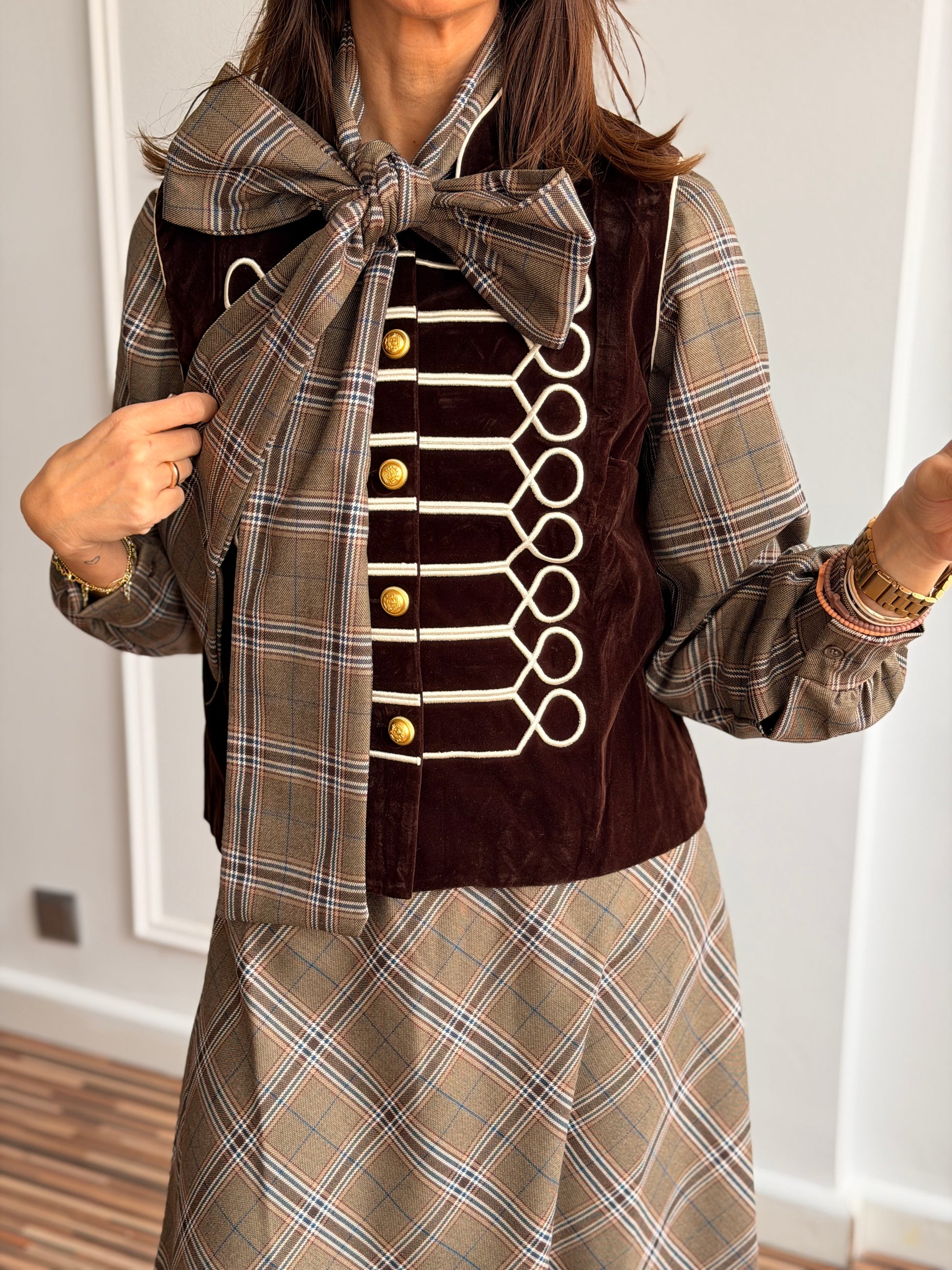Chaleco en terciopelo con detalle de bordado y botonadura dorada .