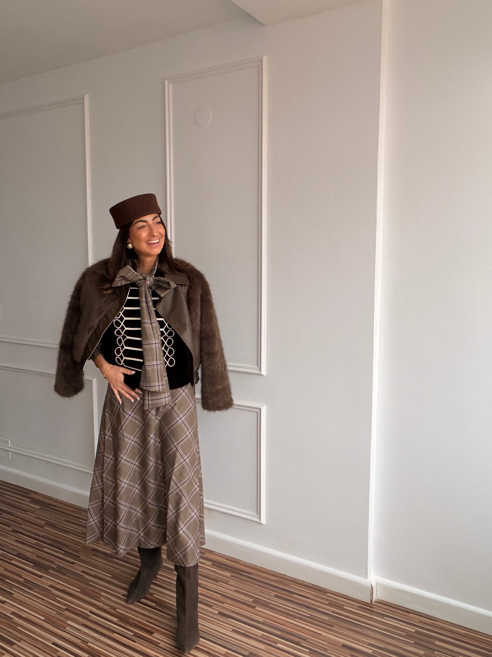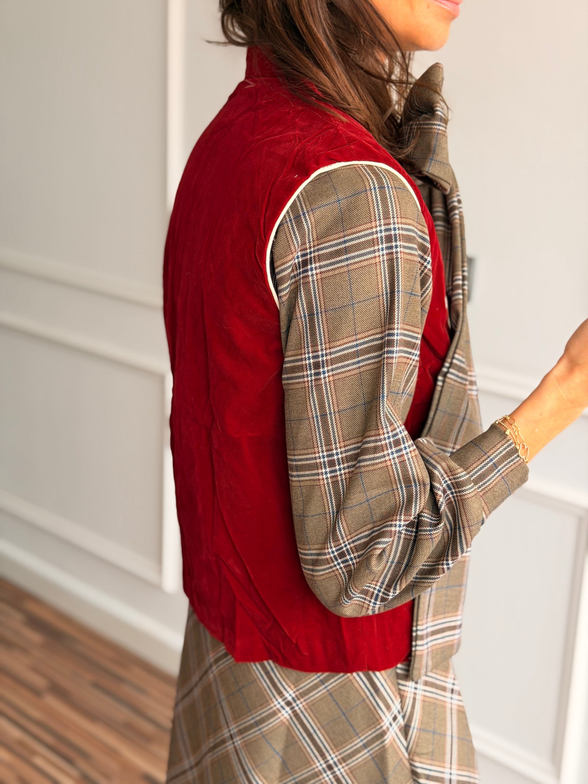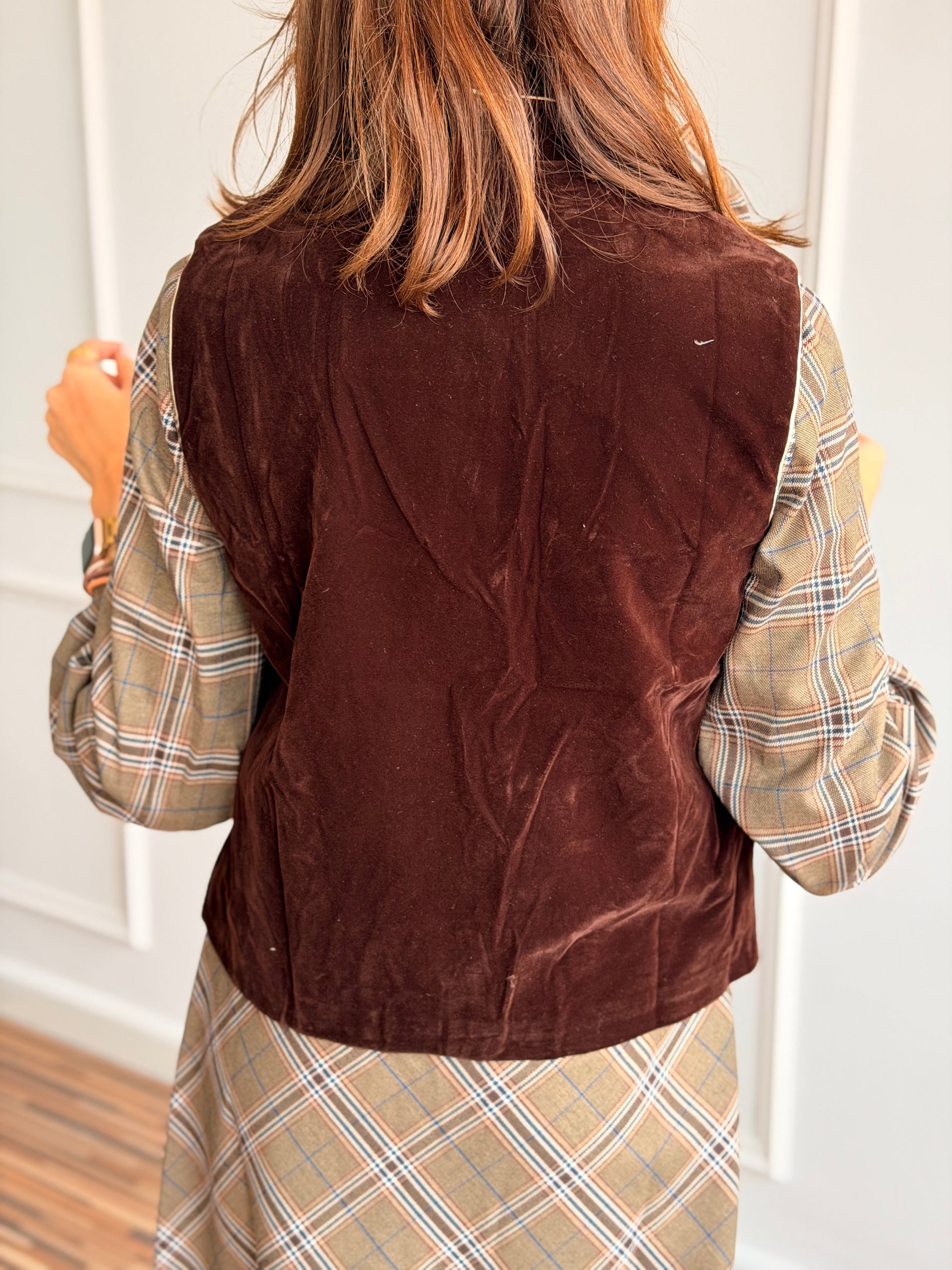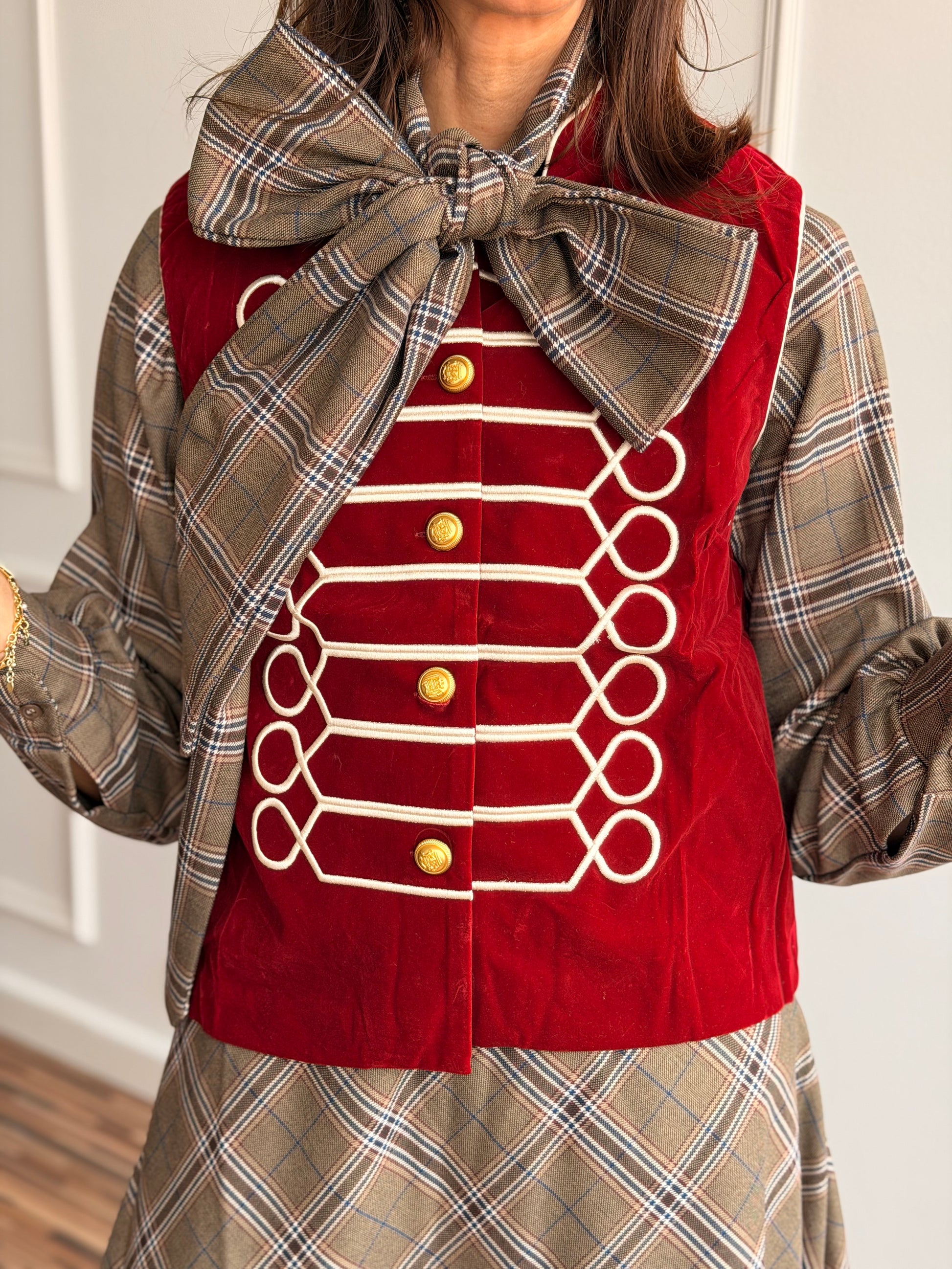 Chaleco en terciopelo con detalle de bordado y botonadura dorada .