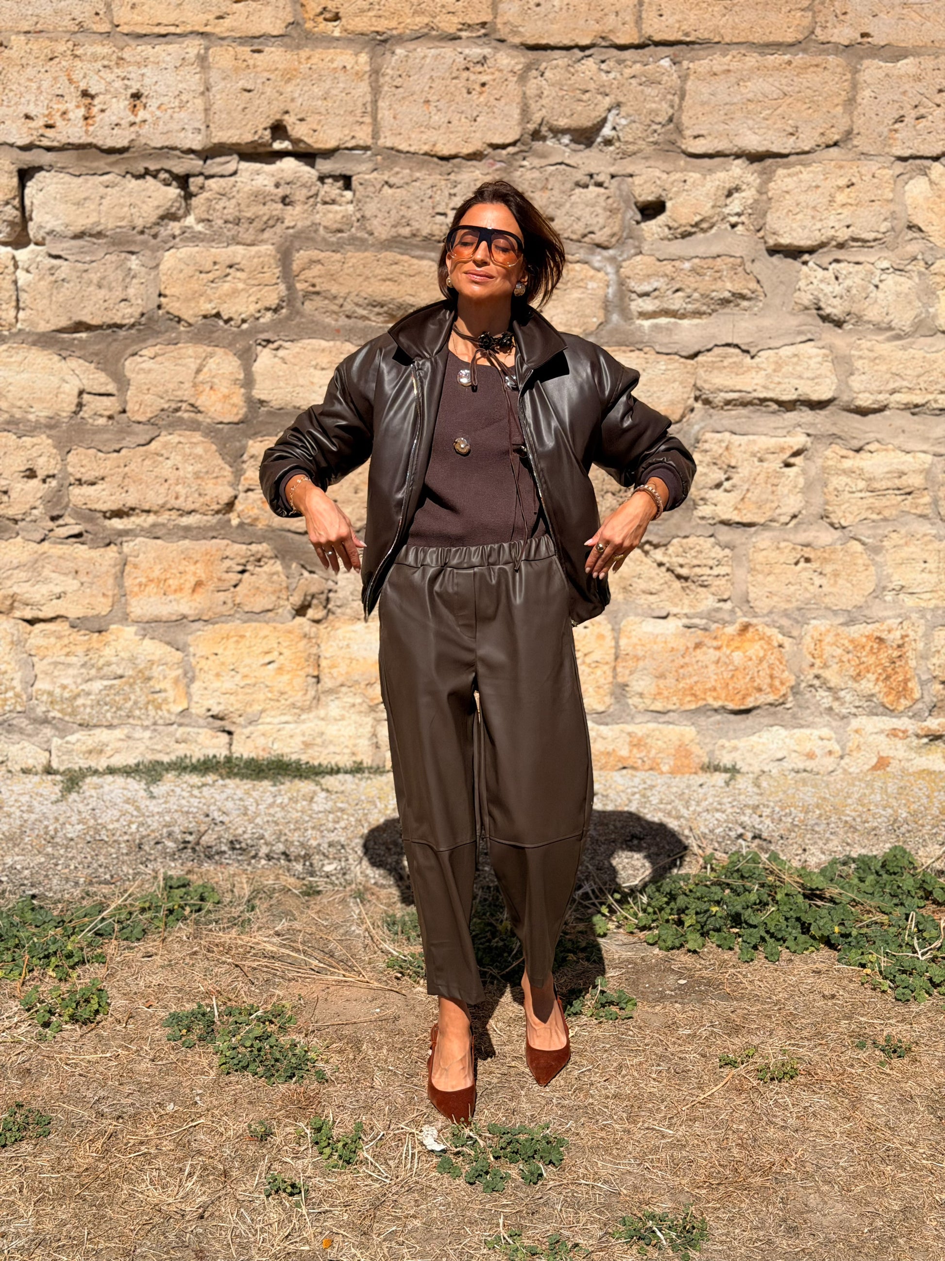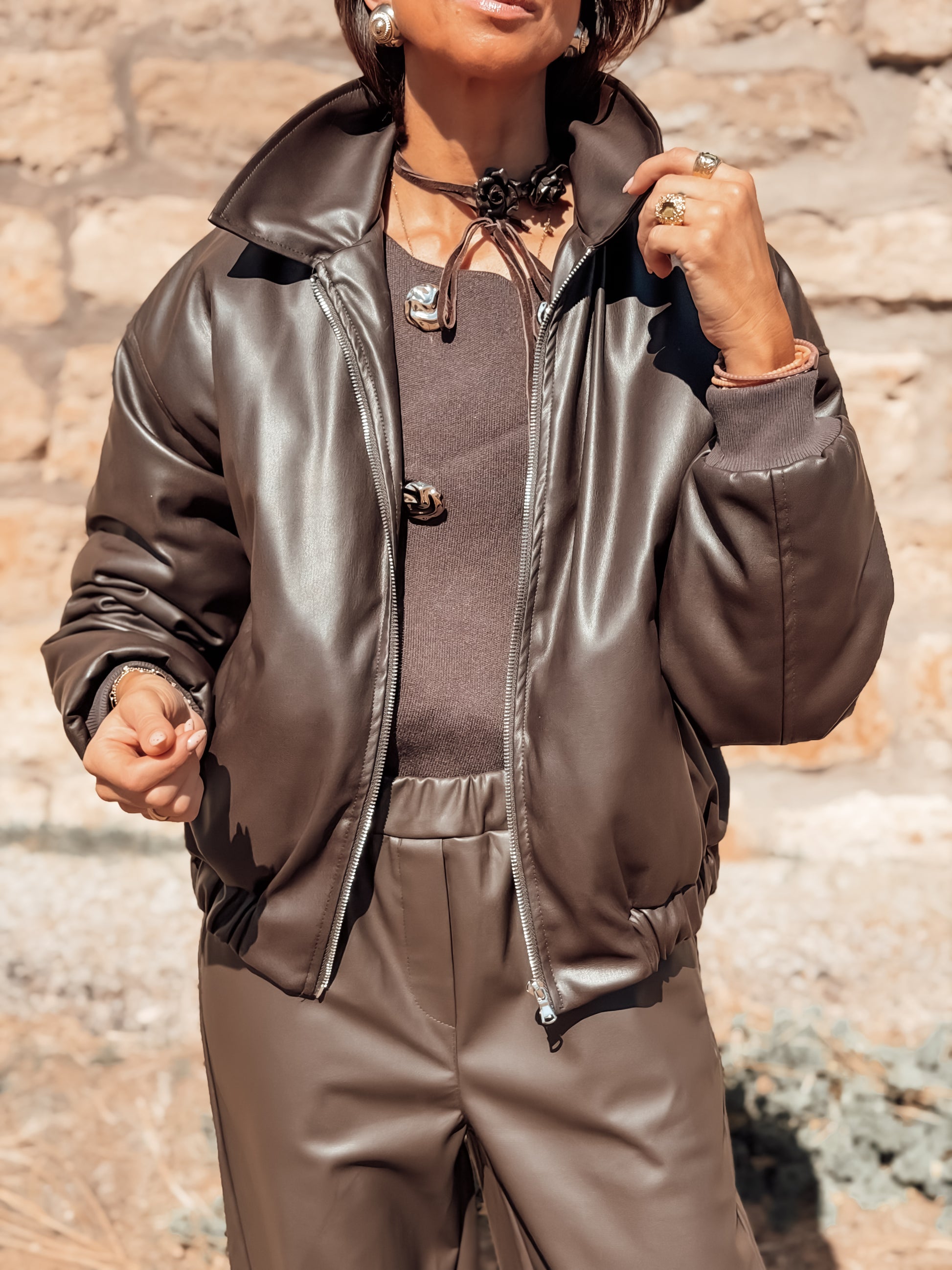 Una chaqueta bomber acolchada de polipiel, tendencia total esta temporada, de corte oversize, en un tono marrón oscuro.