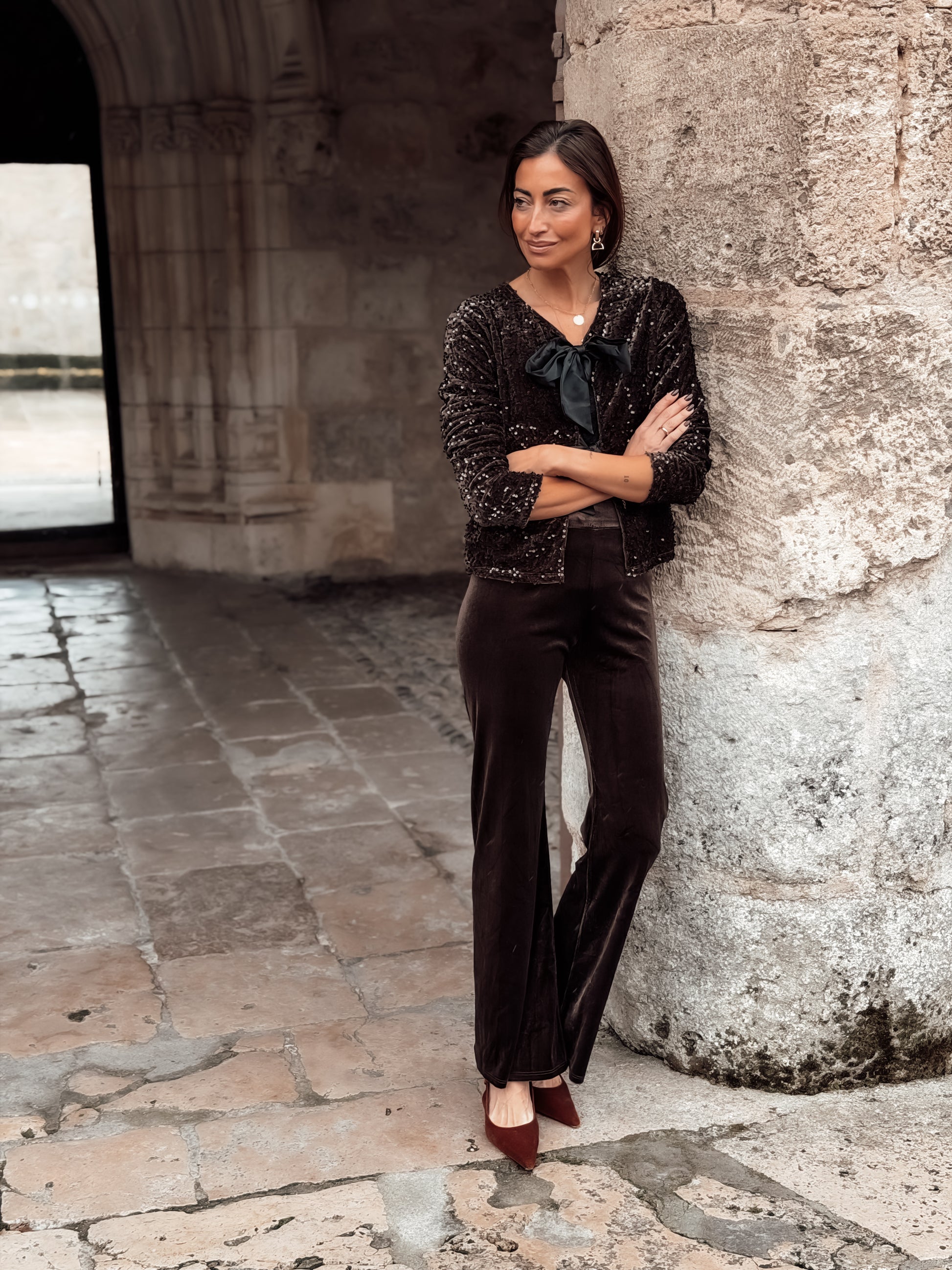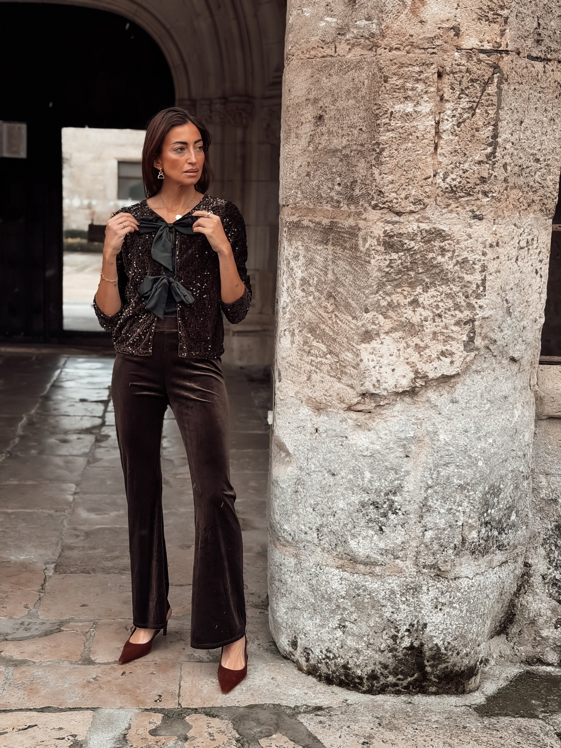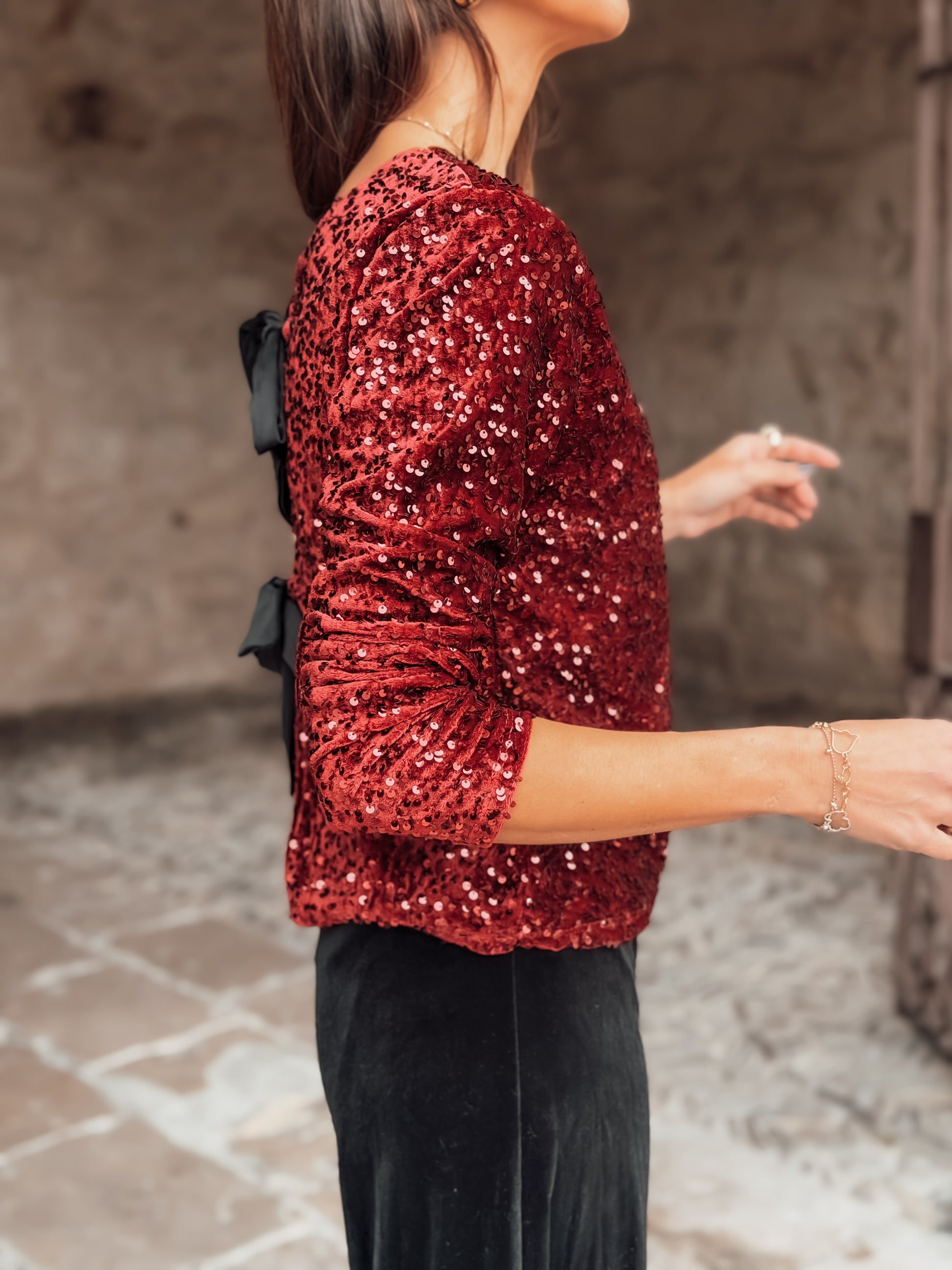 Top de lentejuelas sobre terciopelo con corte de chaqueta y dos lazos de raso como cierre.Se pueden colocar en la parte trasera o frontal .