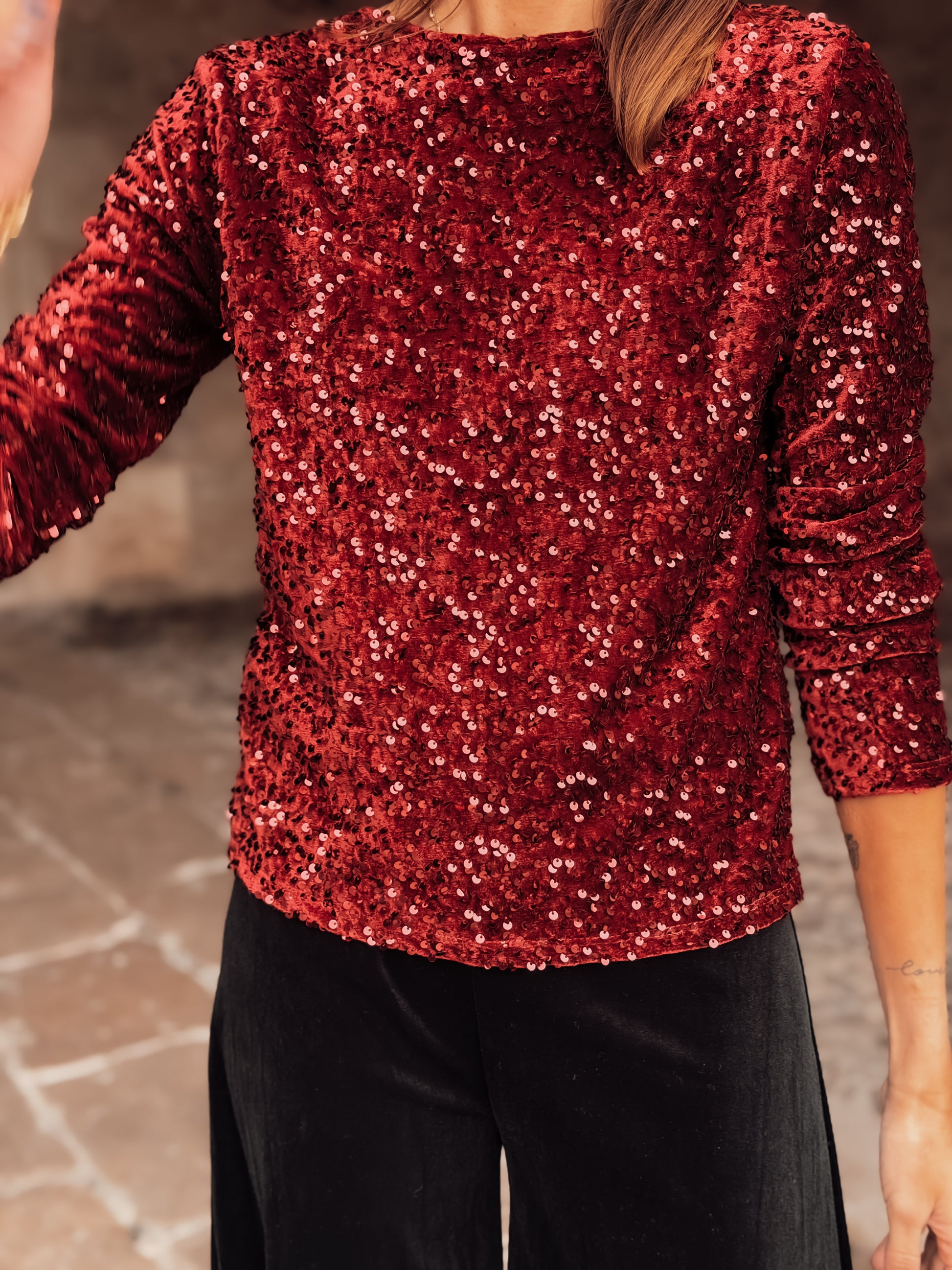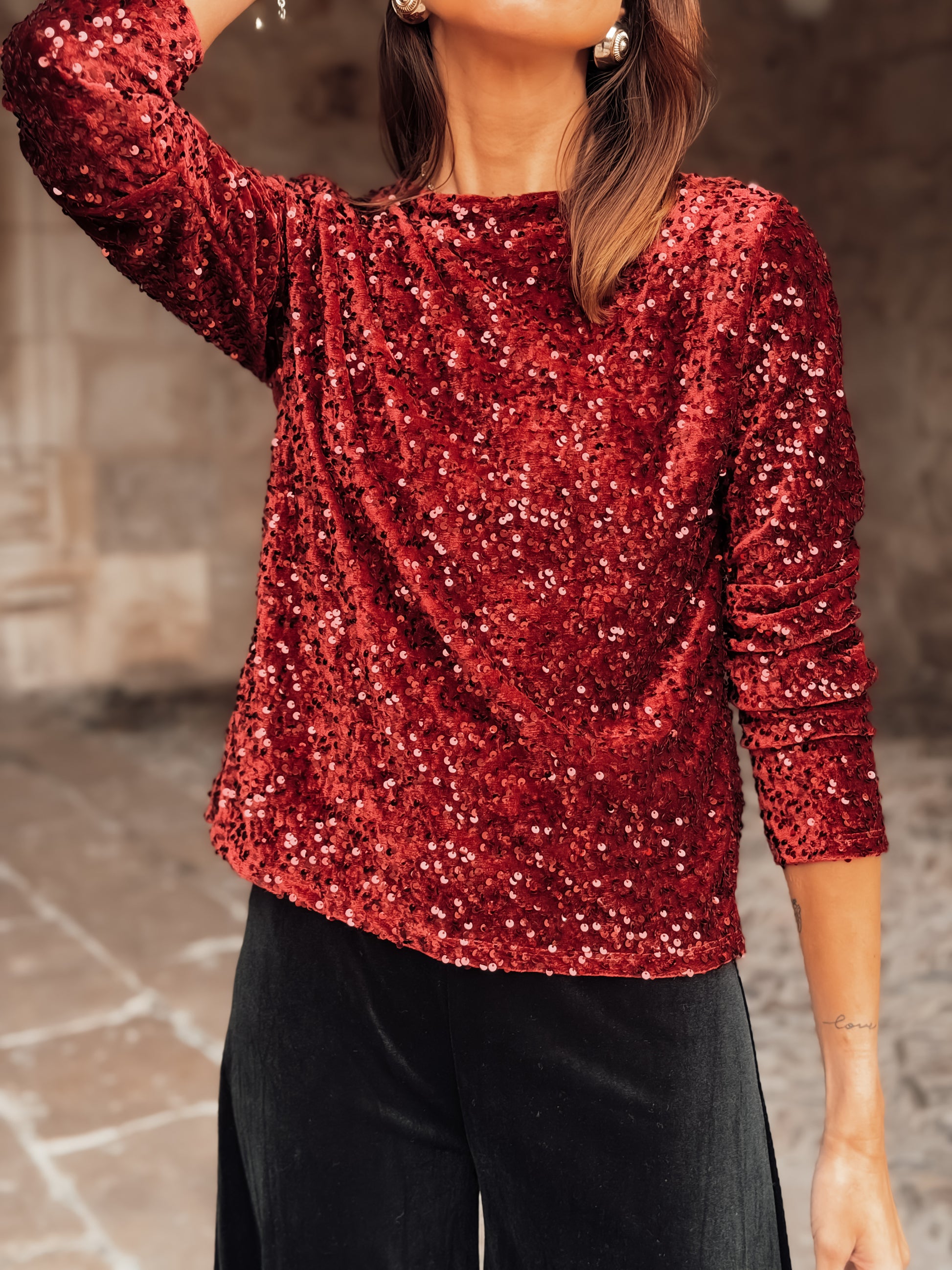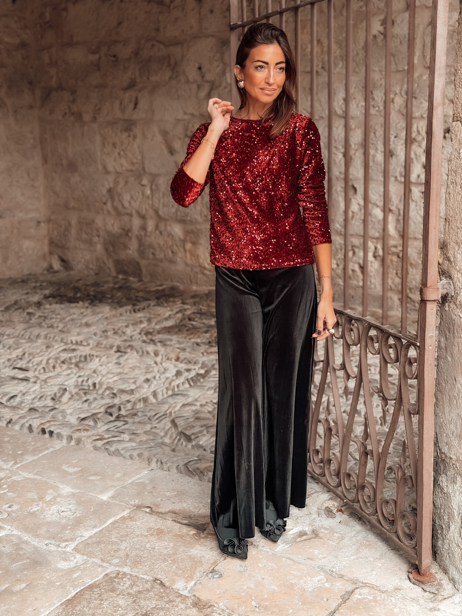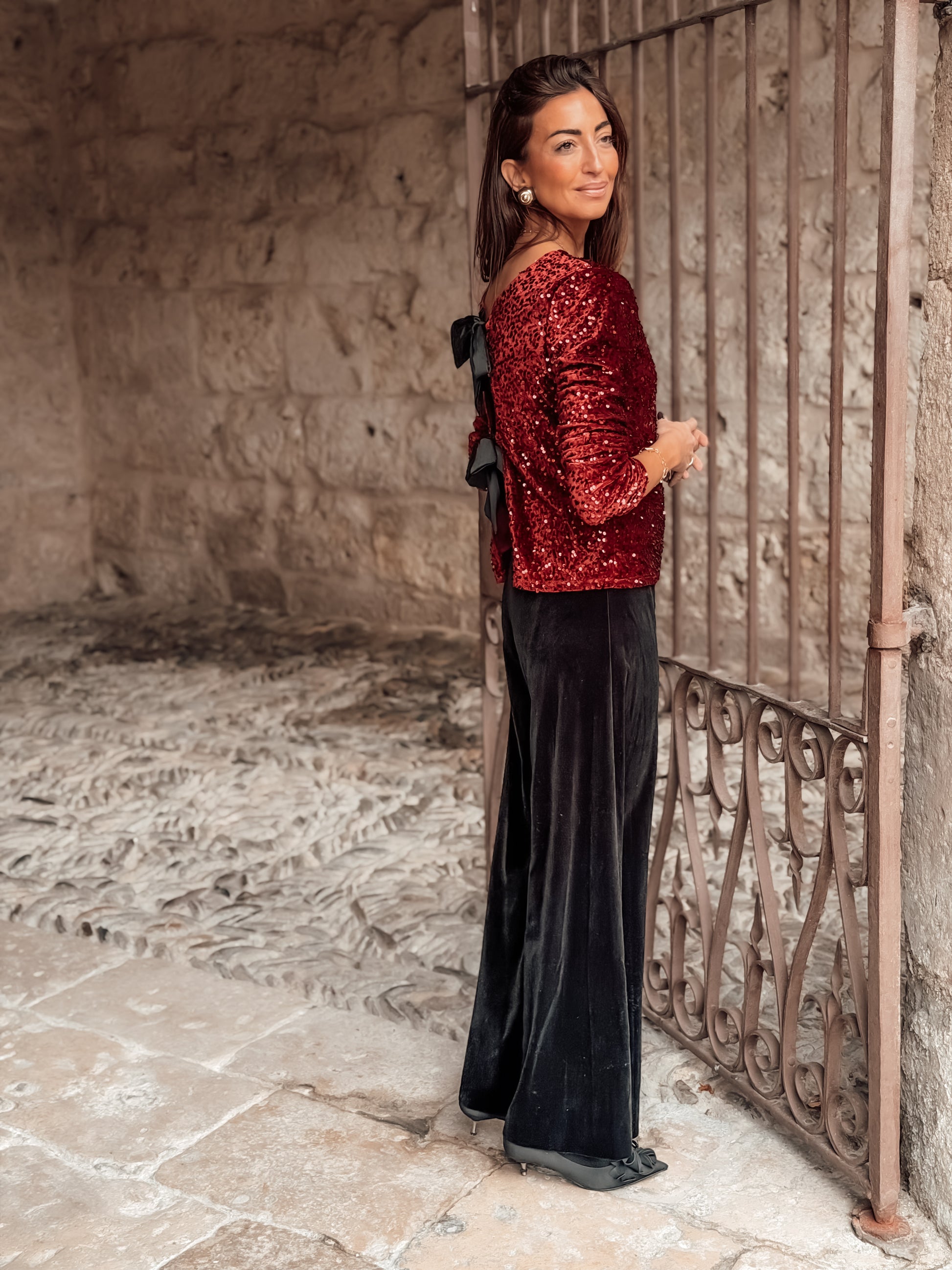 Top de lentejuelas sobre terciopelo con corte de chaqueta y dos lazos de raso como cierre.Se pueden colocar en la parte trasera o frontal .