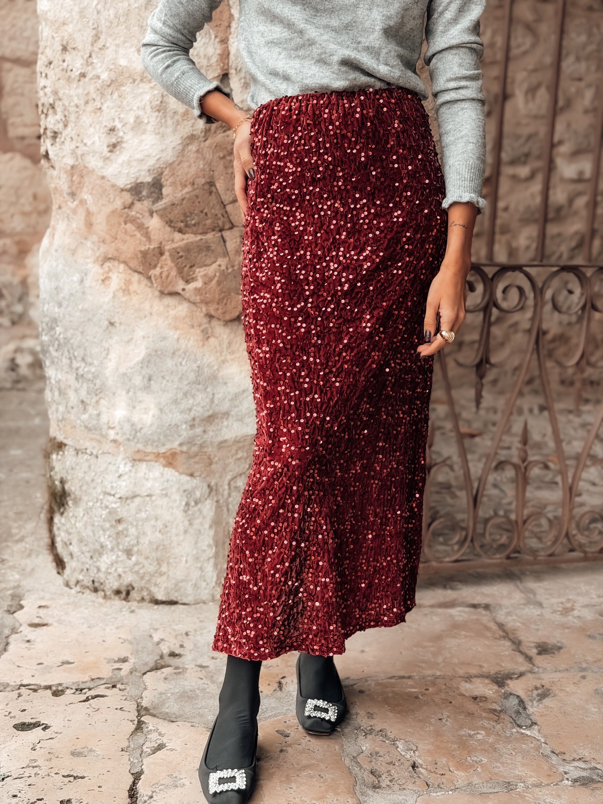 Falda de lentejuelas sobre tejido de terciopelo midi de corte recto, cintura elástica y abertura trasera.