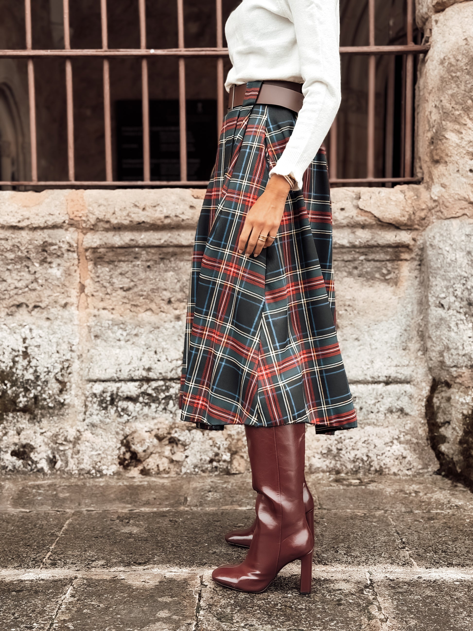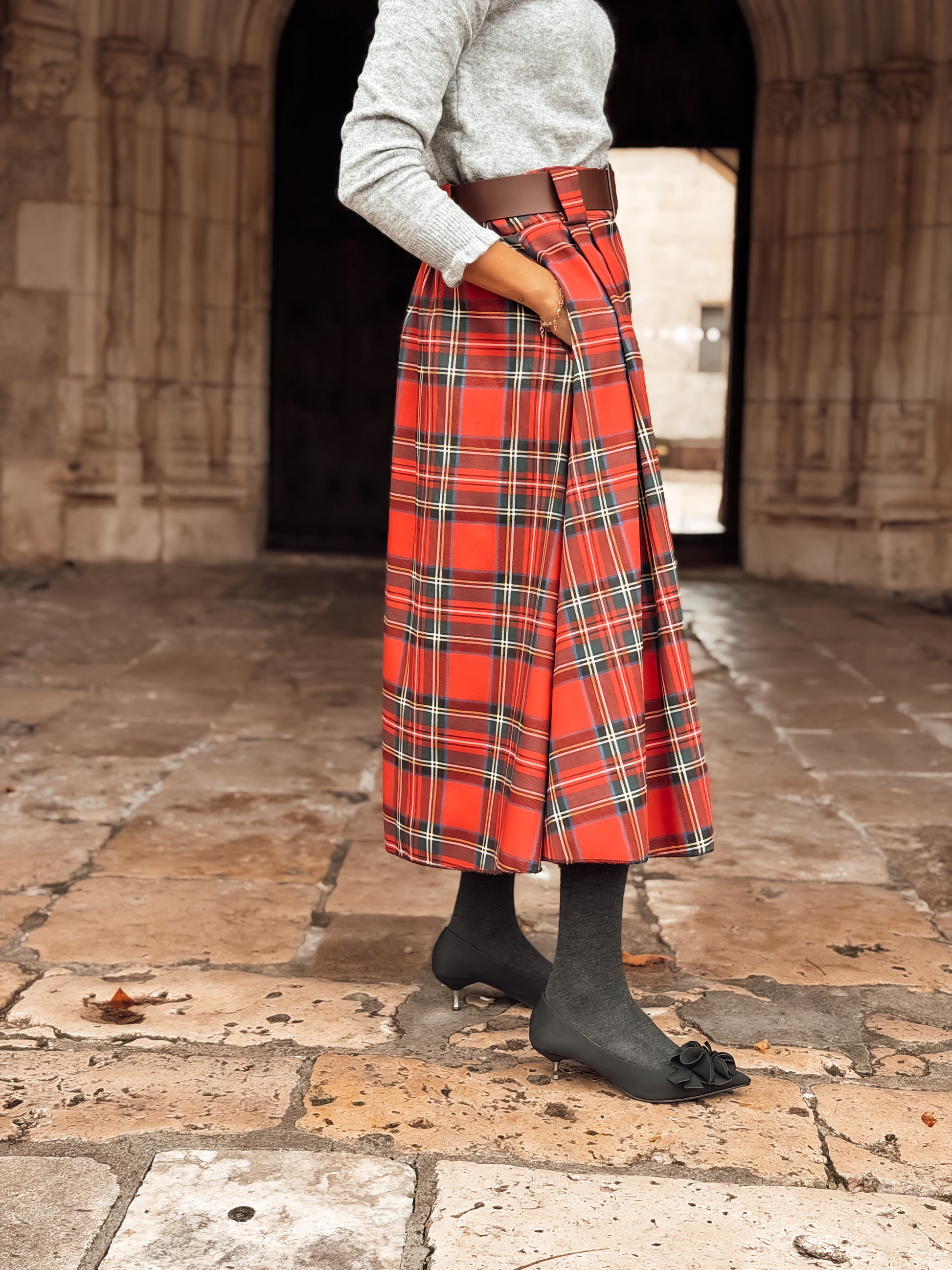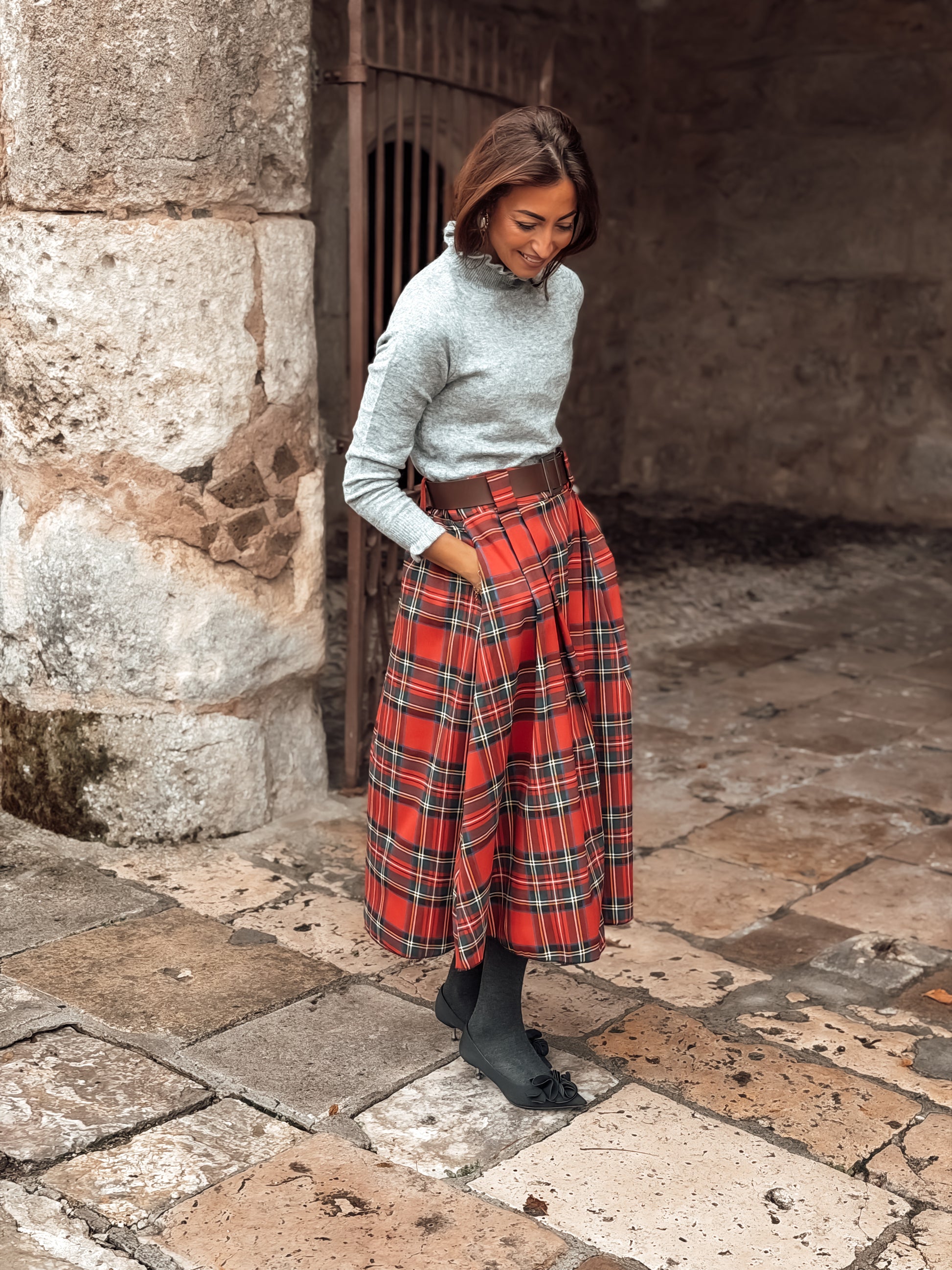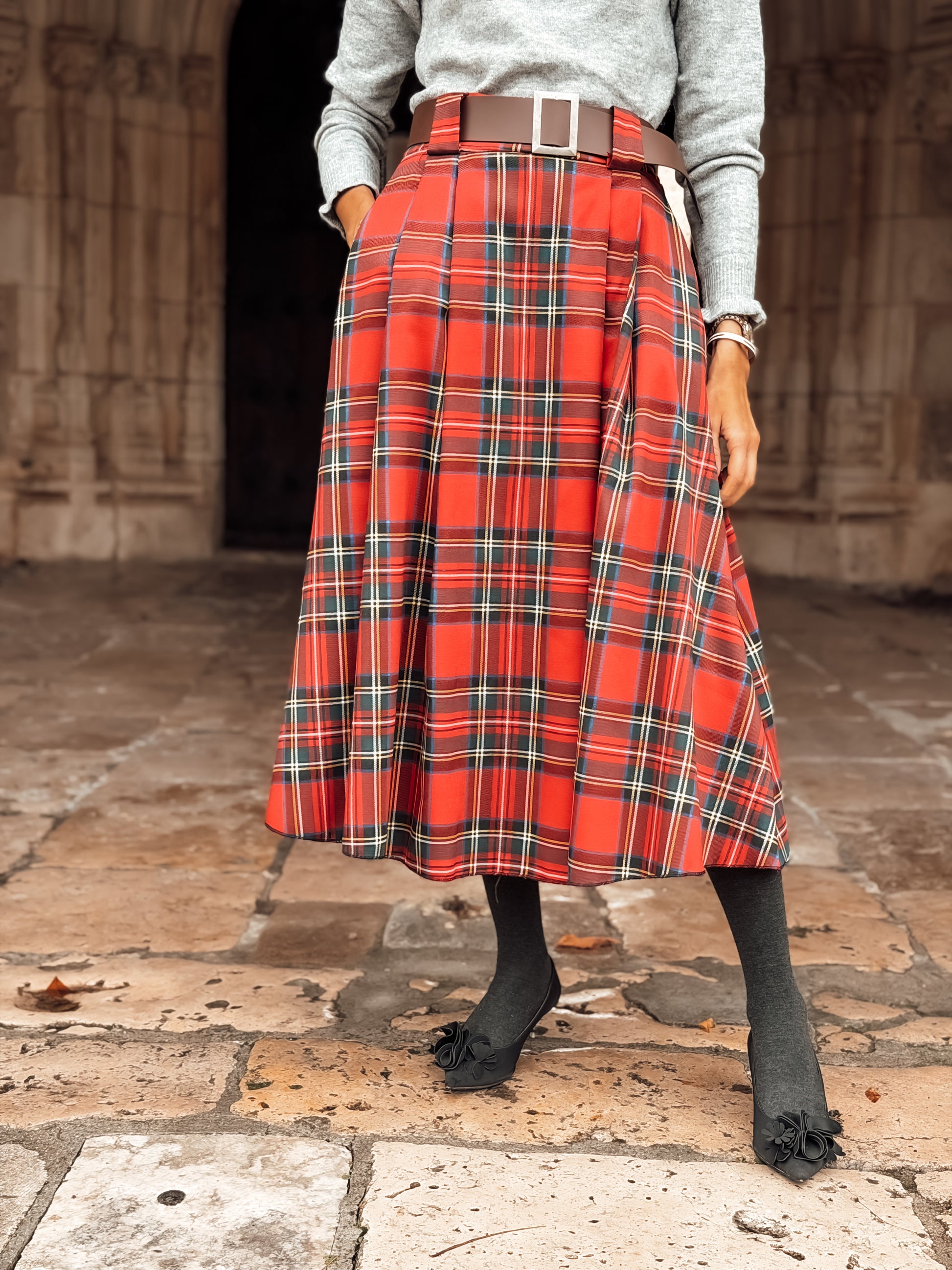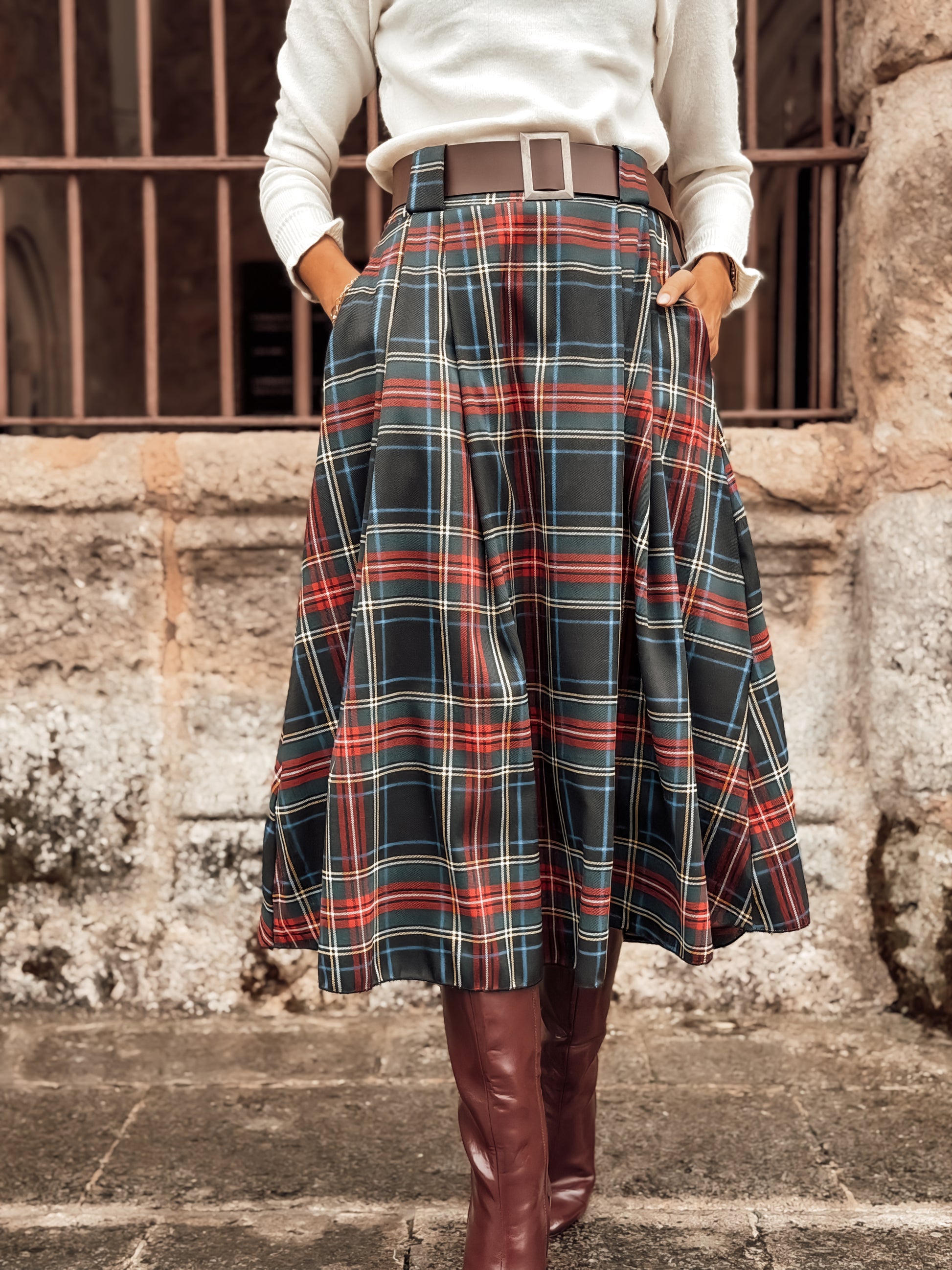 Falda midi en tejido tartán .Con vuelo y corte evasé.Bolsillos laterales. Cintura elástica en la parte trasera.Dos colores negro o rojo .