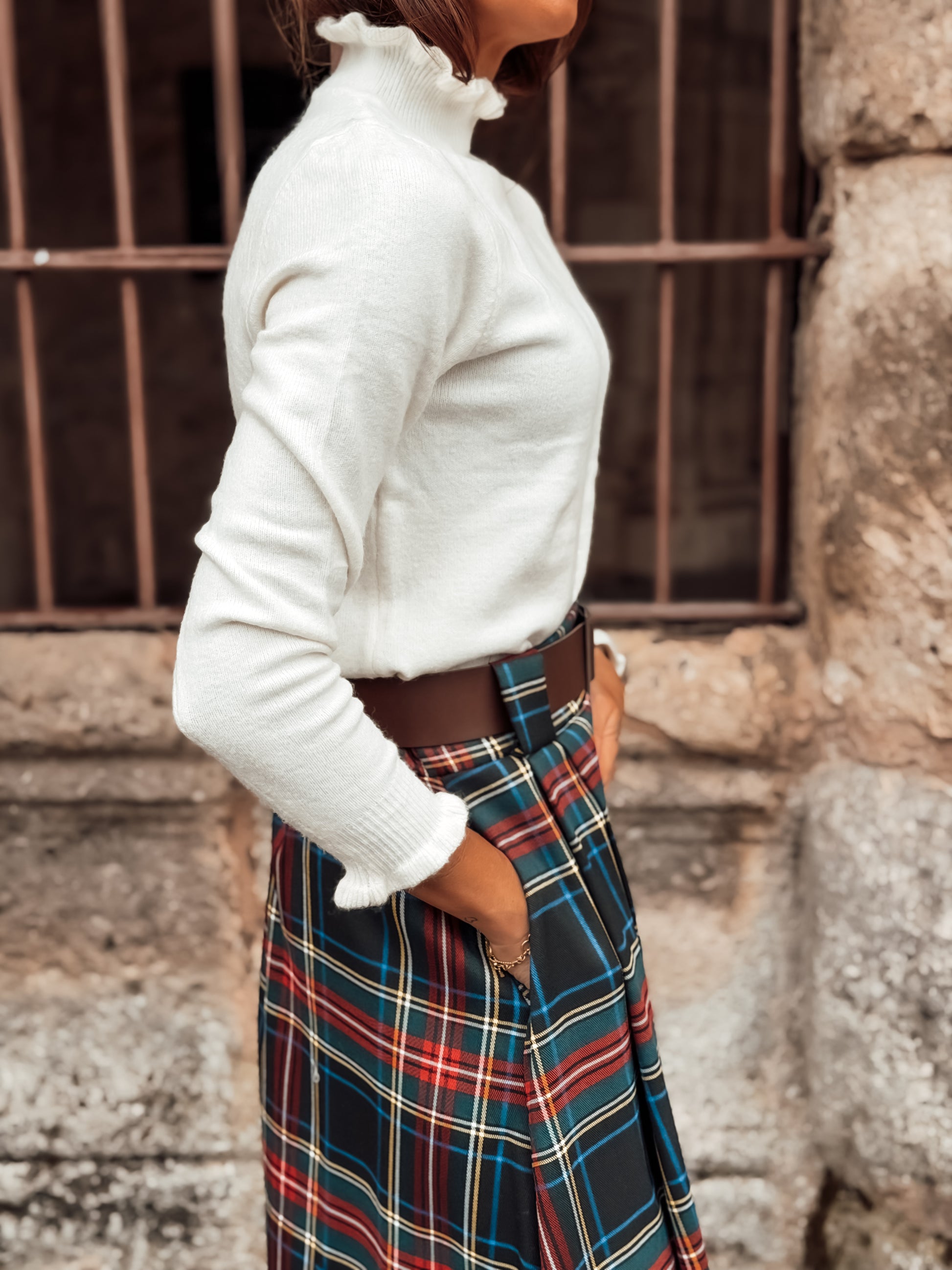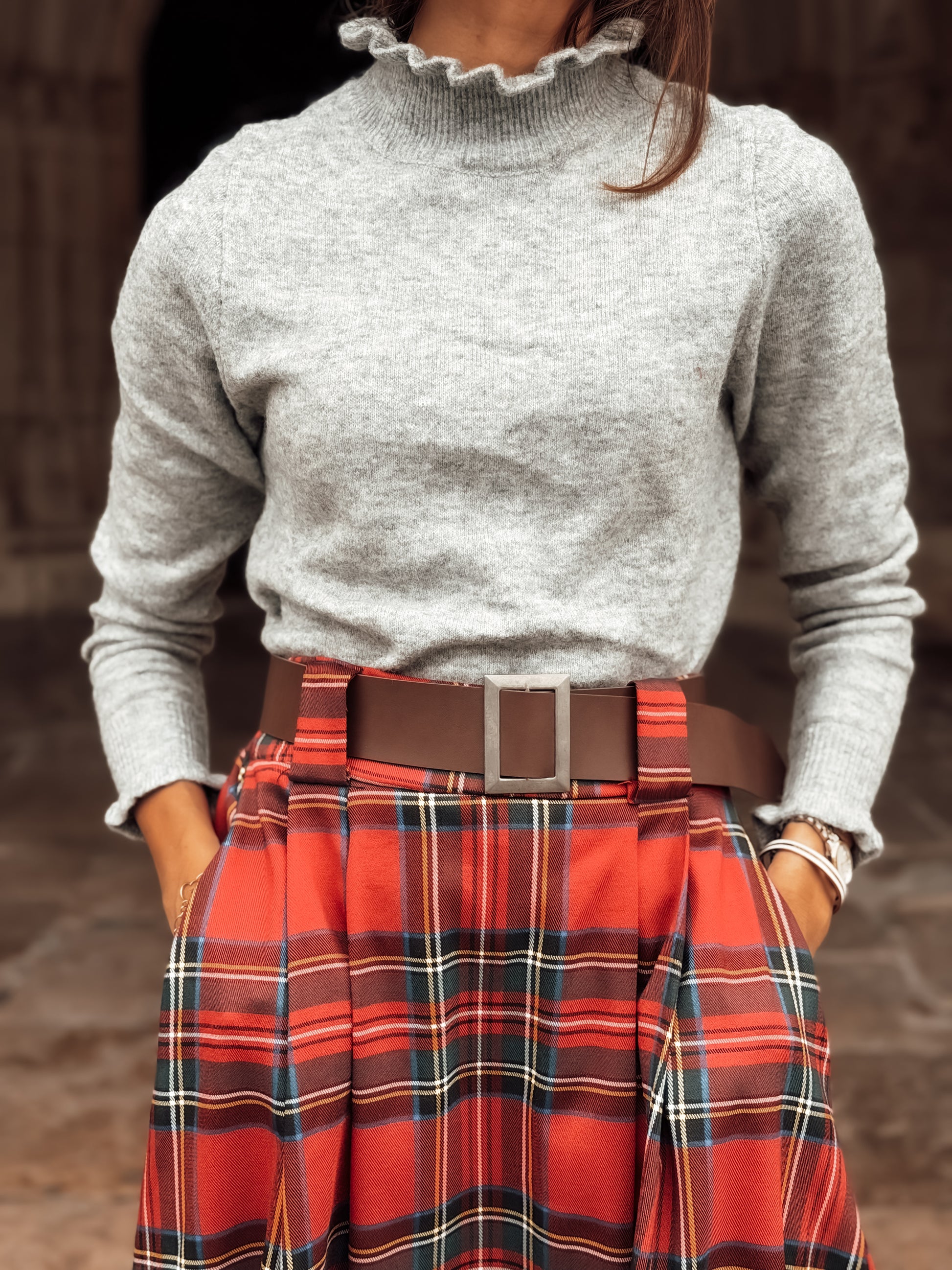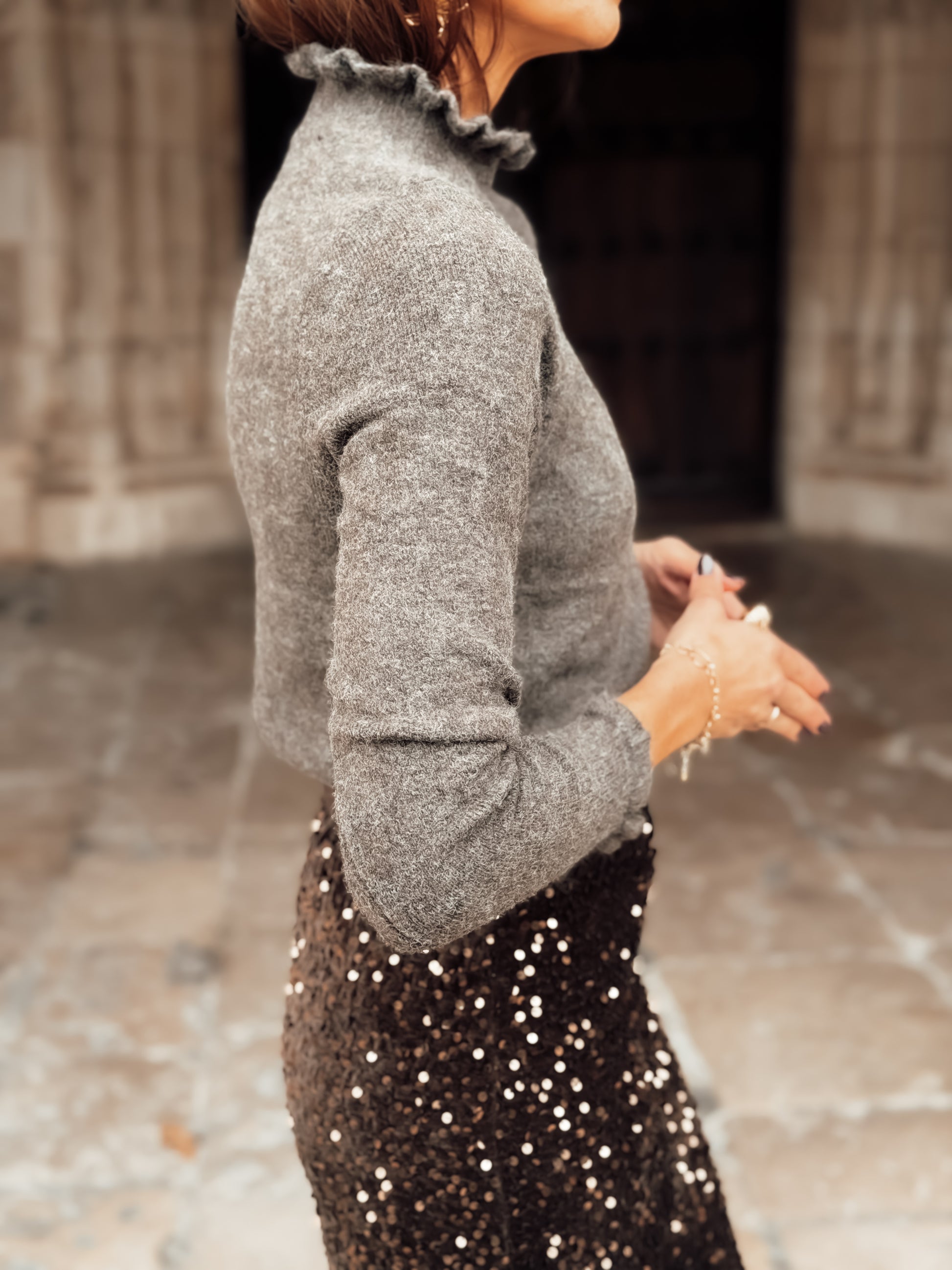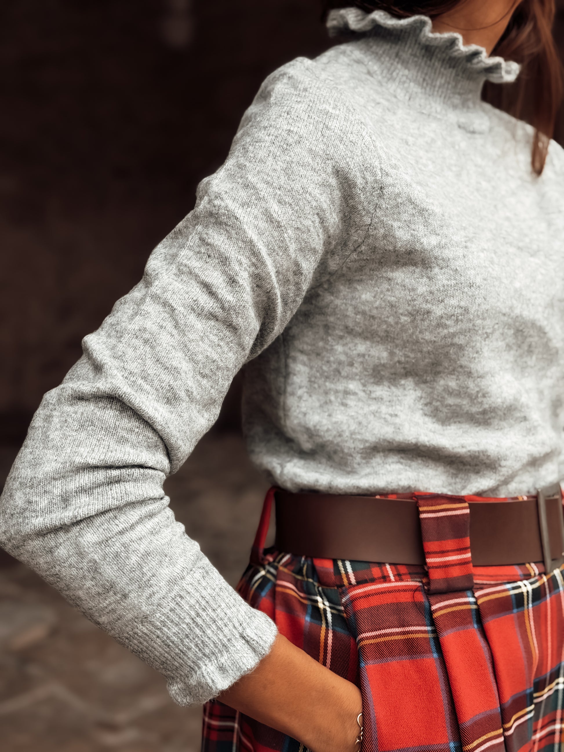 Jersey punto cuello alto con detalle de ondas en cuello y mangas .Dos tonos gris, crudo, burgundy, marrón .