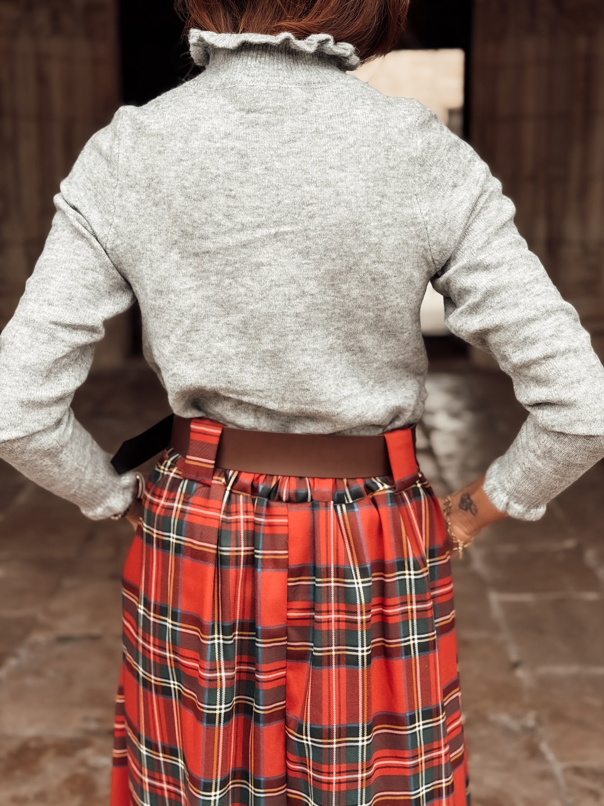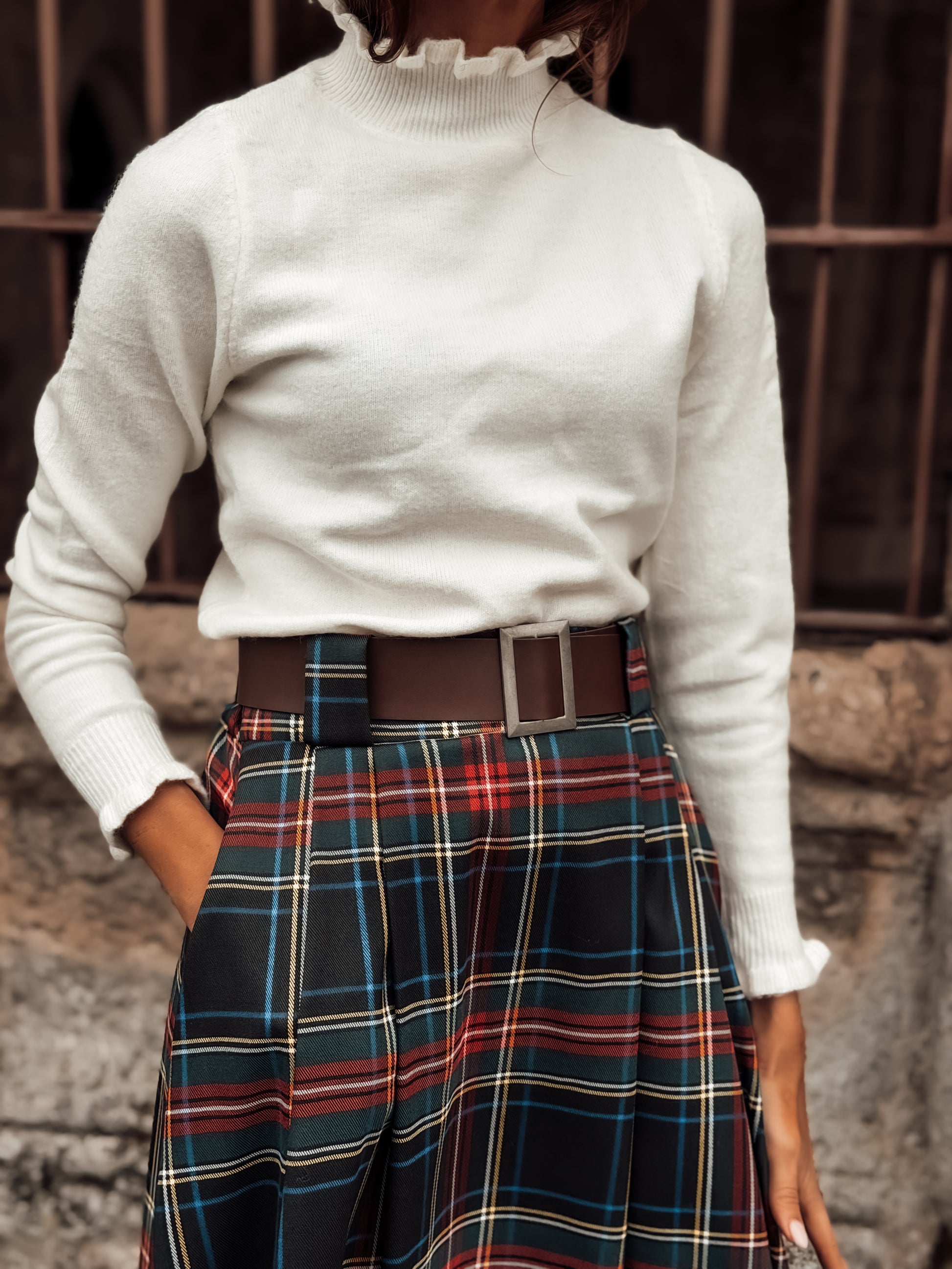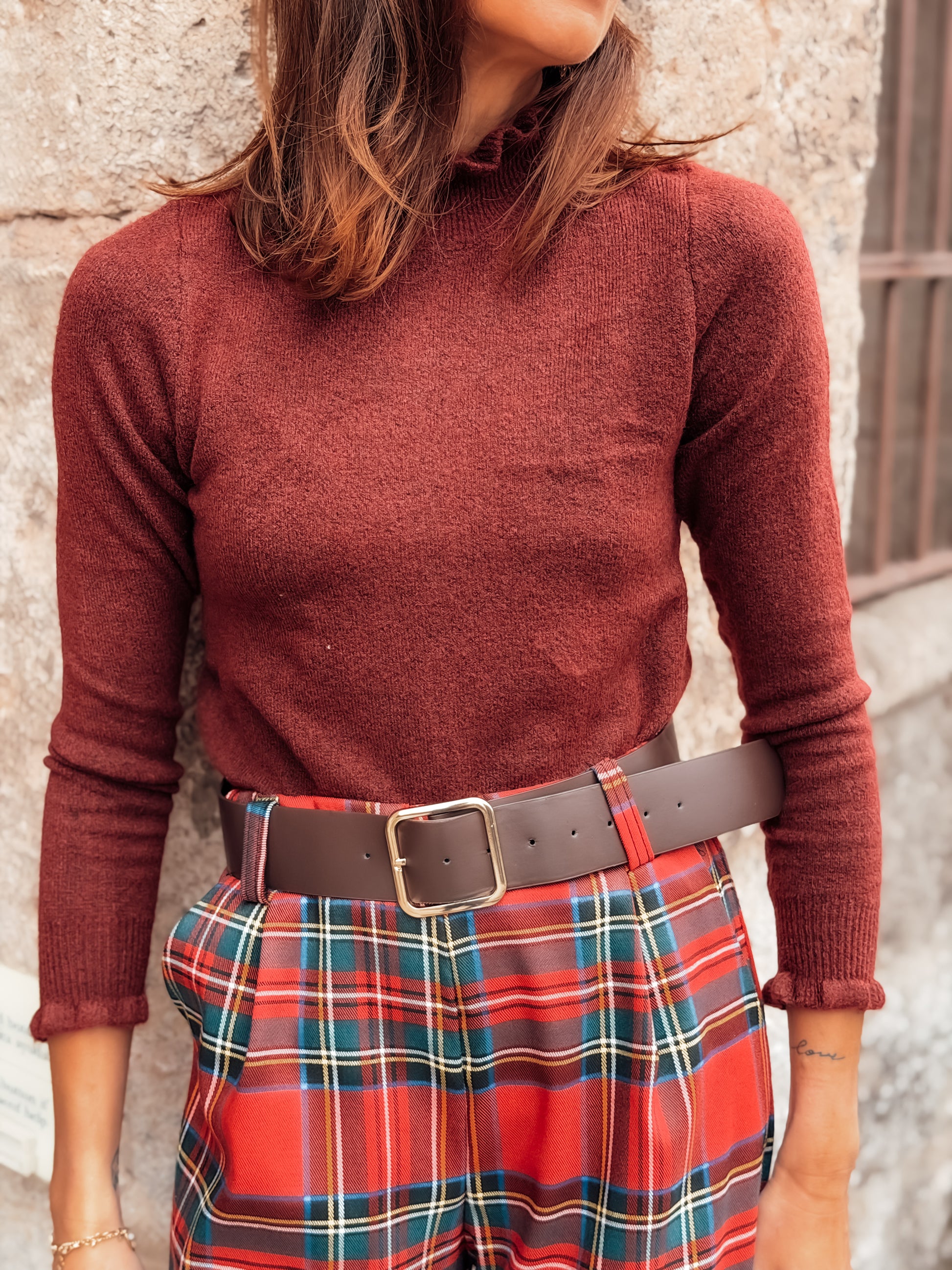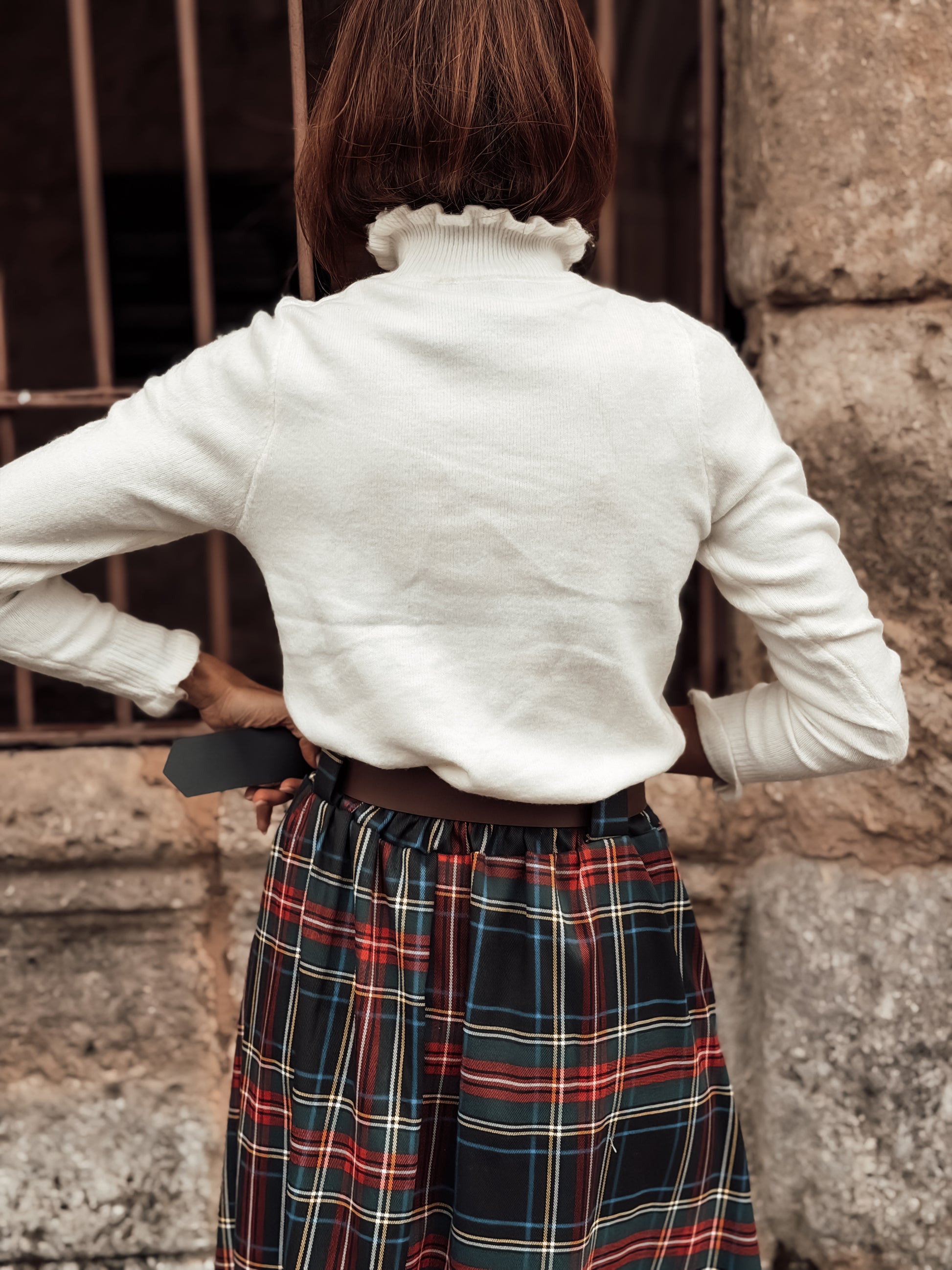 Jersey punto cuello alto con detalle de ondas en cuello y mangas .Dos tonos gris, crudo, burgundy, marrón .
