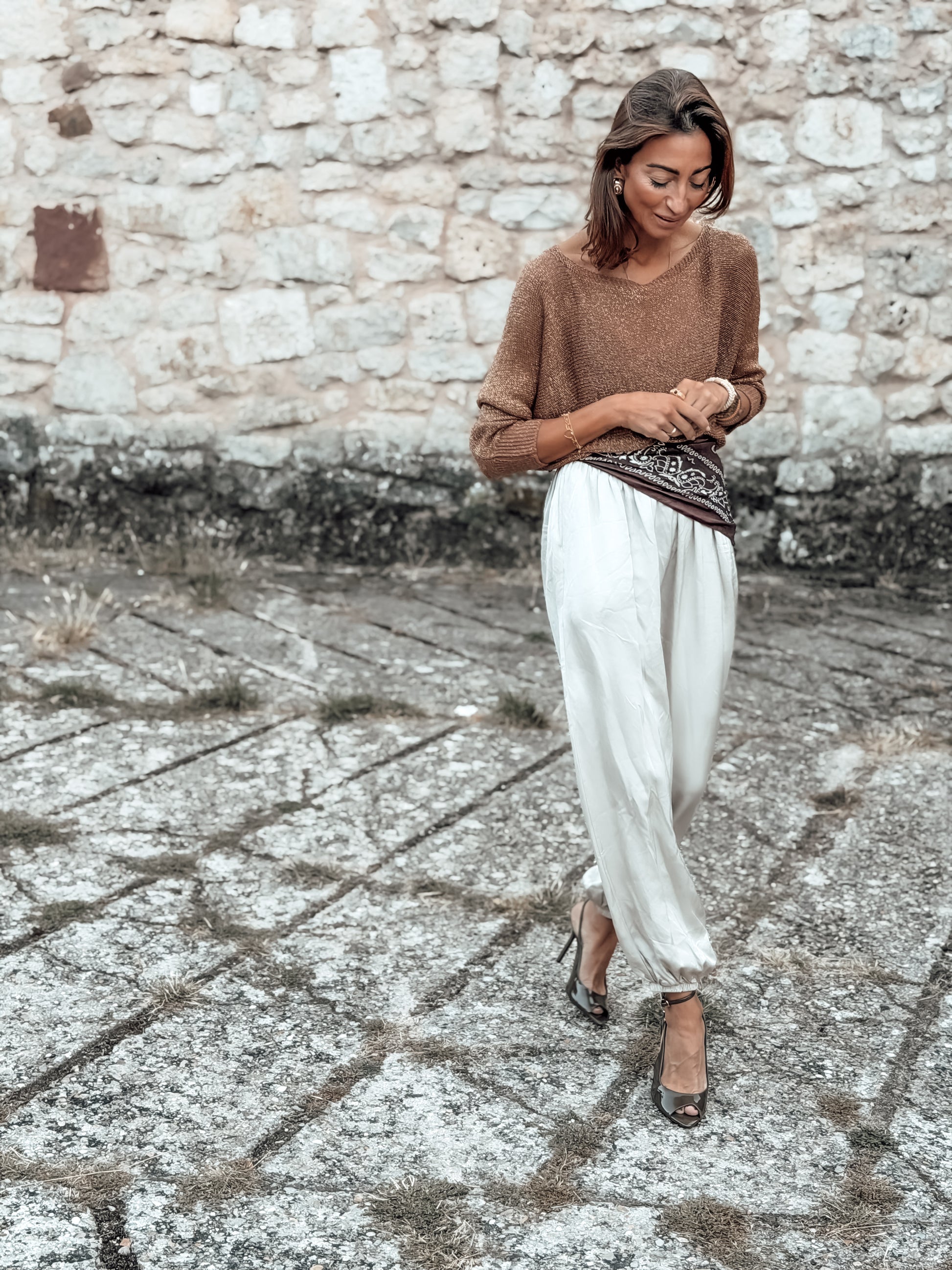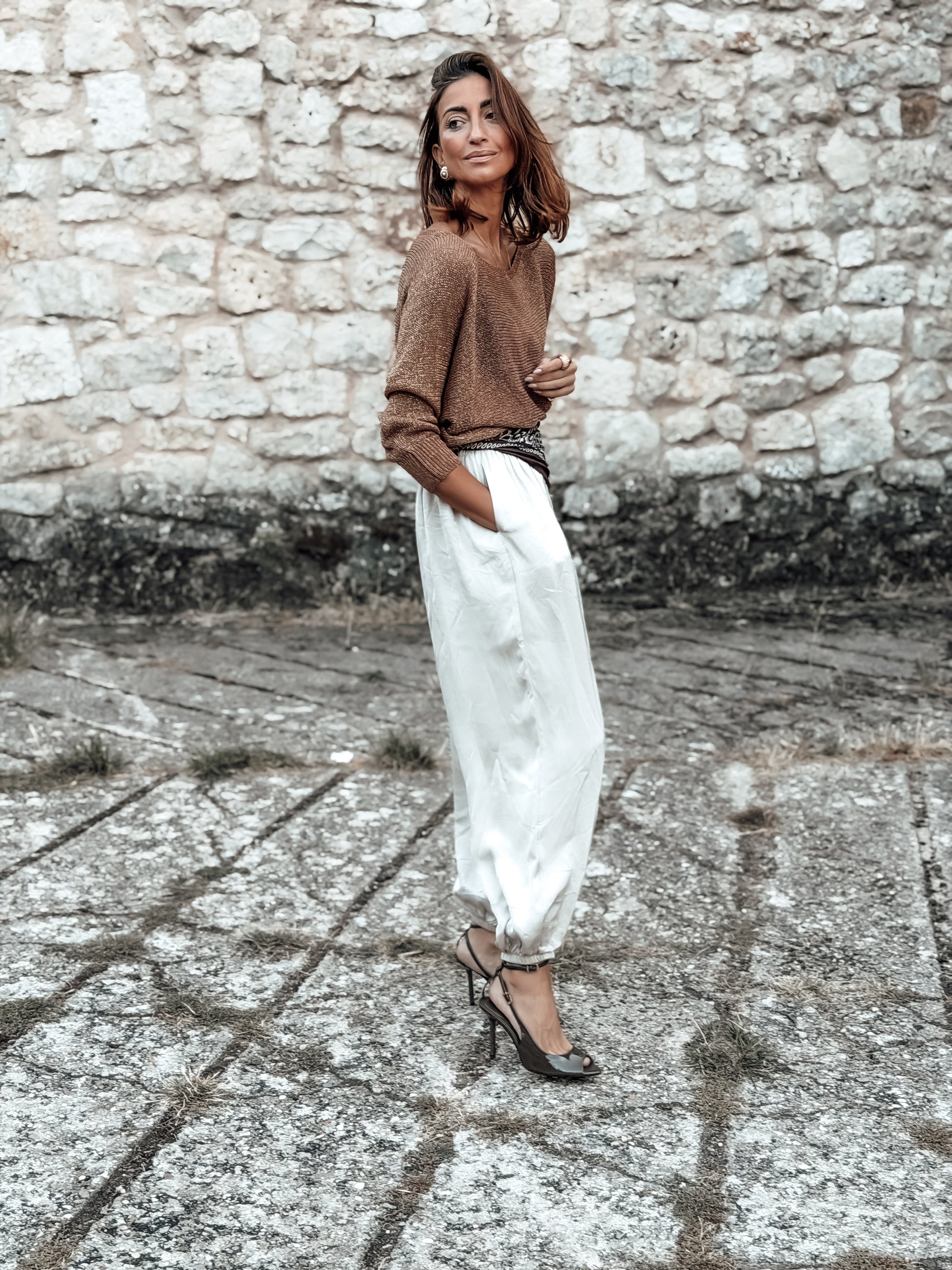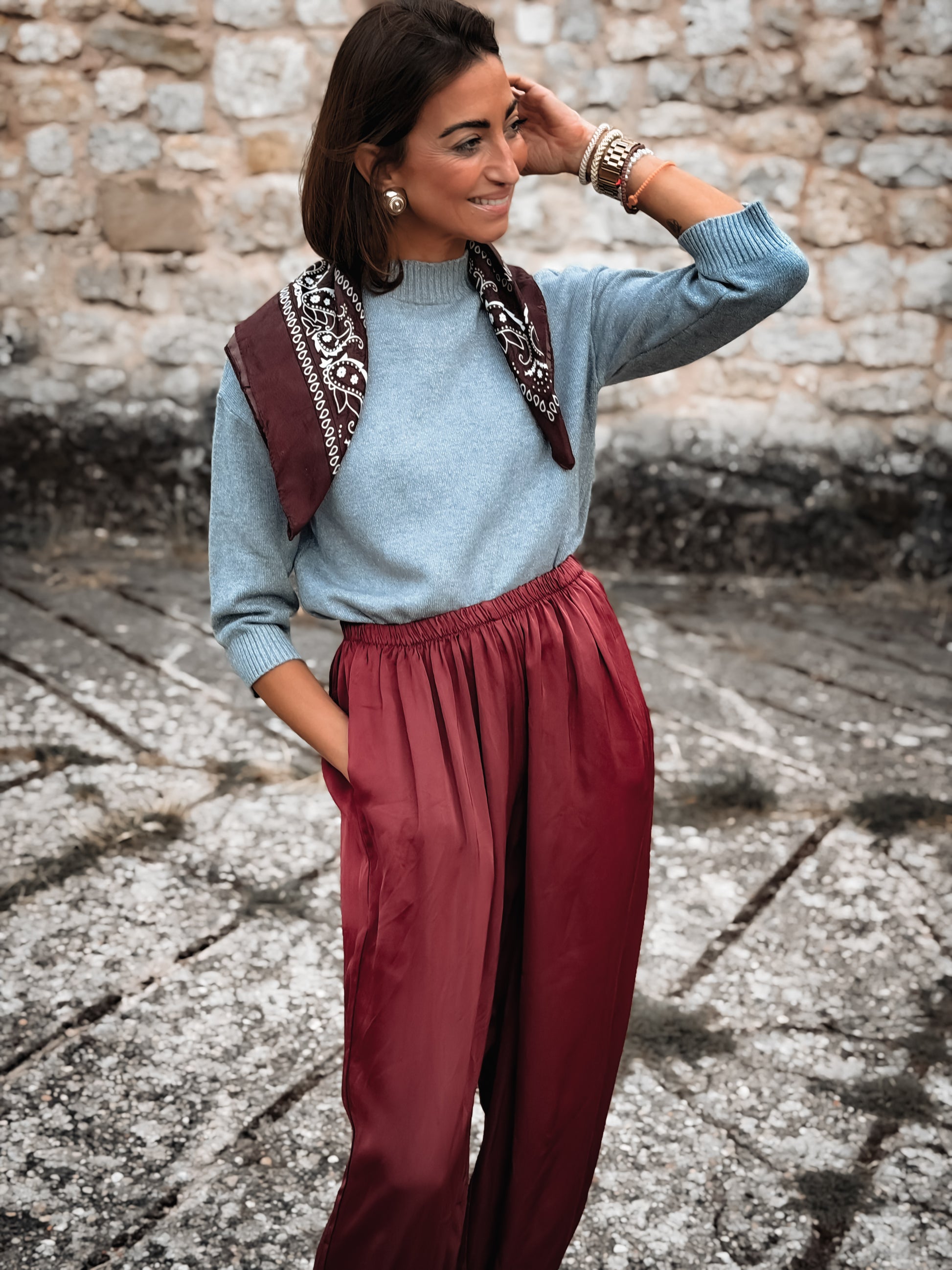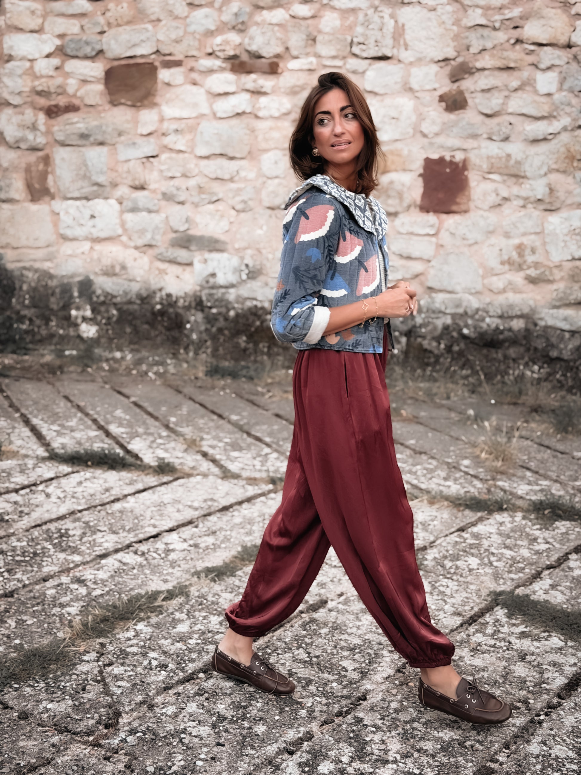 Pantalón bombacho satinado, disponible en burdeos, beige y marrón.