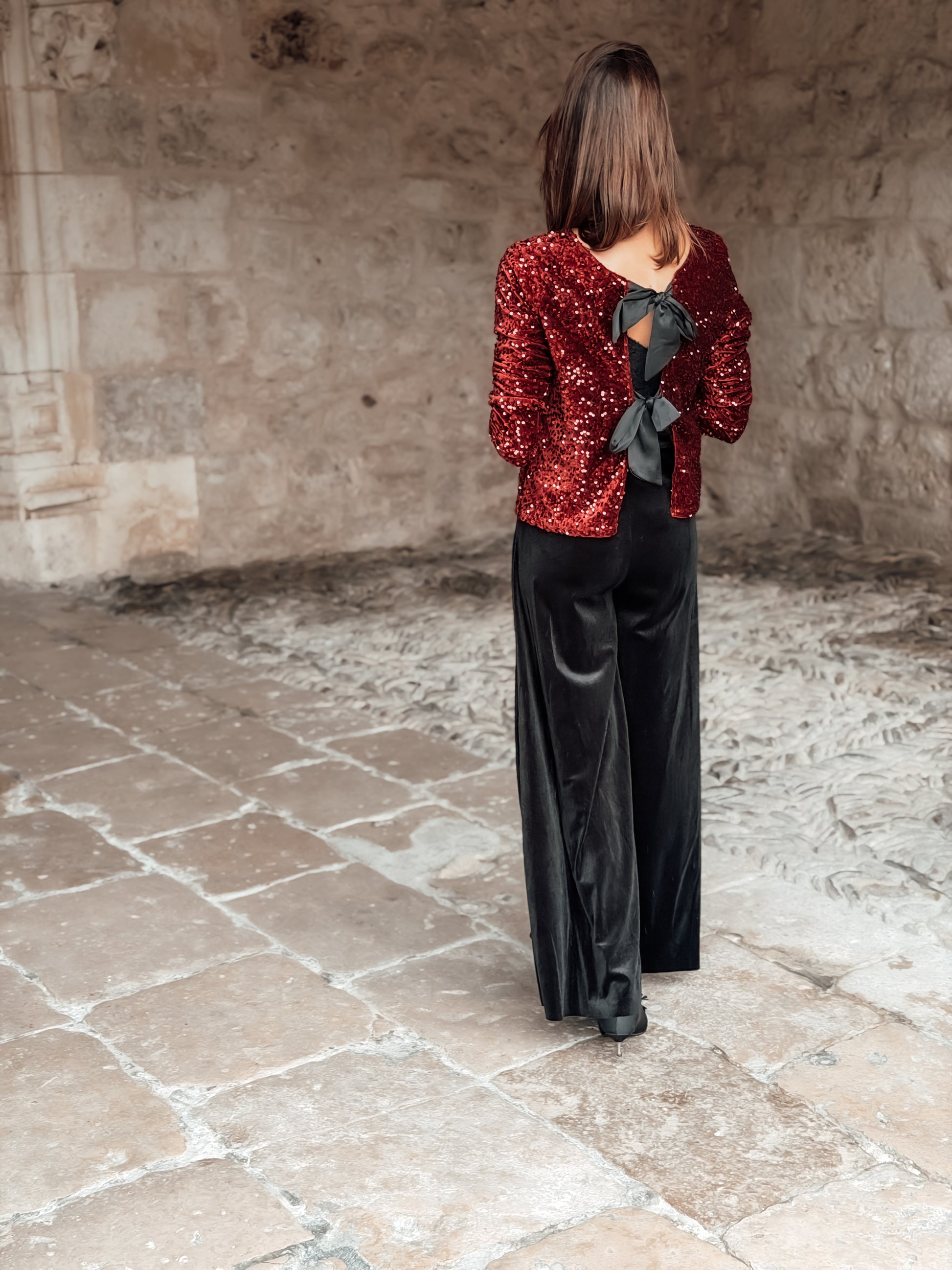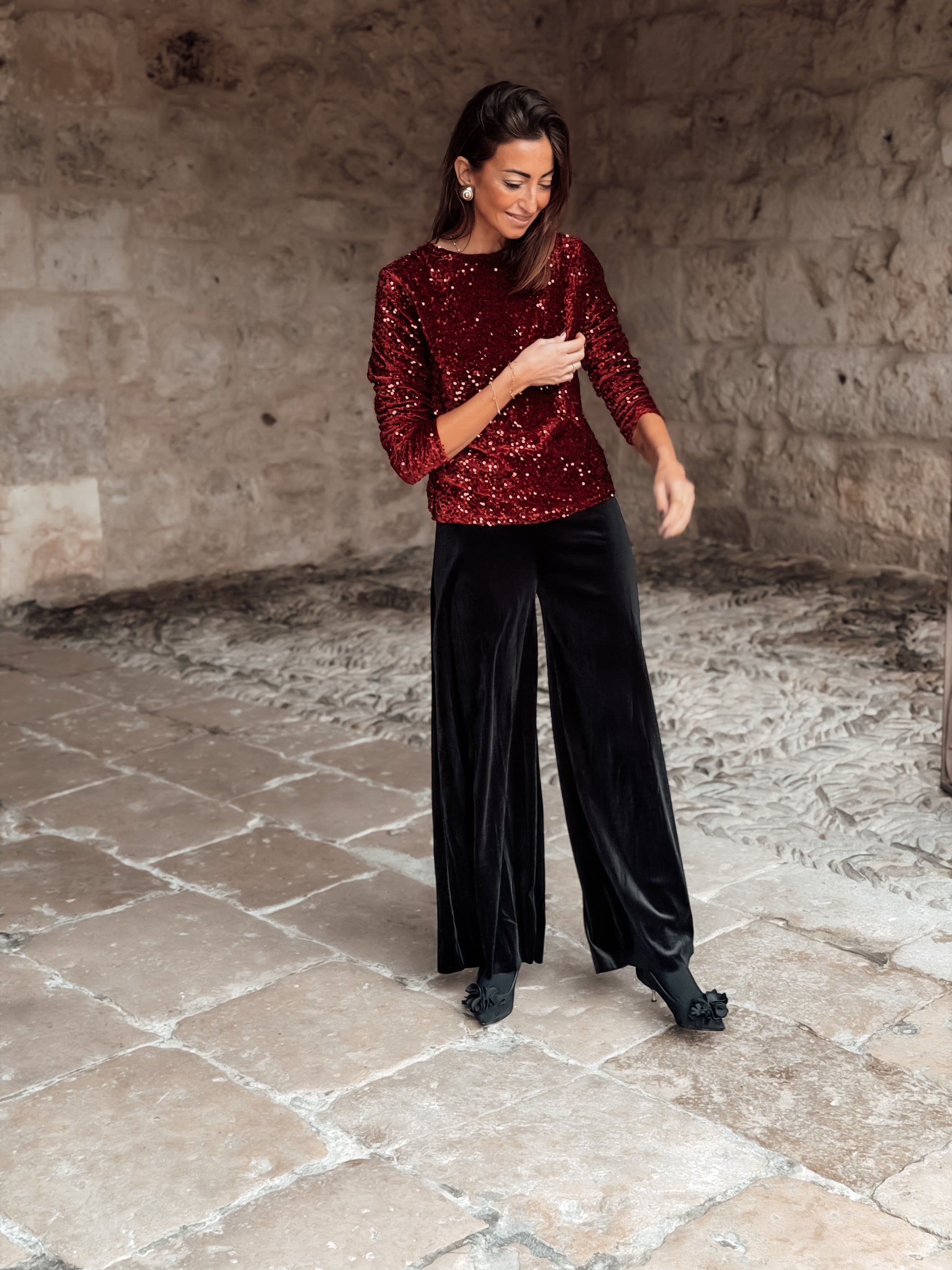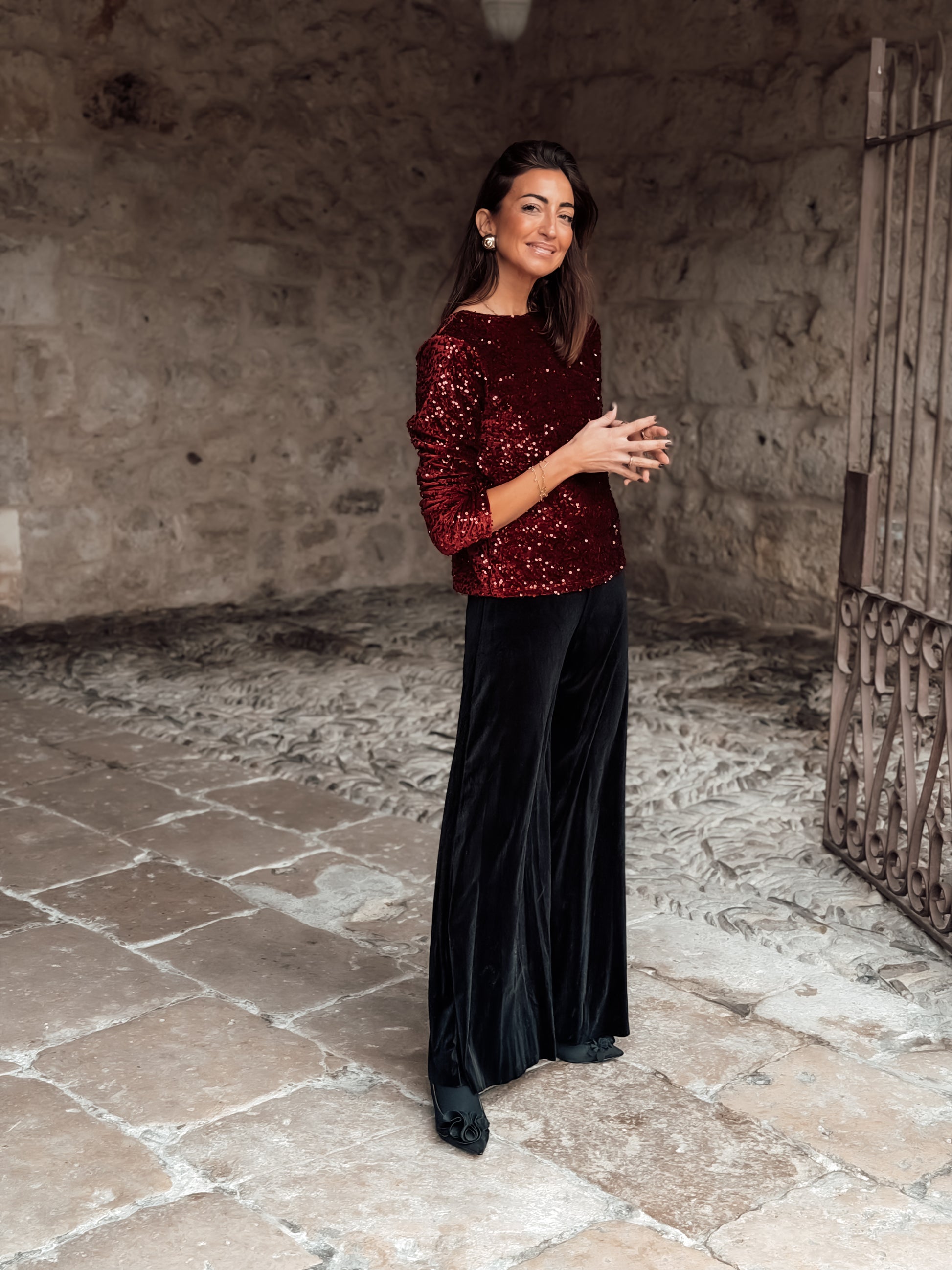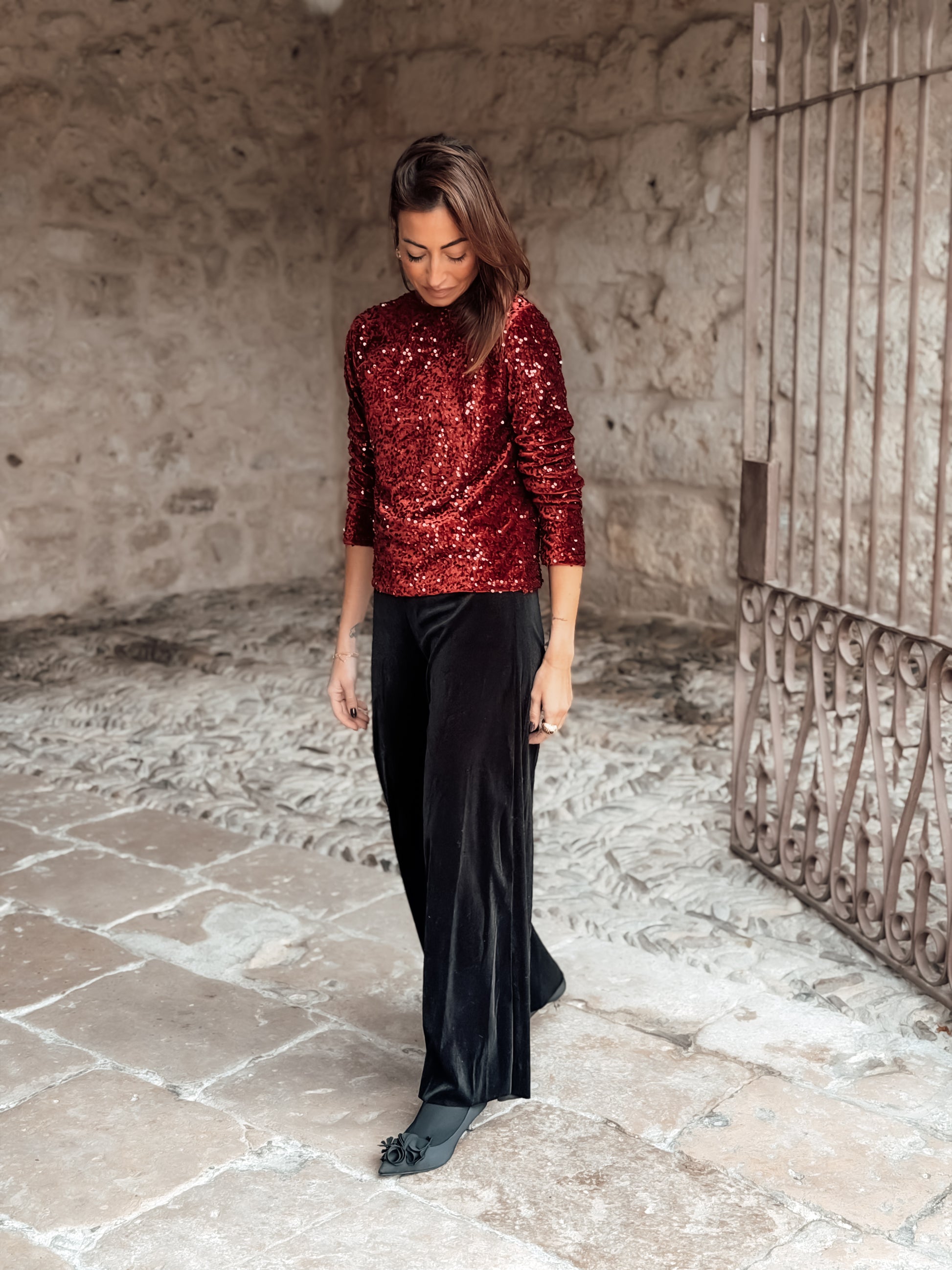 Pantalón de terciopelo de corte recto y tiro alto .Cintura elástica.Dos tonos : negro y chocolate .