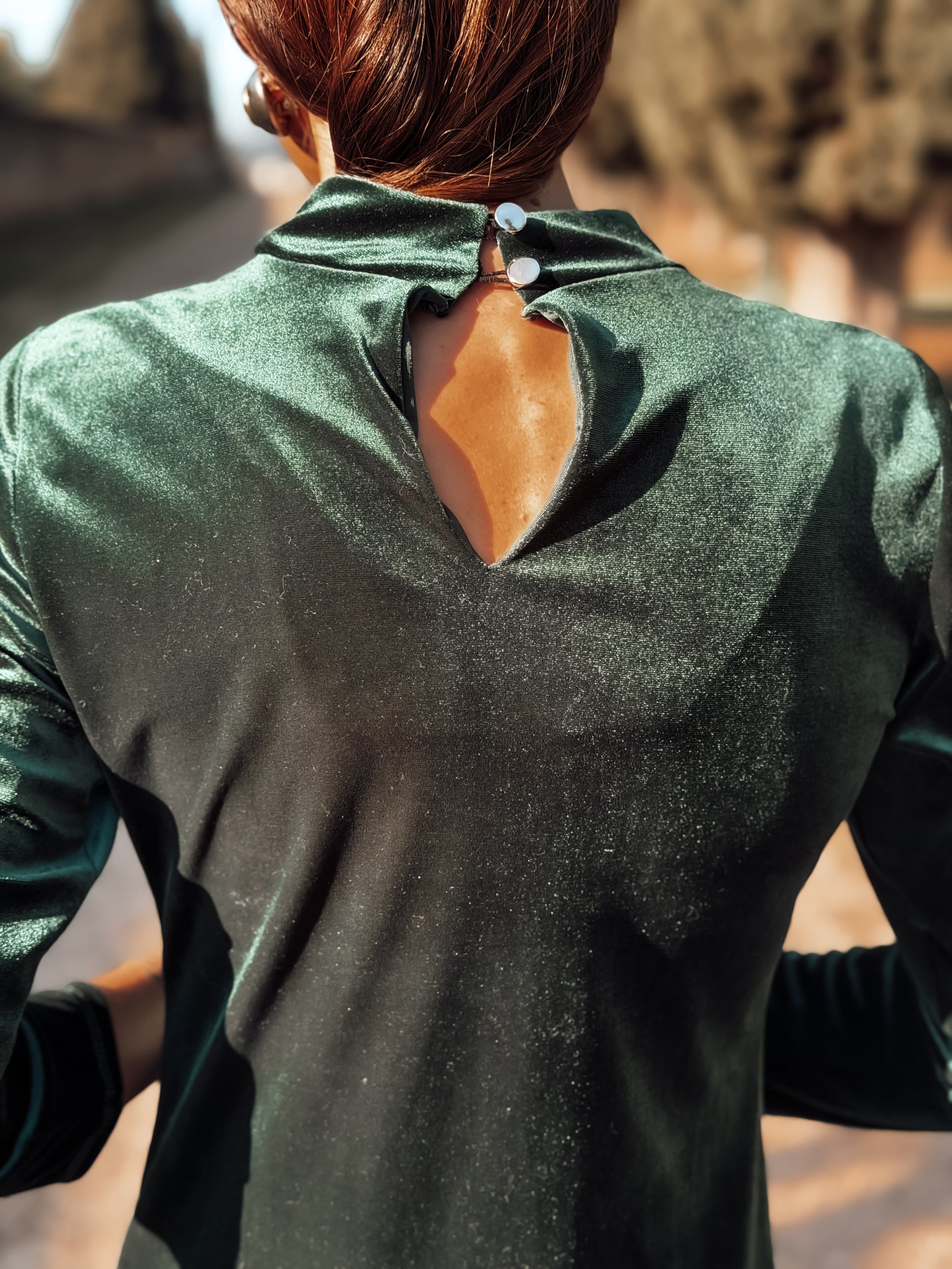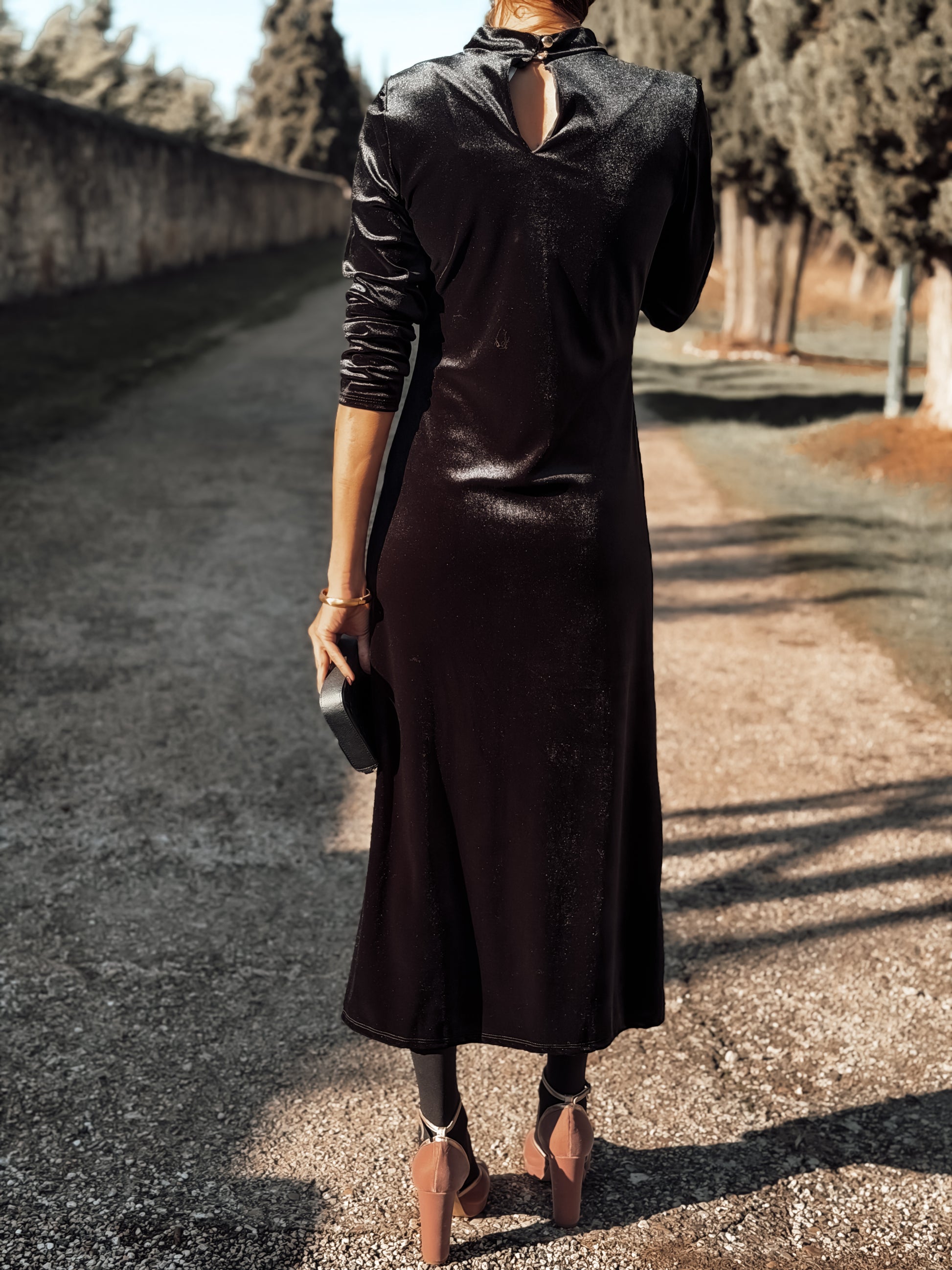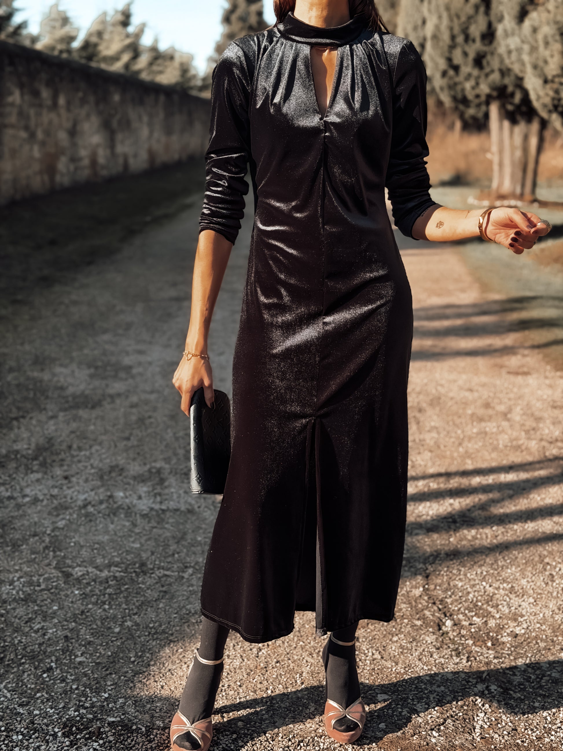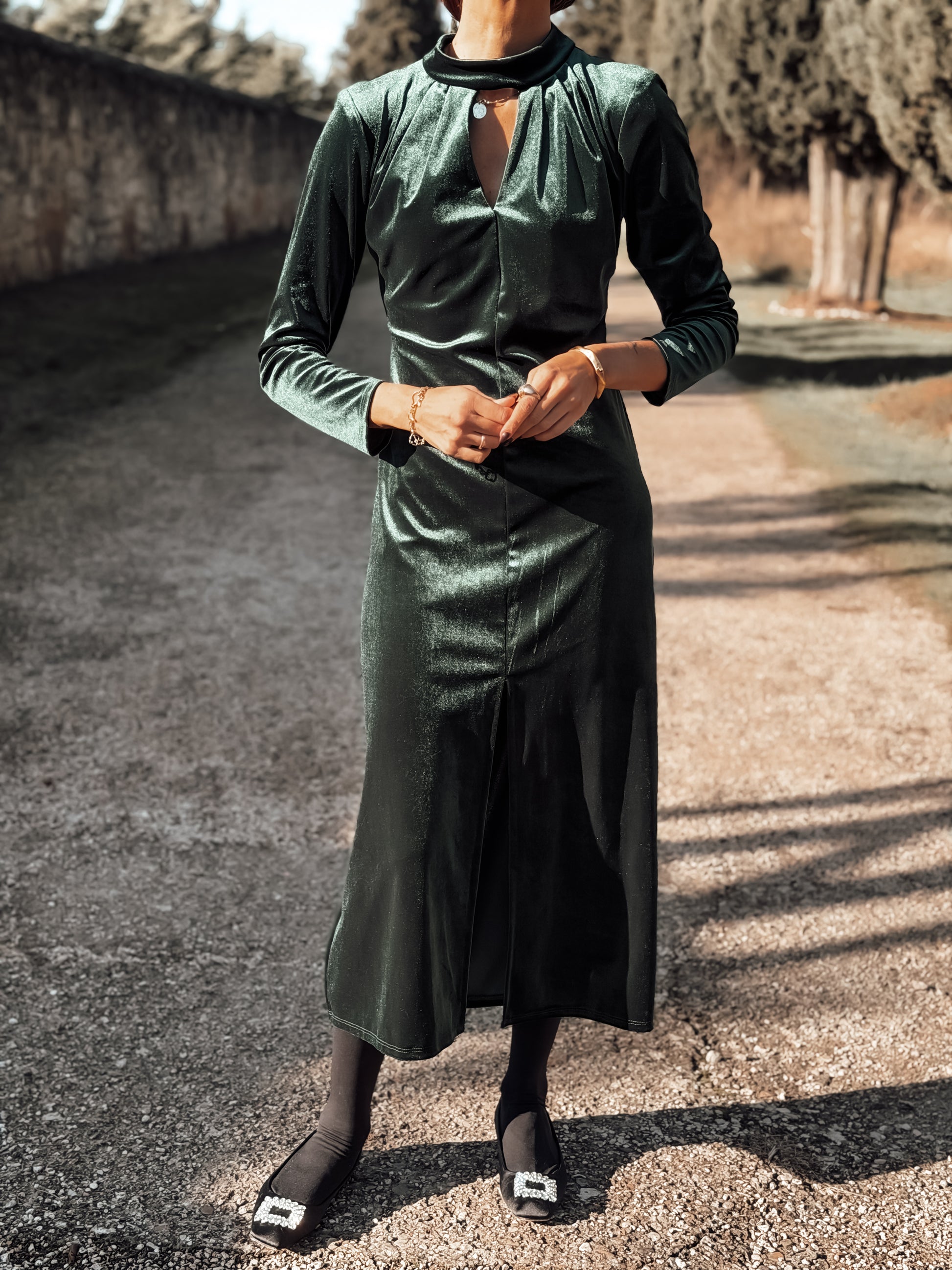Vestido de terciopelo largo de corte entallado . Escote frontal , cierre mediante botones en la parte trasera del cuello.Dos colores negro y verde .Abertura trasera en la parte de la falda.Lleva hombreras para darle un poco más de volumen.