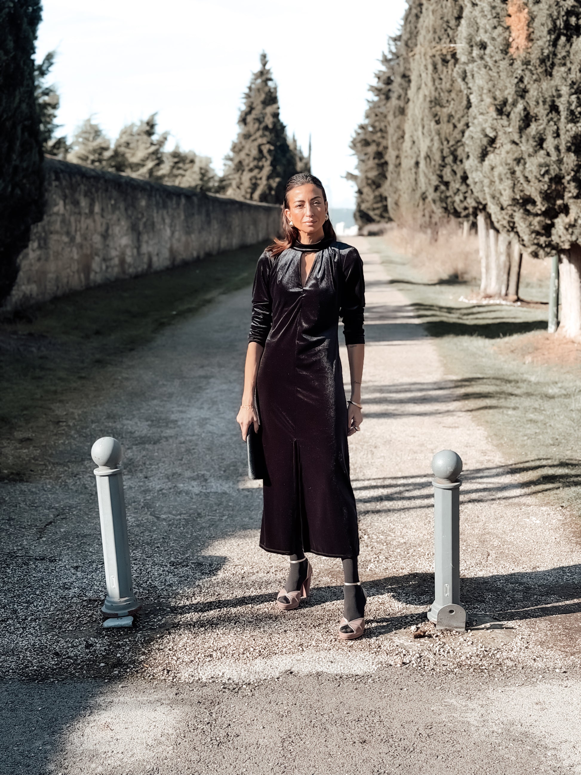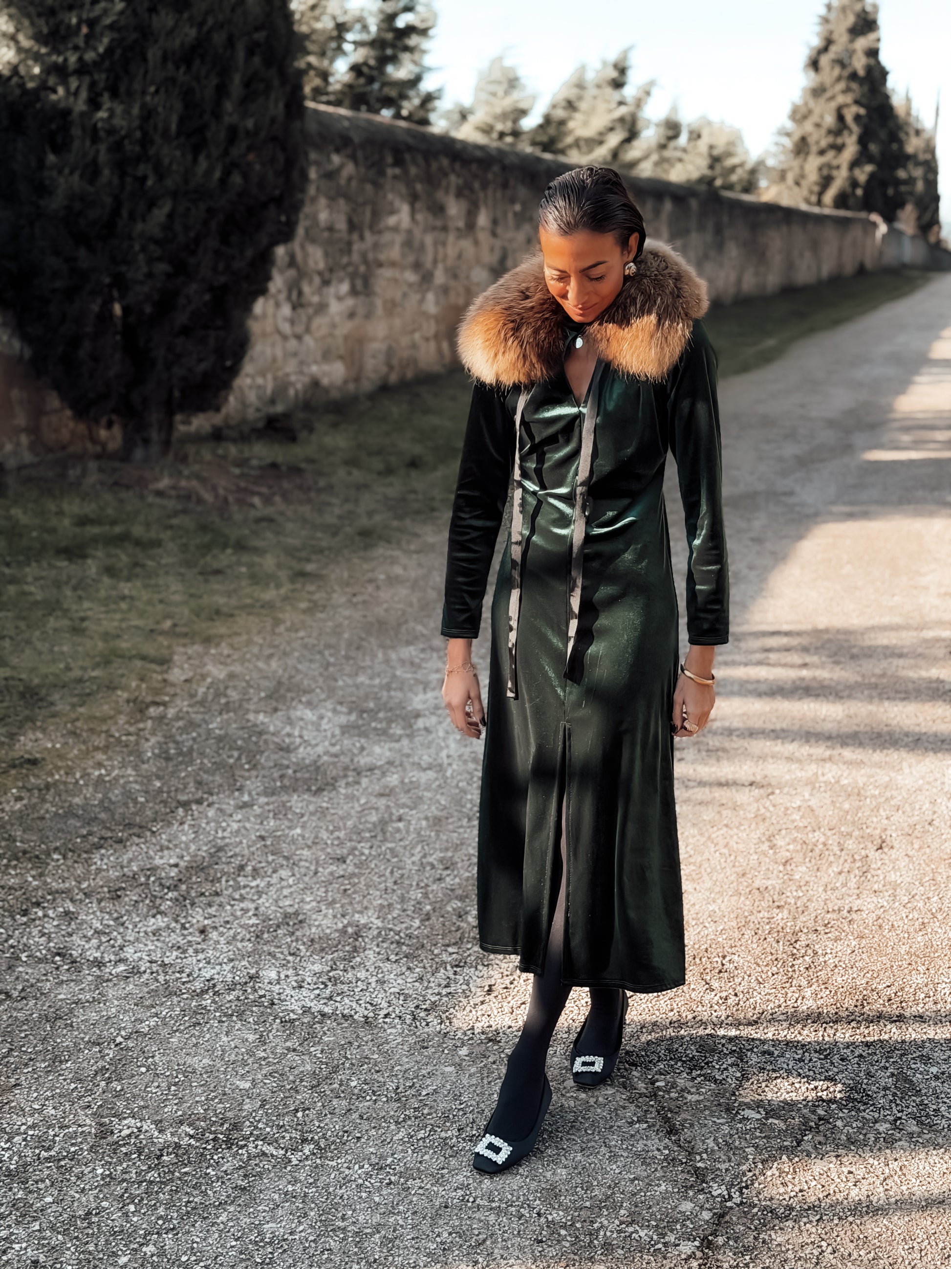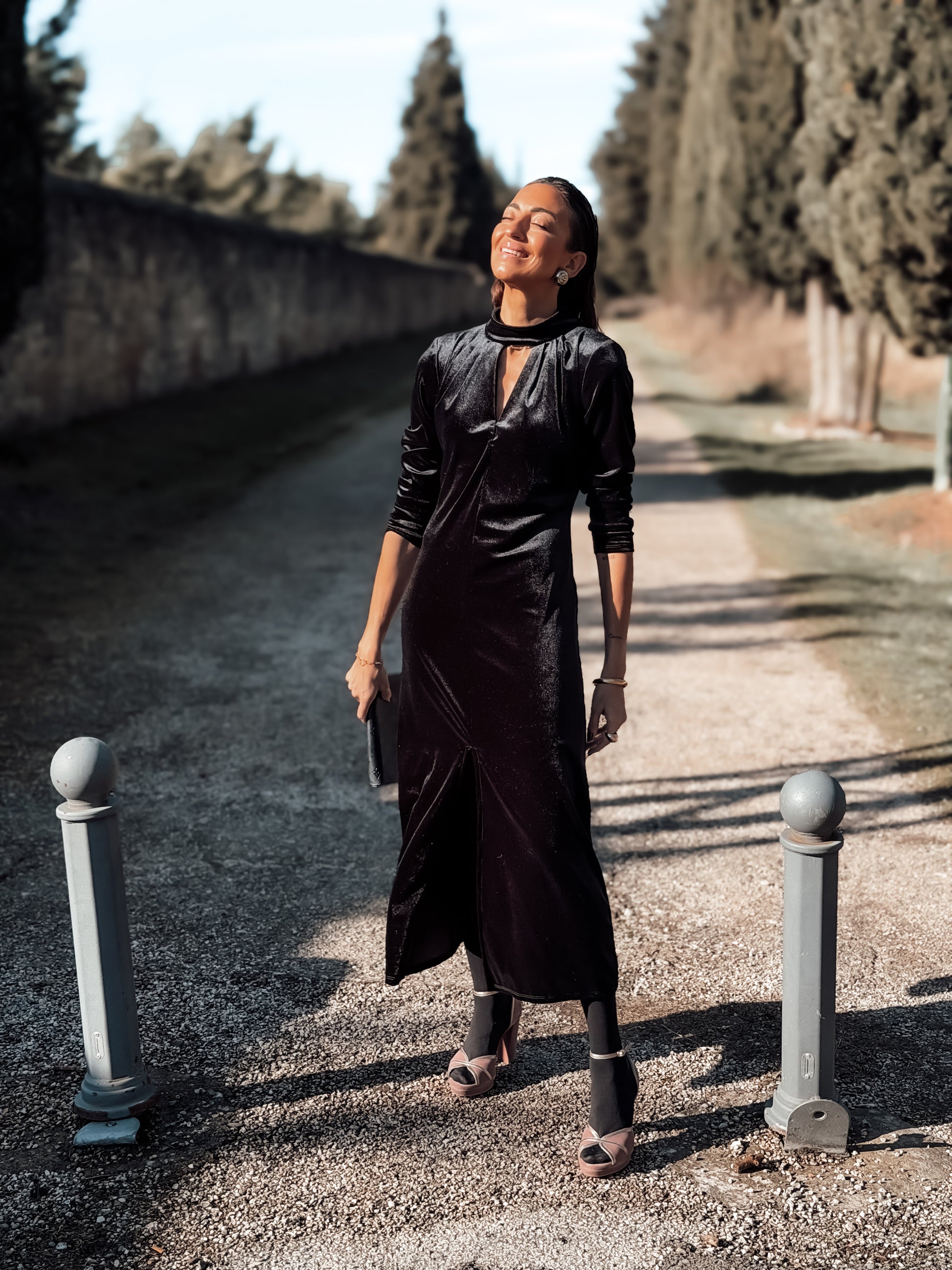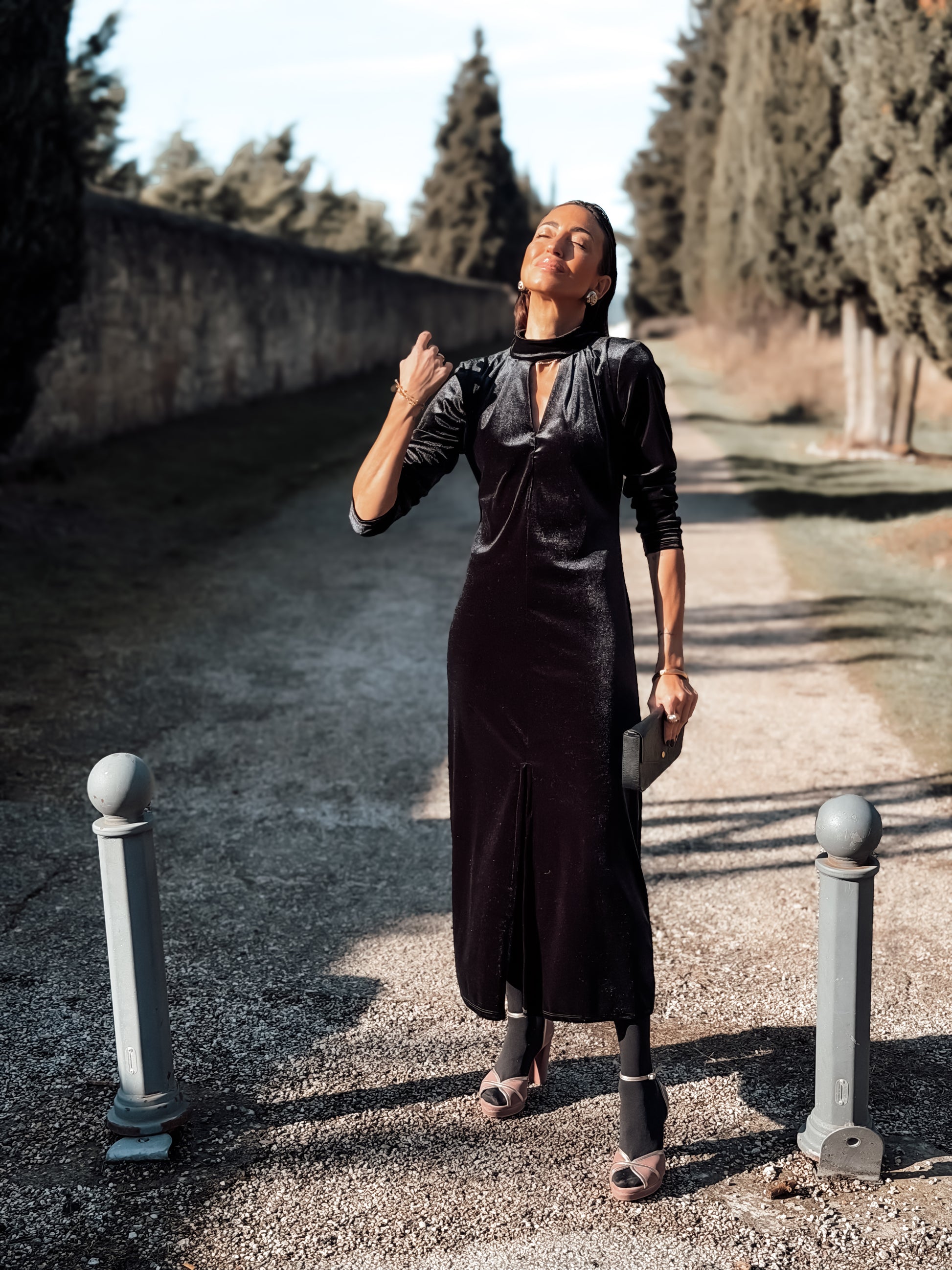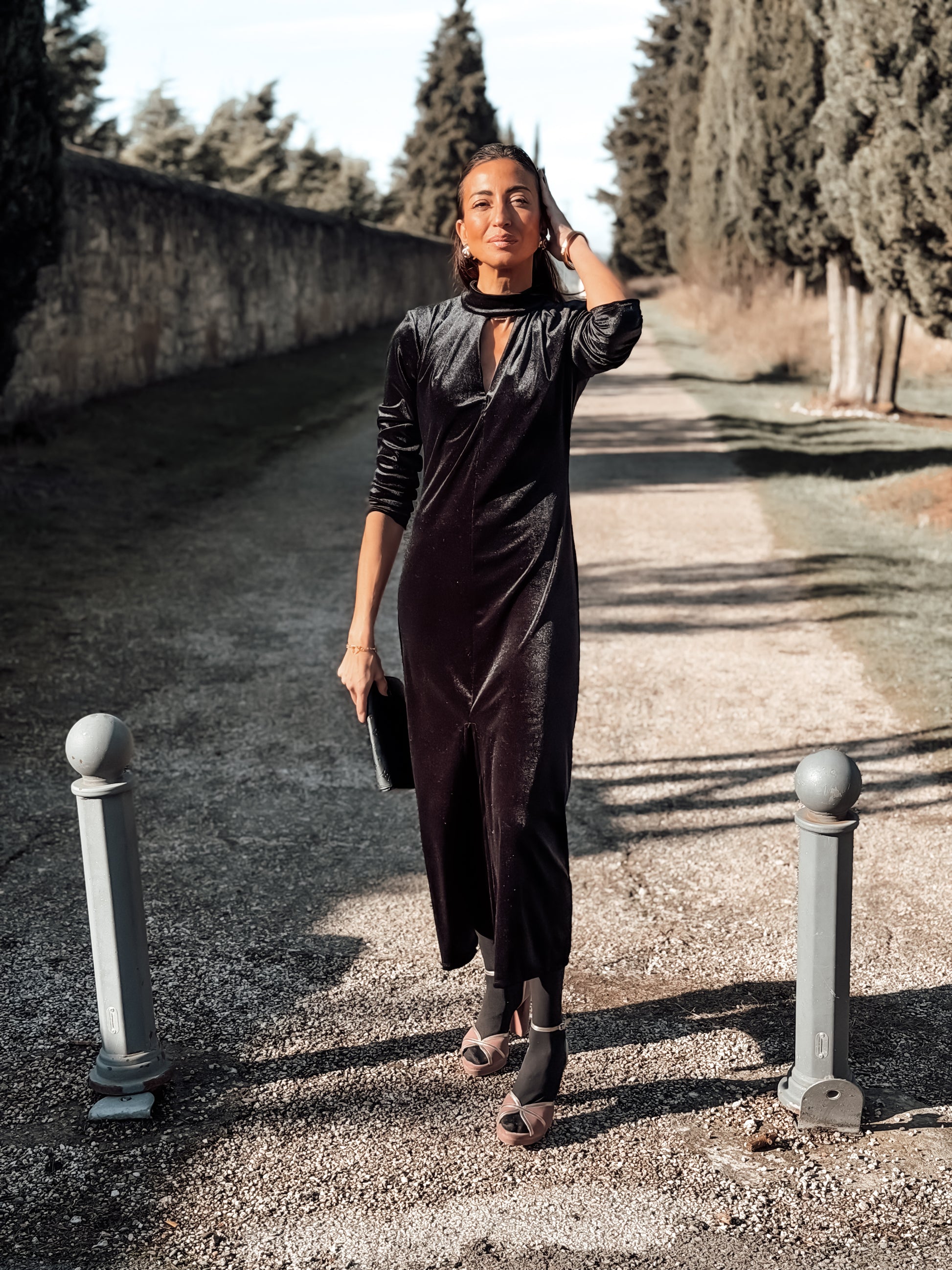 Vestido de terciopelo largo de corte entallado . Escote frontal , cierre mediante botones en la parte trasera del cuello.Dos colores negro y verde .Abertura trasera en la parte de la falda.Lleva hombreras para darle un poco más de volumen.