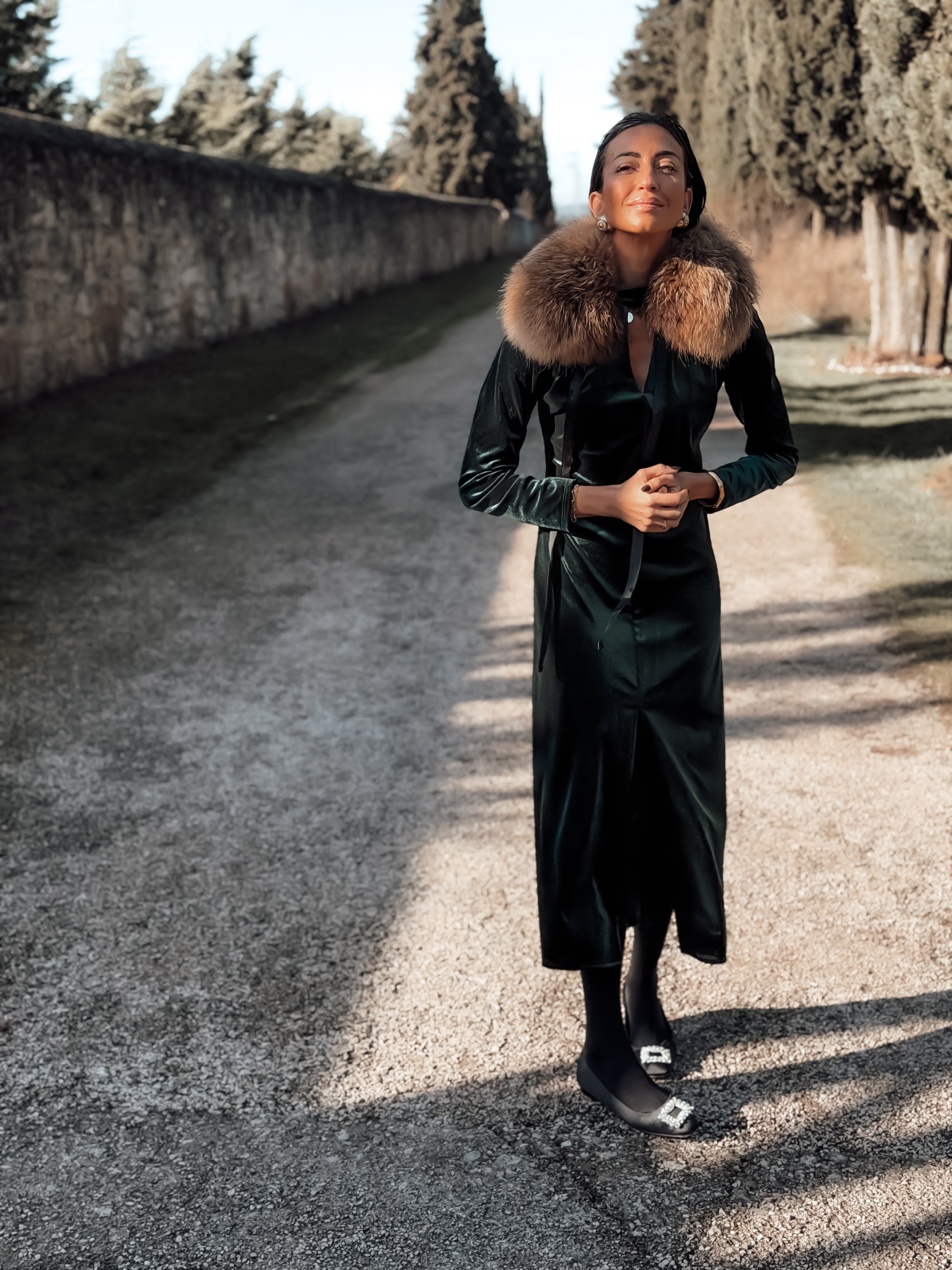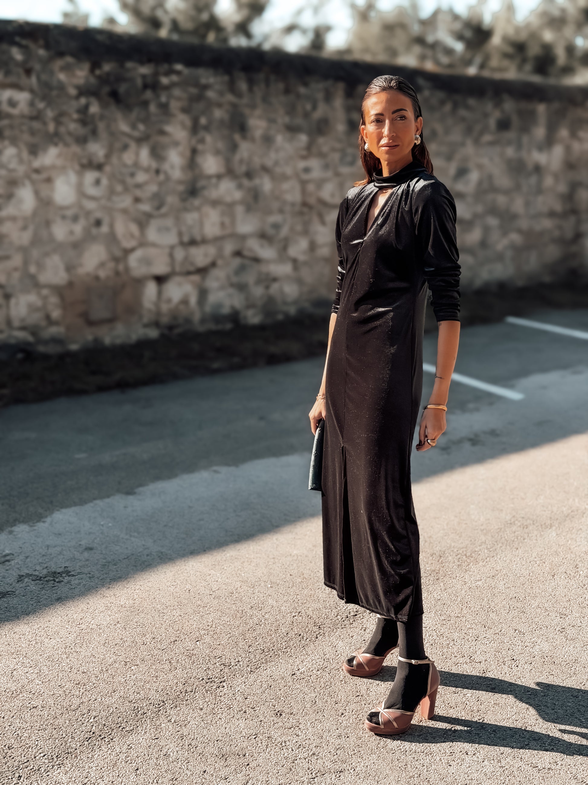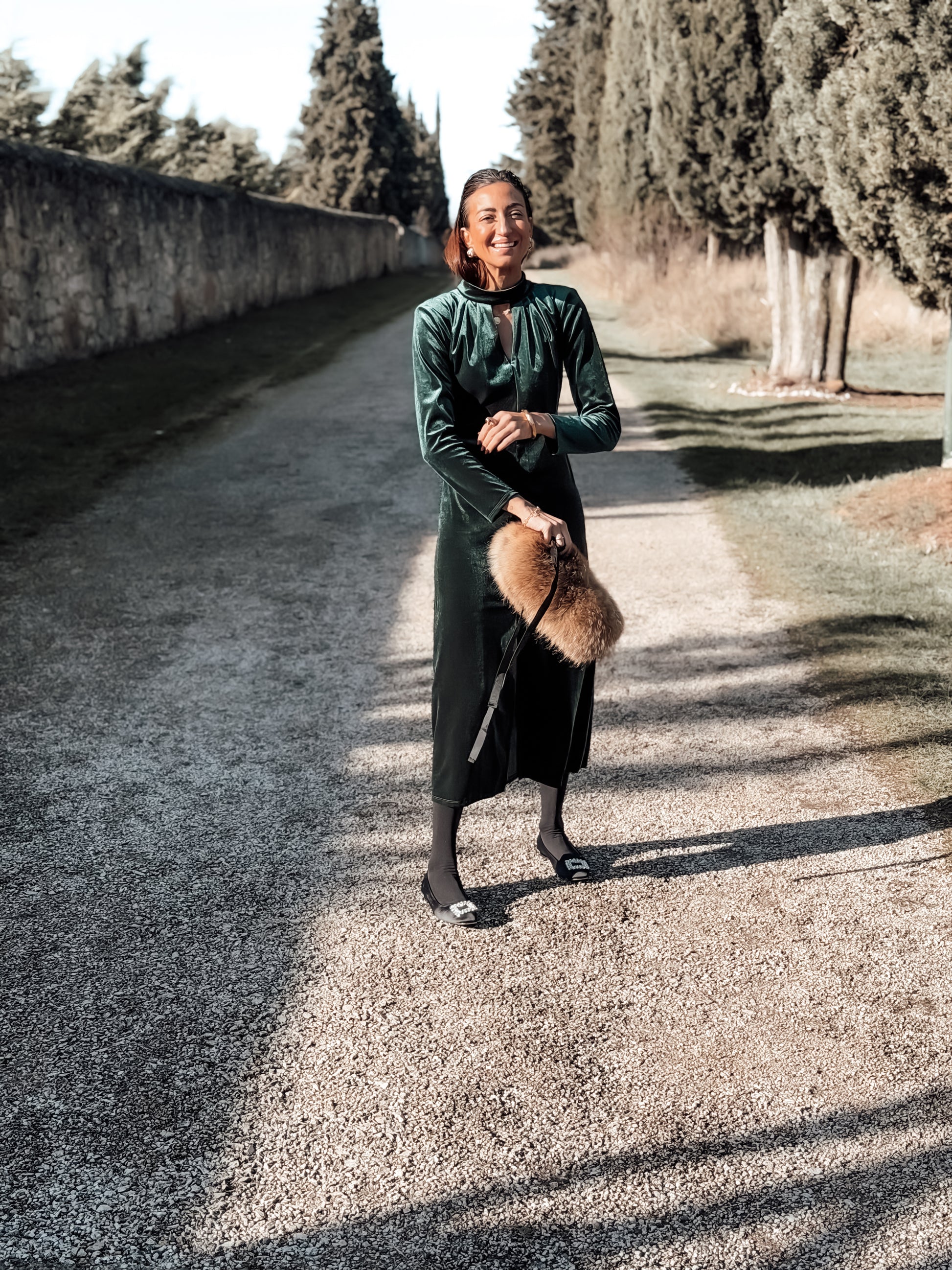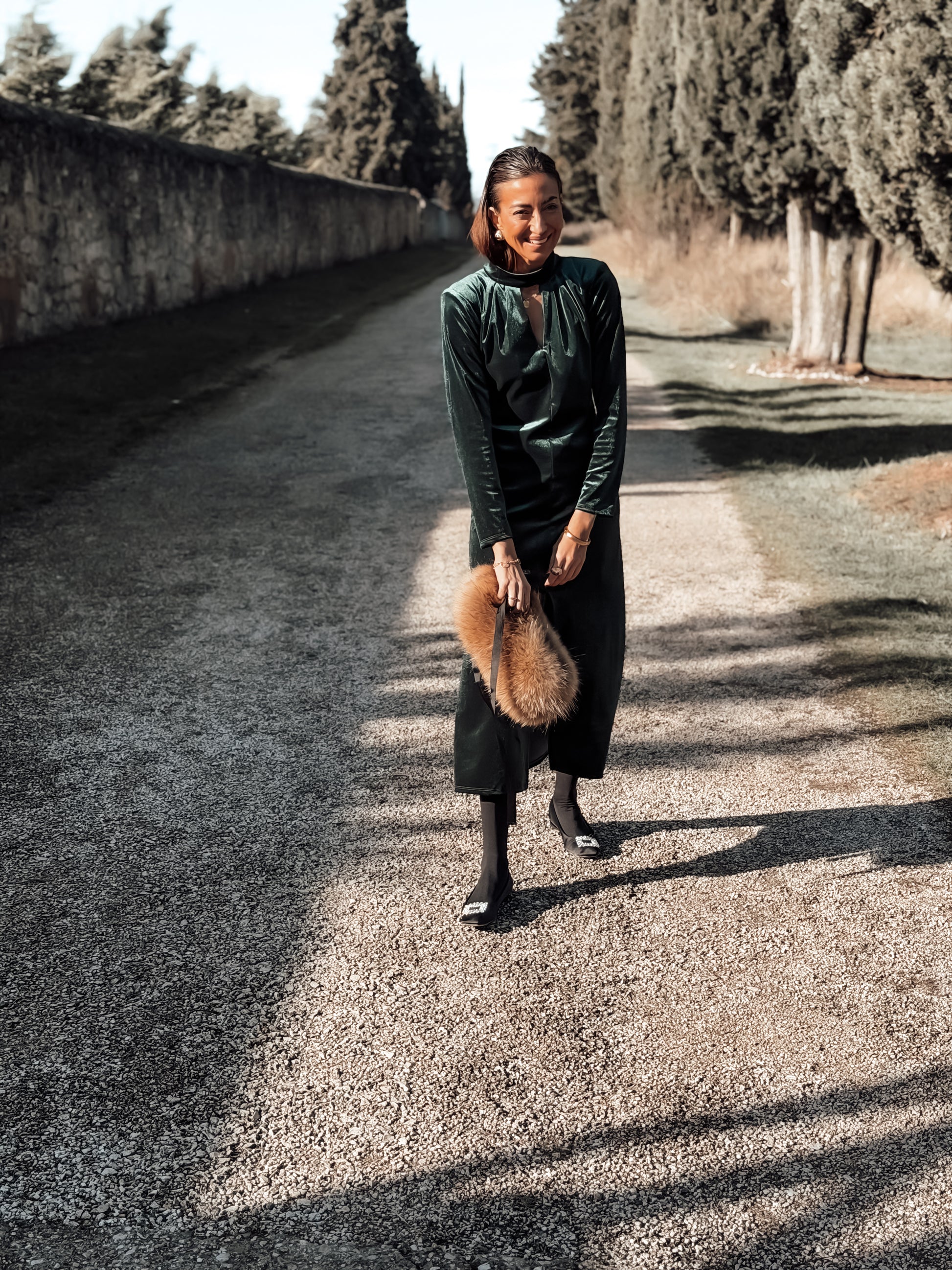 Vestido de terciopelo largo de corte entallado . Escote frontal , cierre mediante botones en la parte trasera del cuello.Dos colores negro y verde .Abertura trasera en la parte de la falda.Lleva hombreras para darle un poco más de volumen.