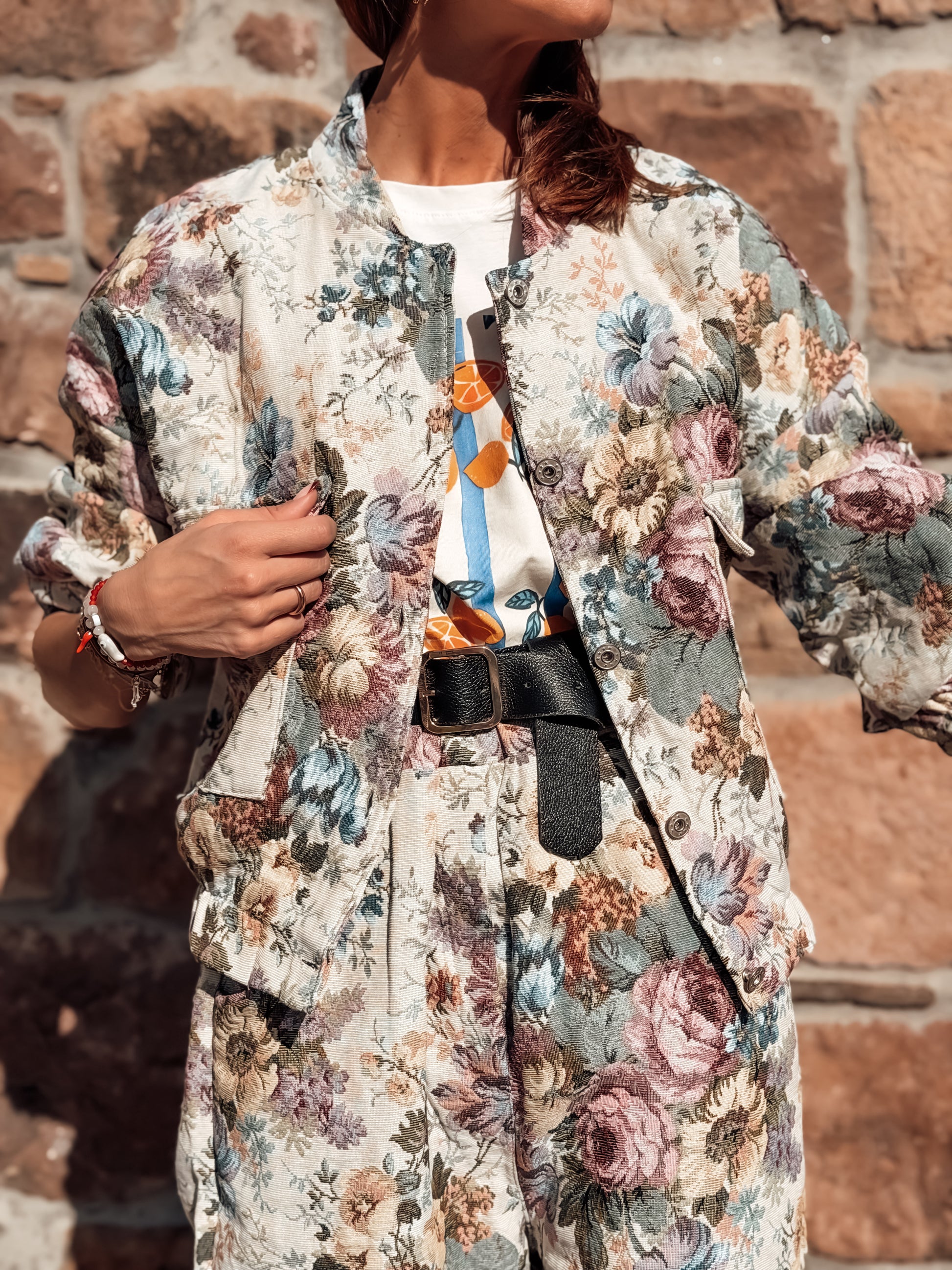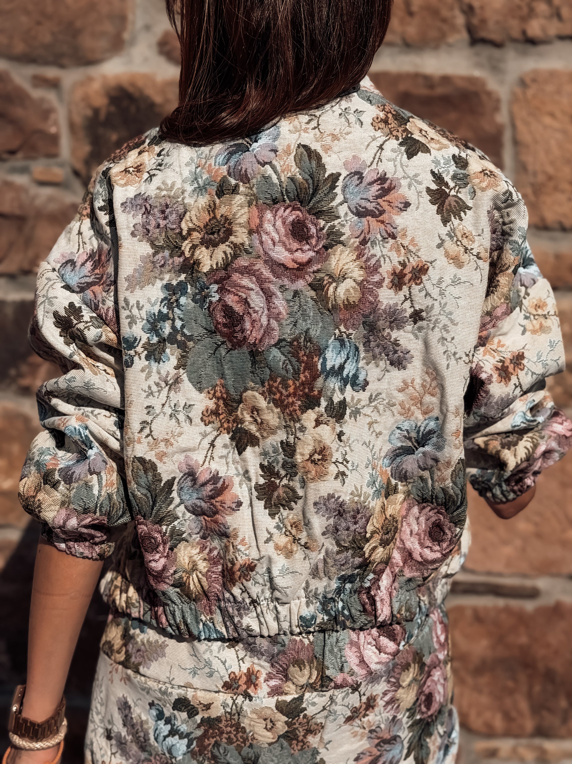 Bomber en tejido brocado de flores, bolsillos plastón en lateral .