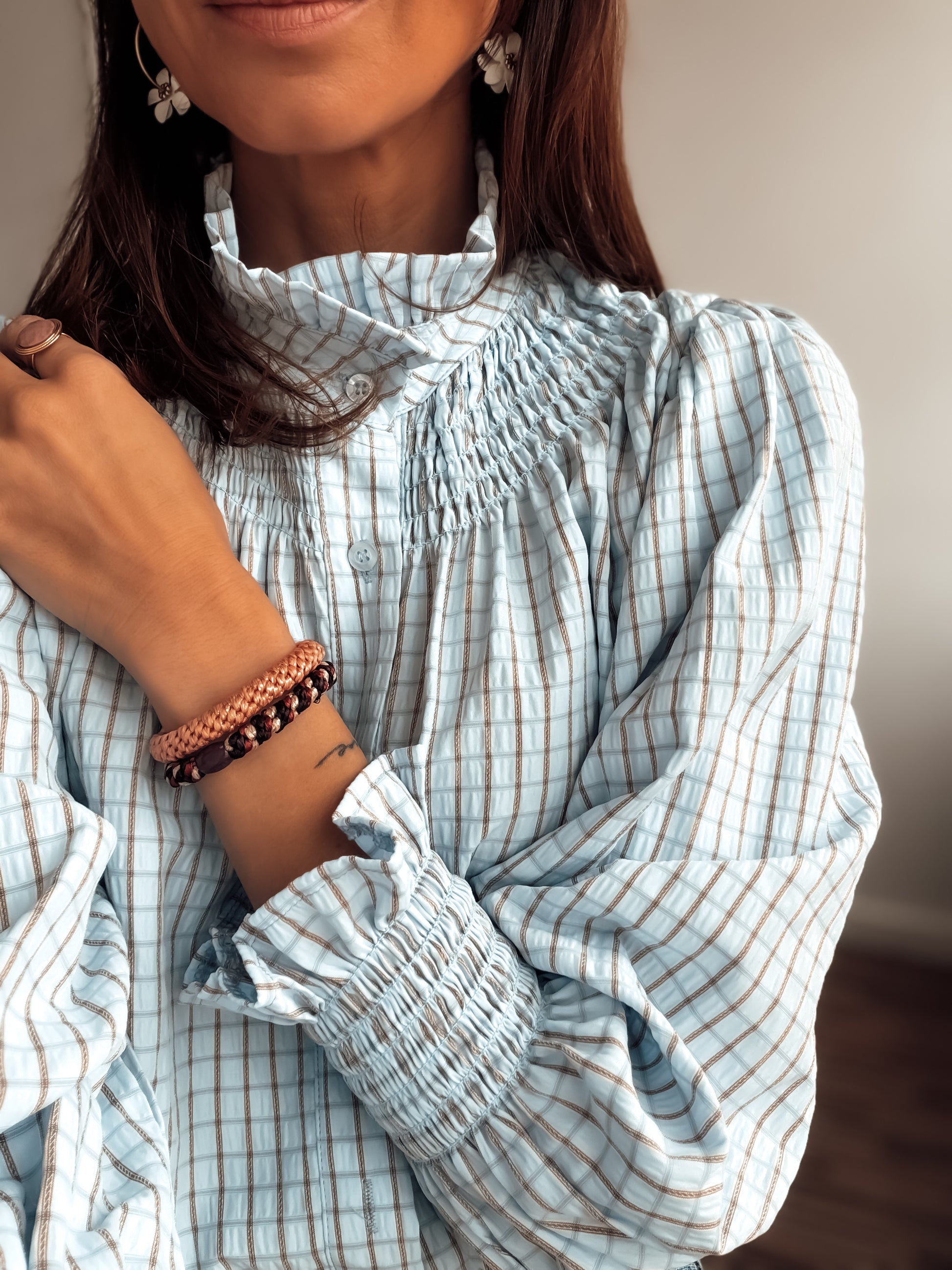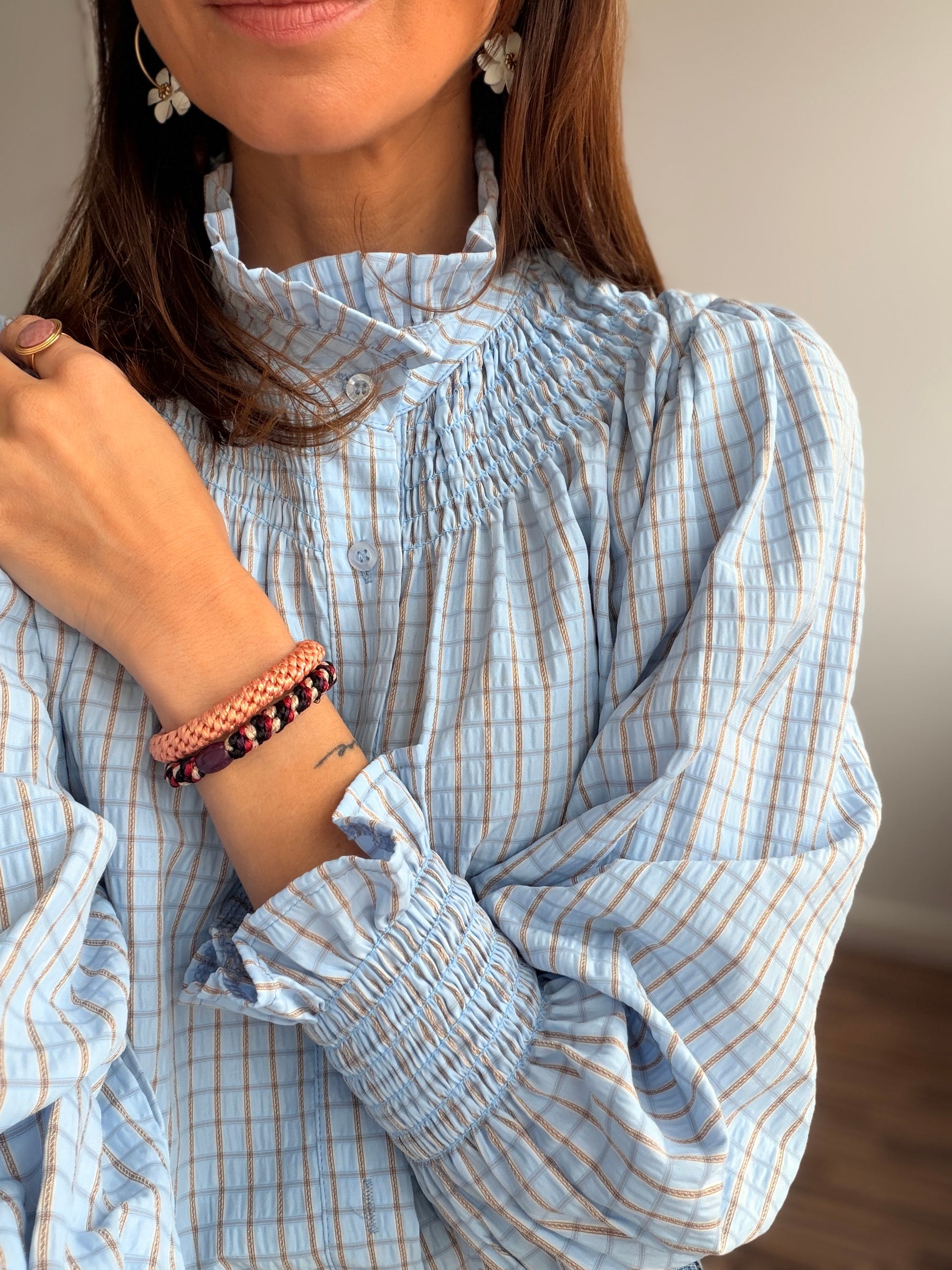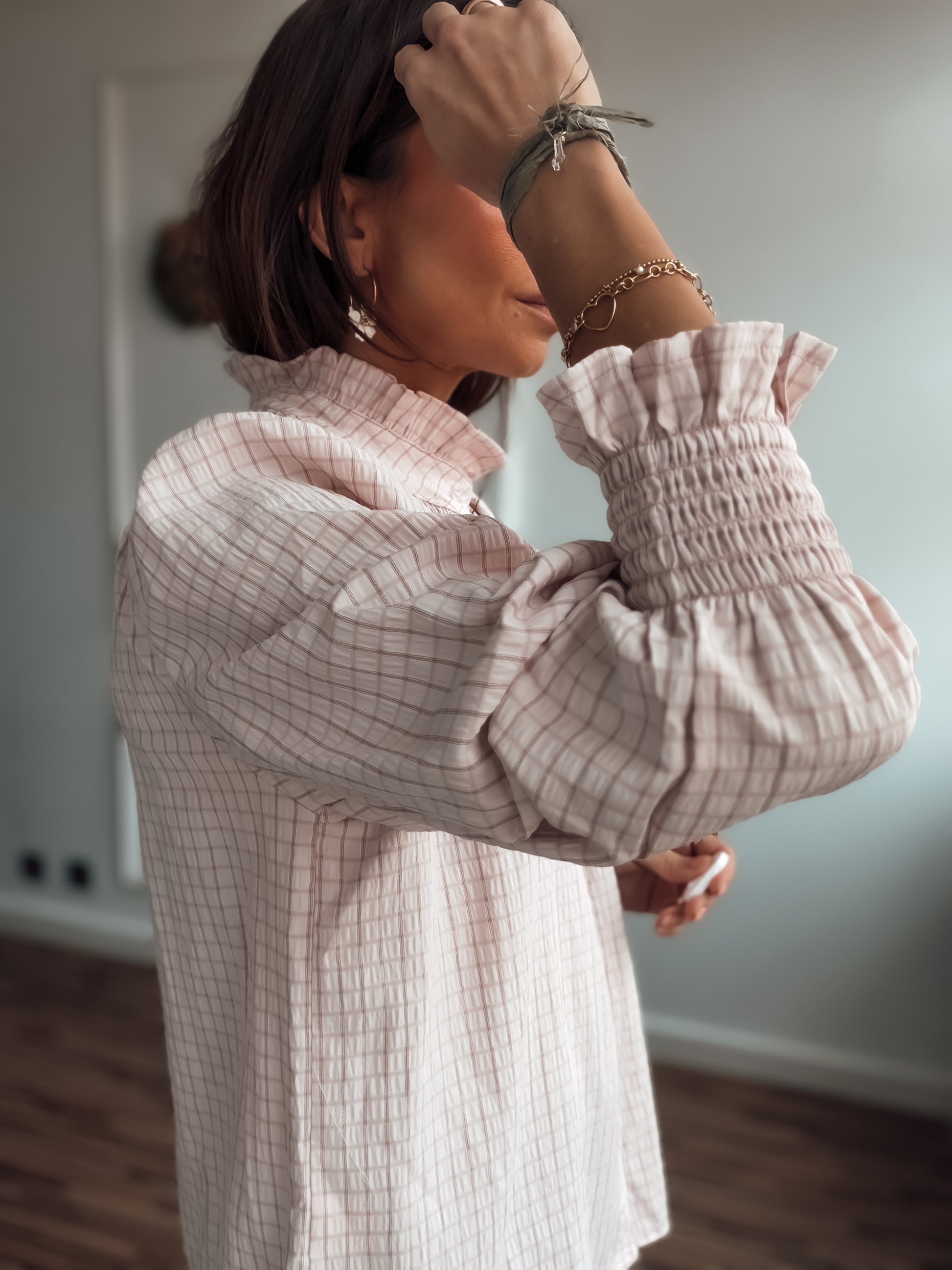 Camisa con cuello chimenea y cuadro en contraste marrón sobre fondo azul o rosa .Tejido nido en parte frontal