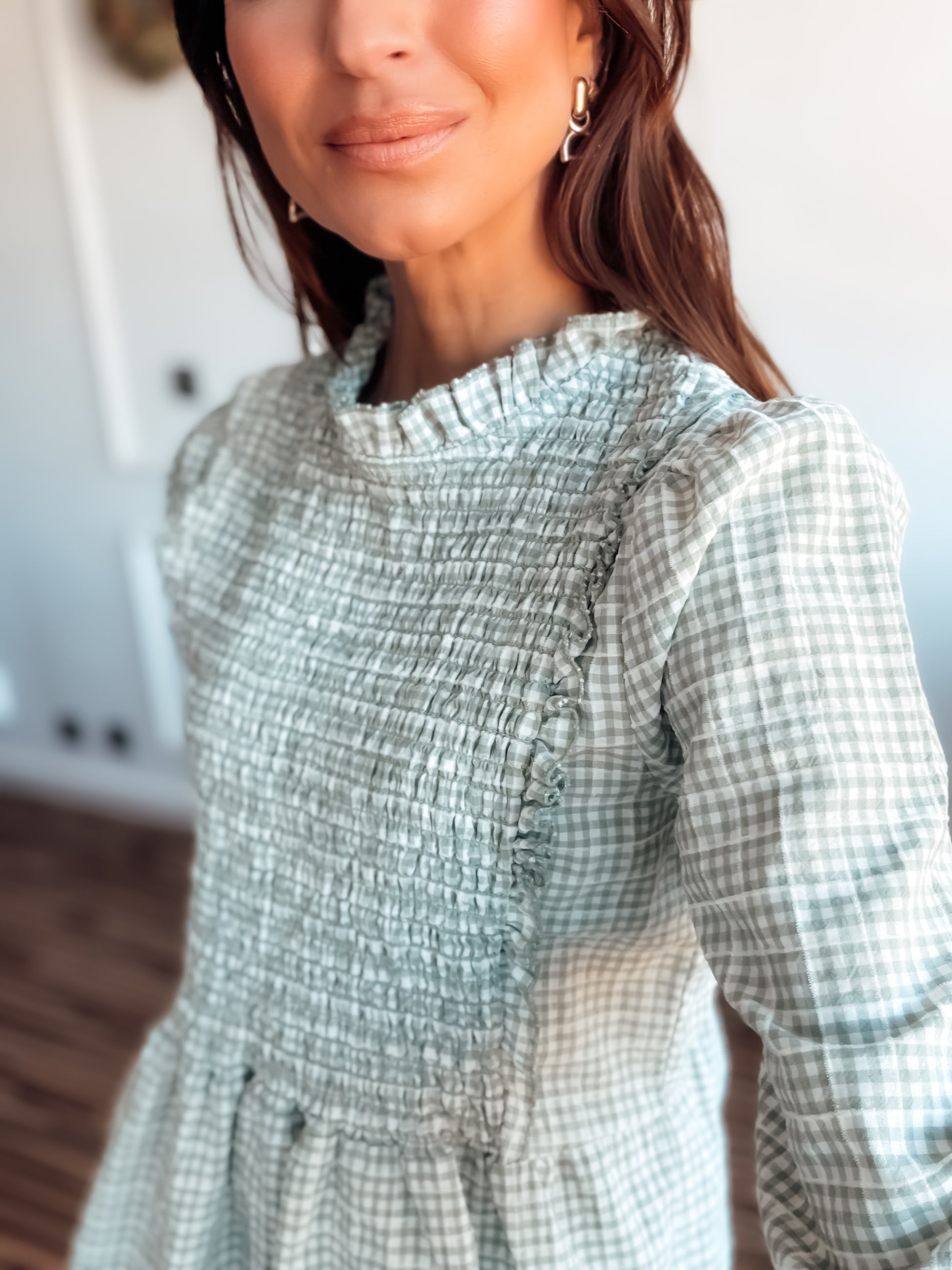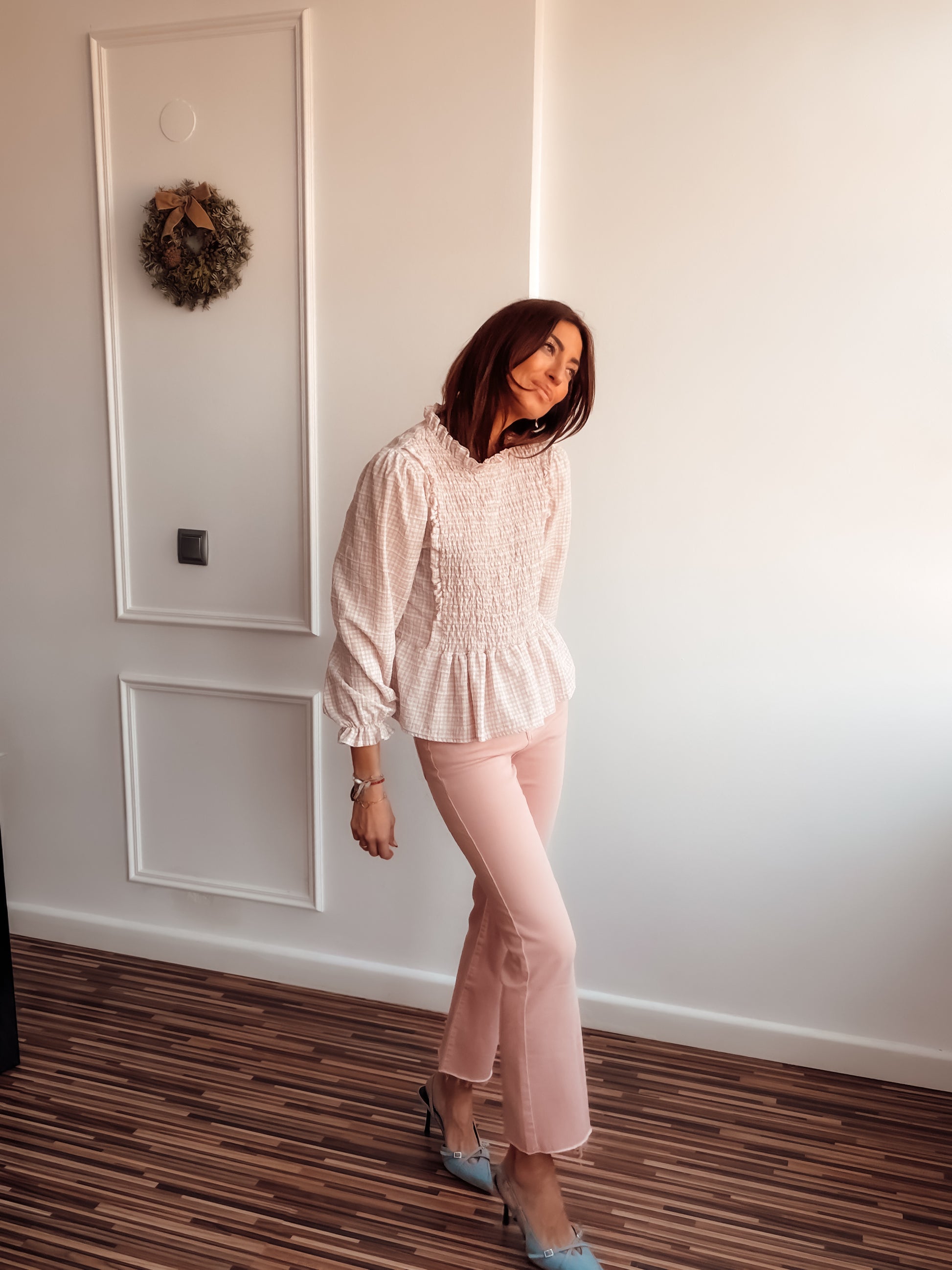 Camisa con estampado Vichy, cuello y manga con pequeño volante, y tejido en nido de abeja en zona del pecho.