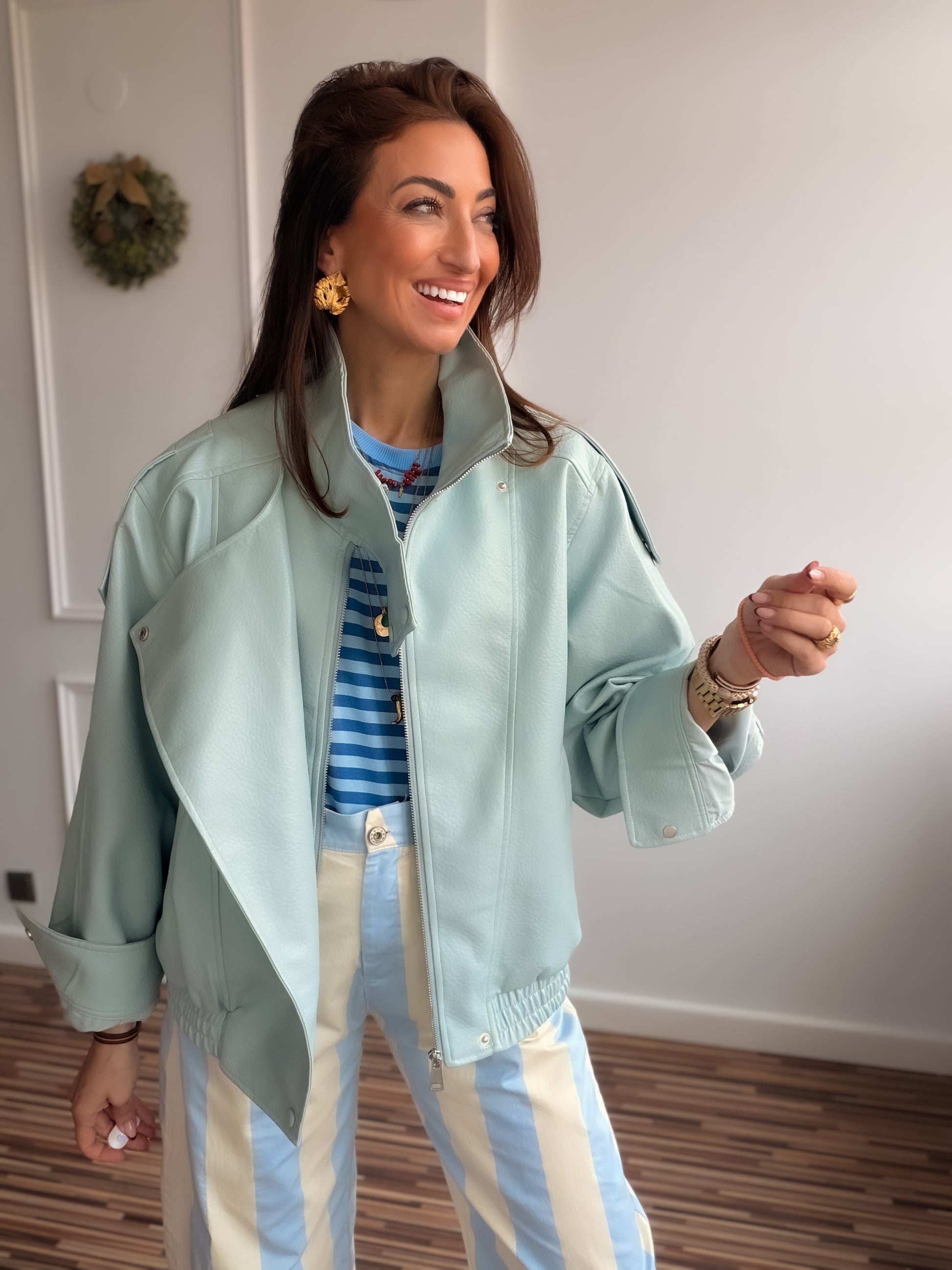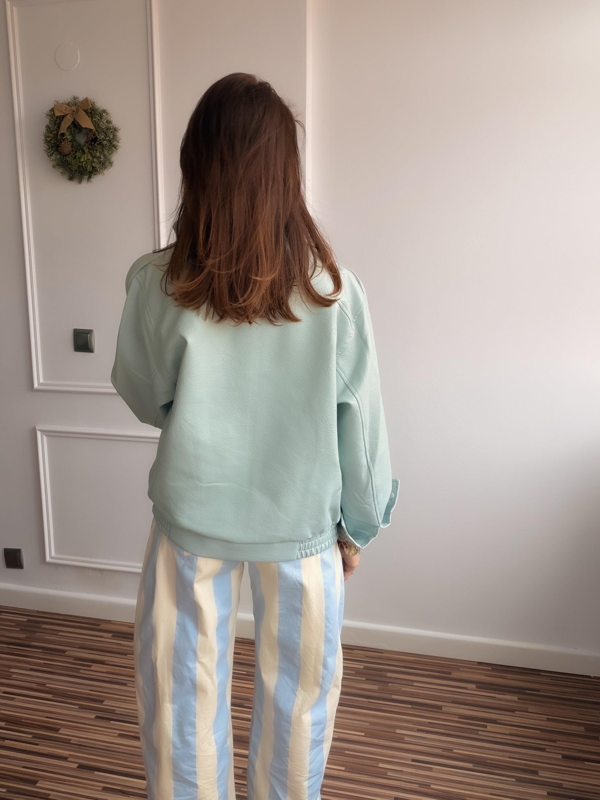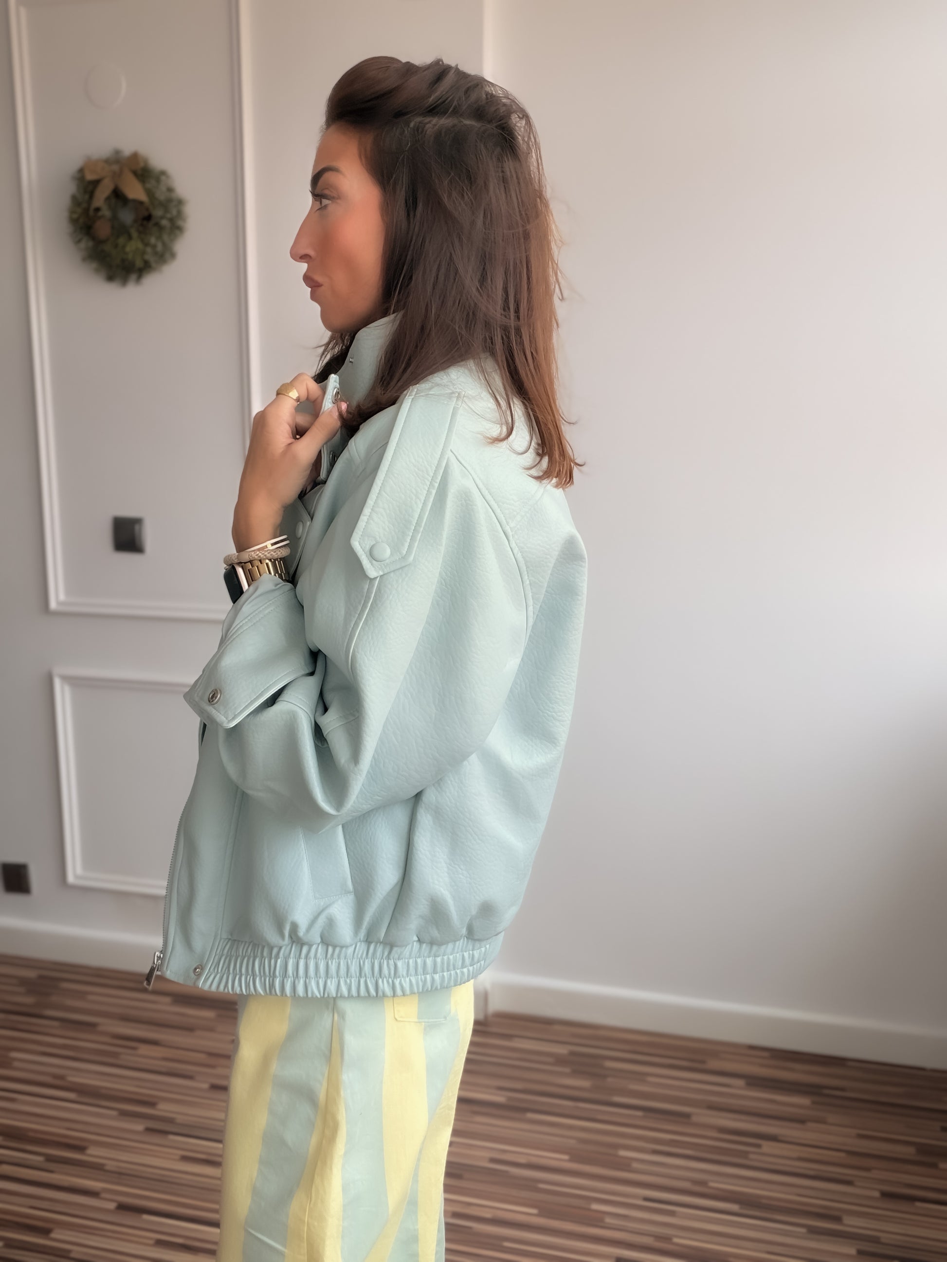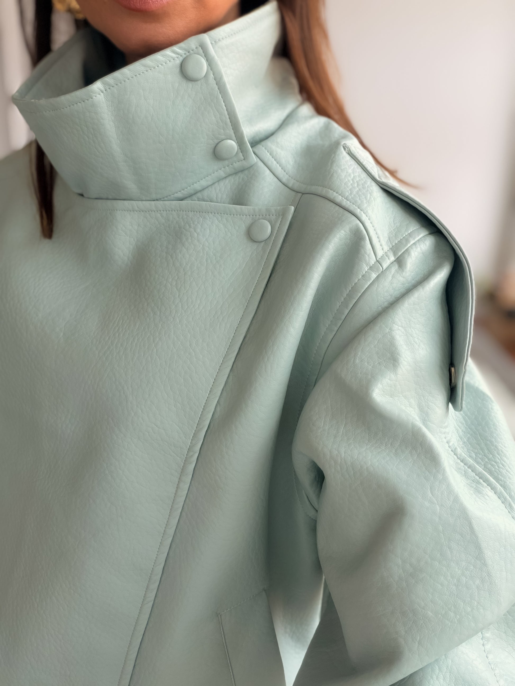 Cazadora efecto piel tipo biker azul de cuello subido y manga larga con trabillas en hombro acabada en puño.Bajo acabado en elástico. Forro interior a tono. Cierre frontal cruzado con cremallera oculta por sopata y botones forrados.