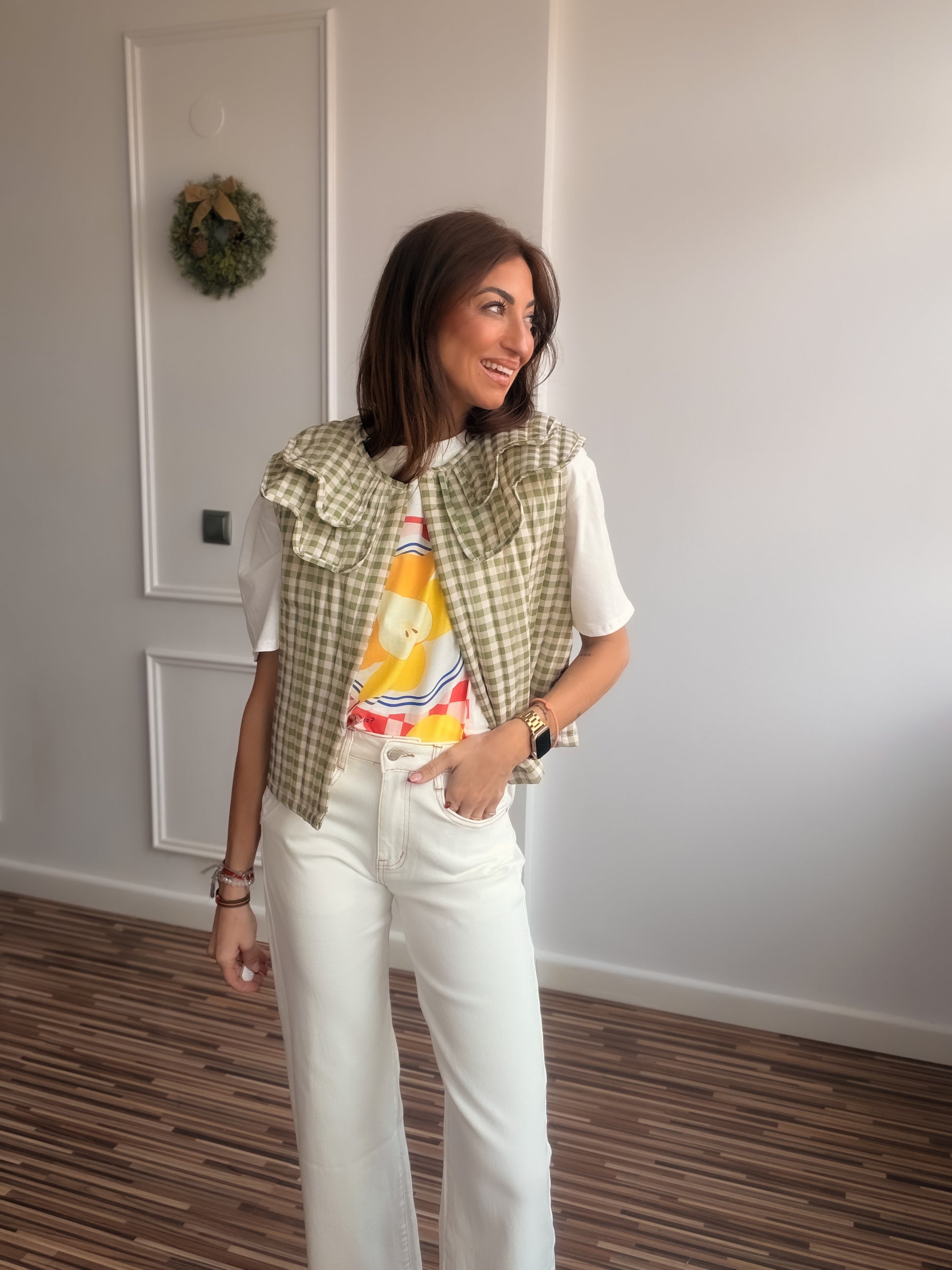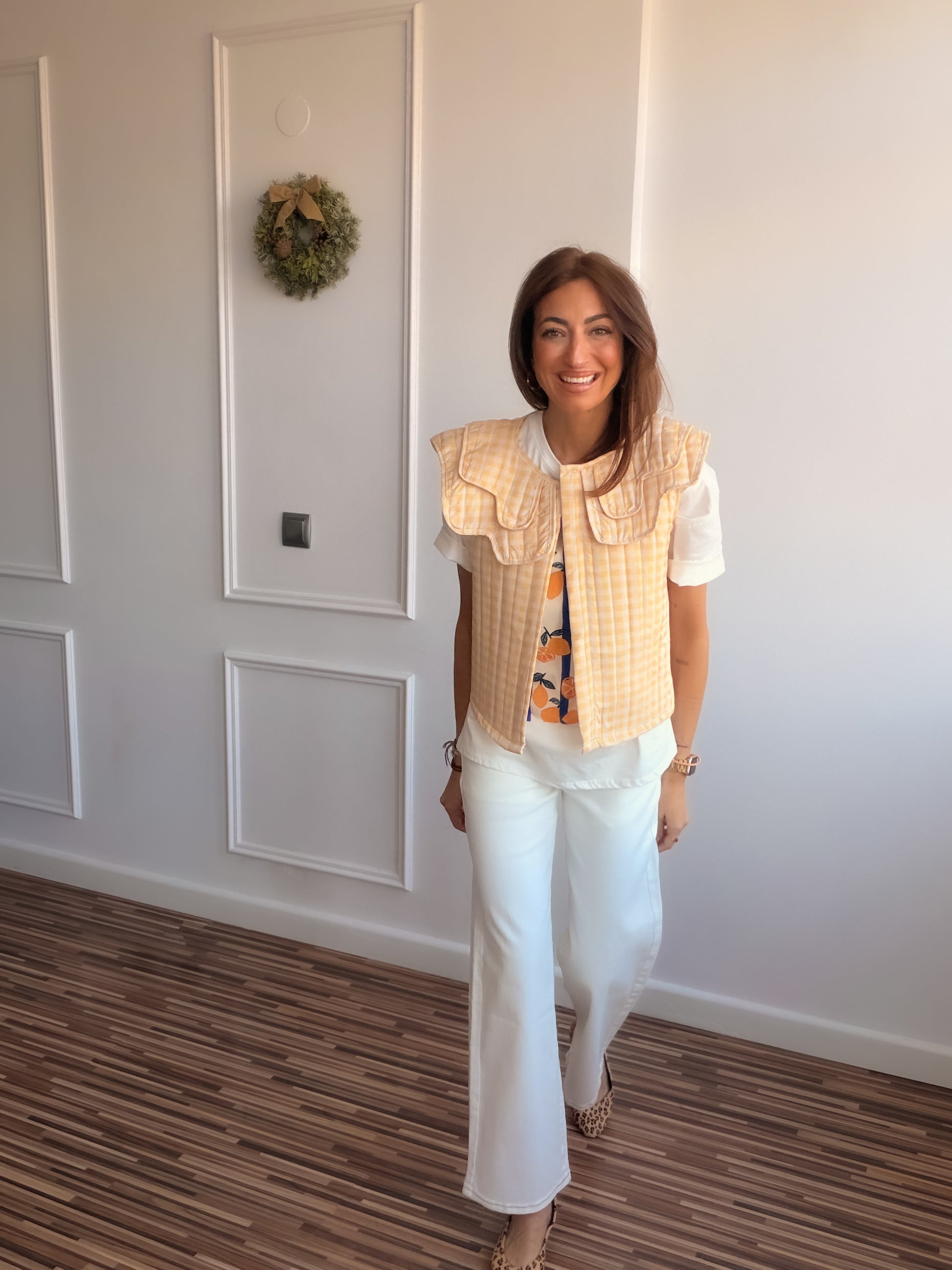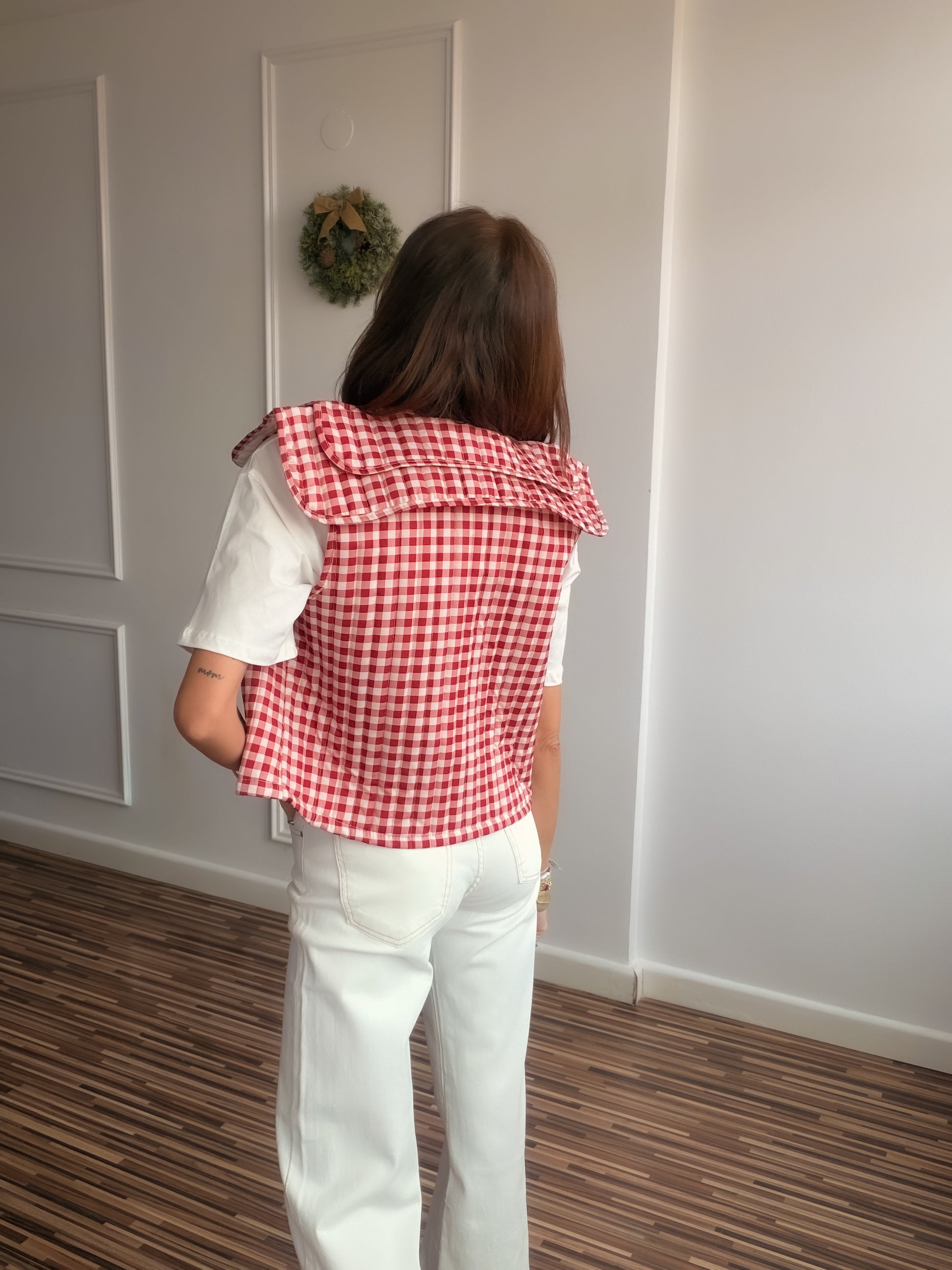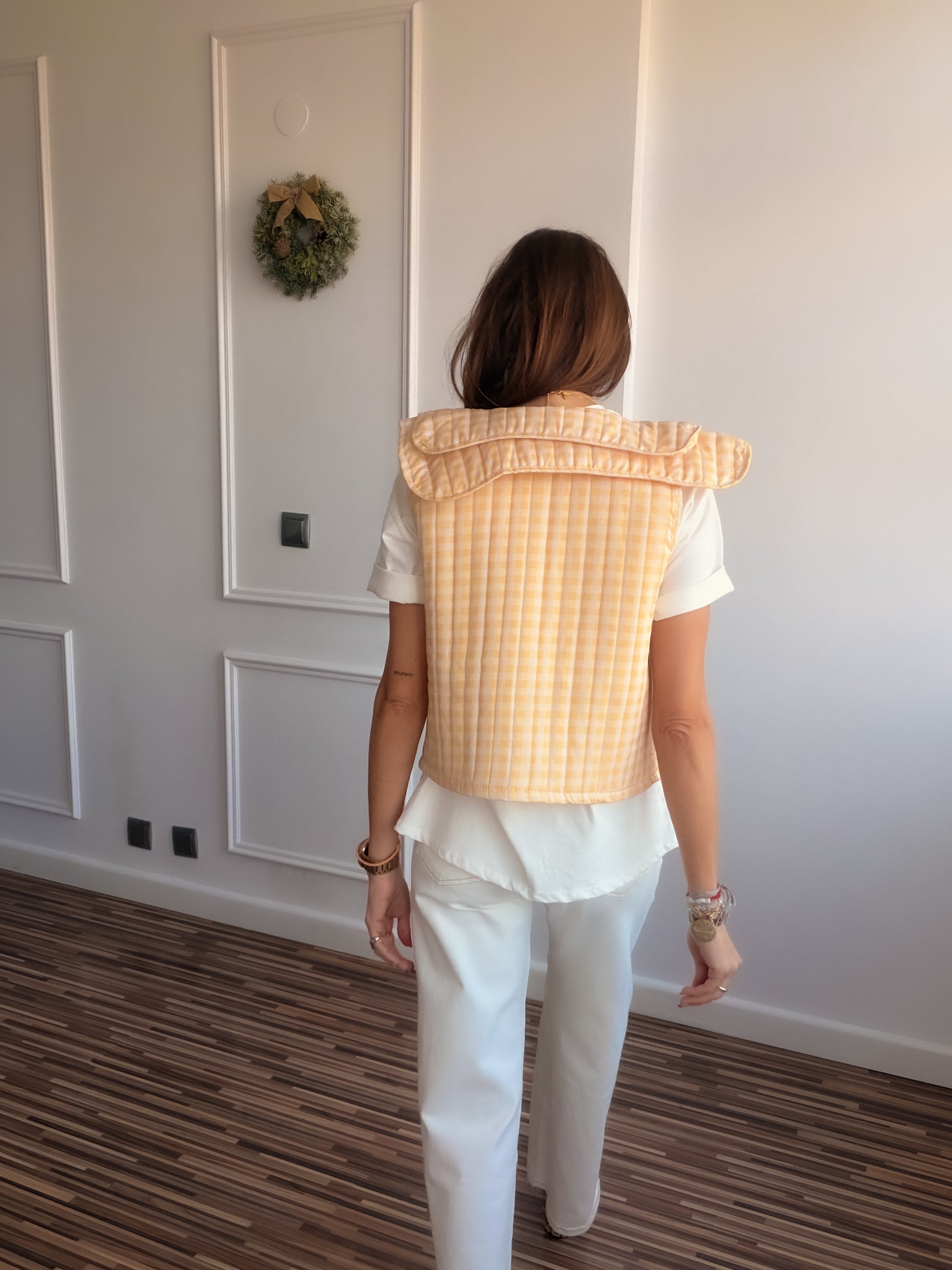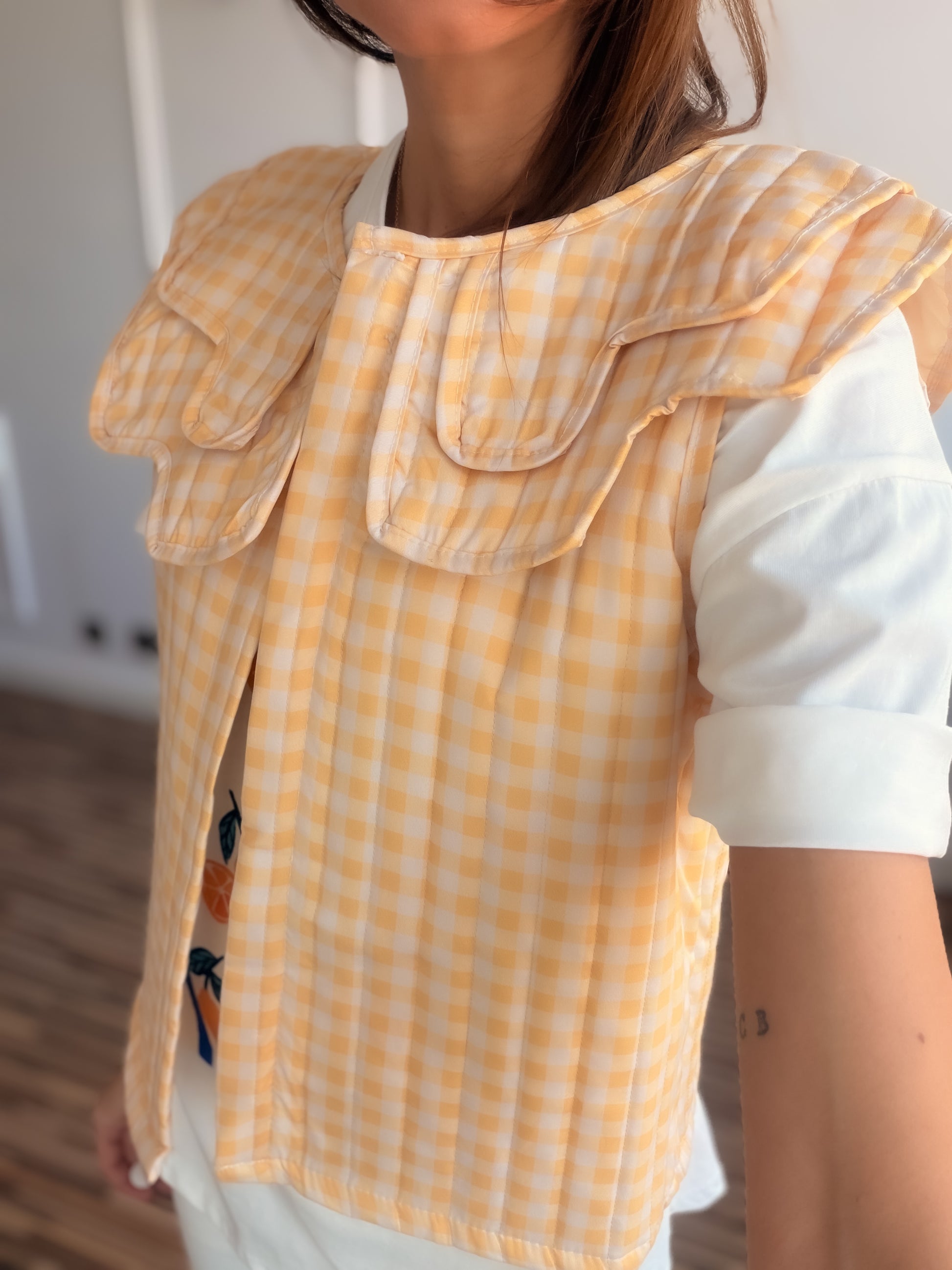 Chaleco acolchado en tejido Vichy cropped con volante al cuello.
