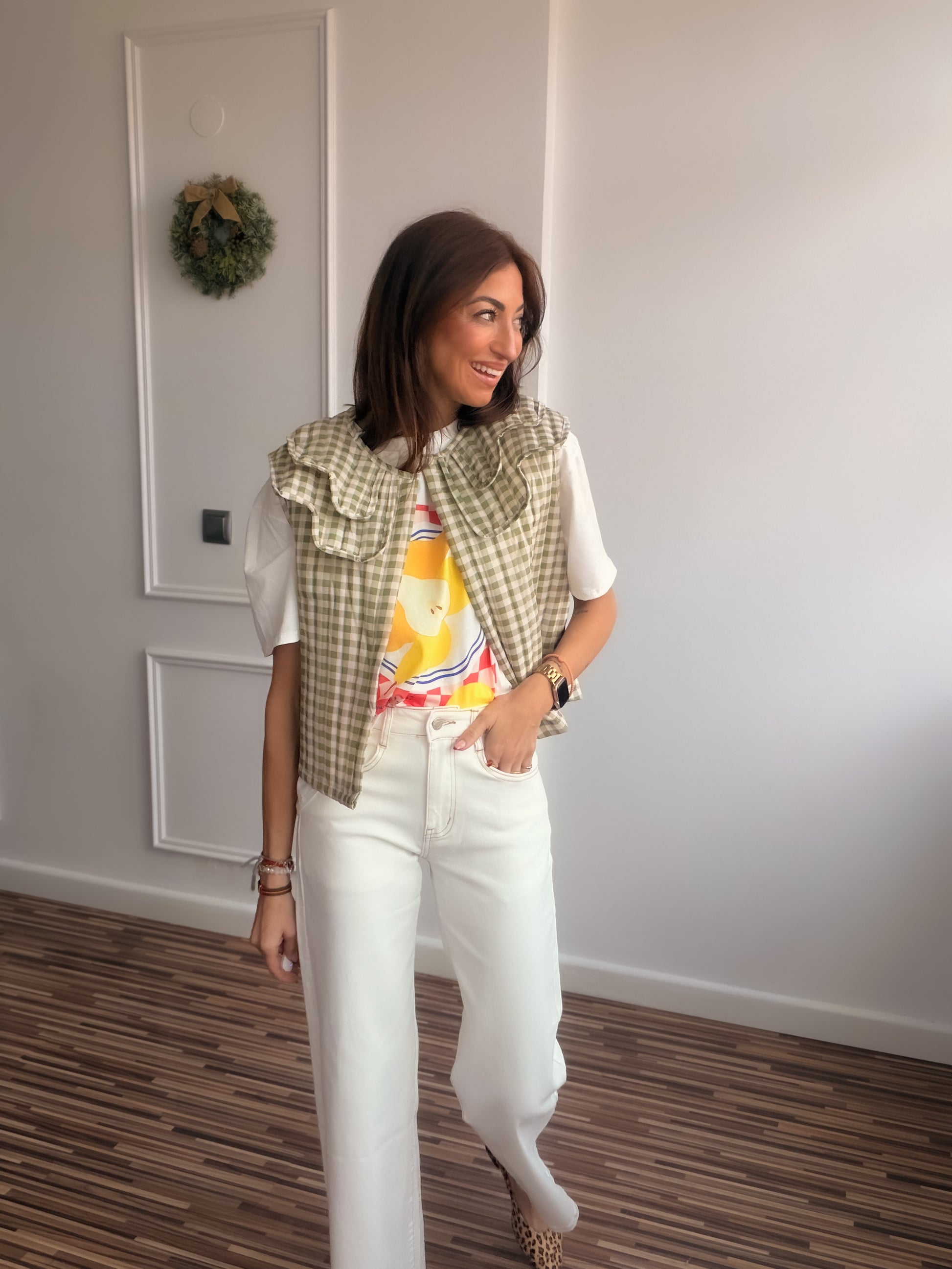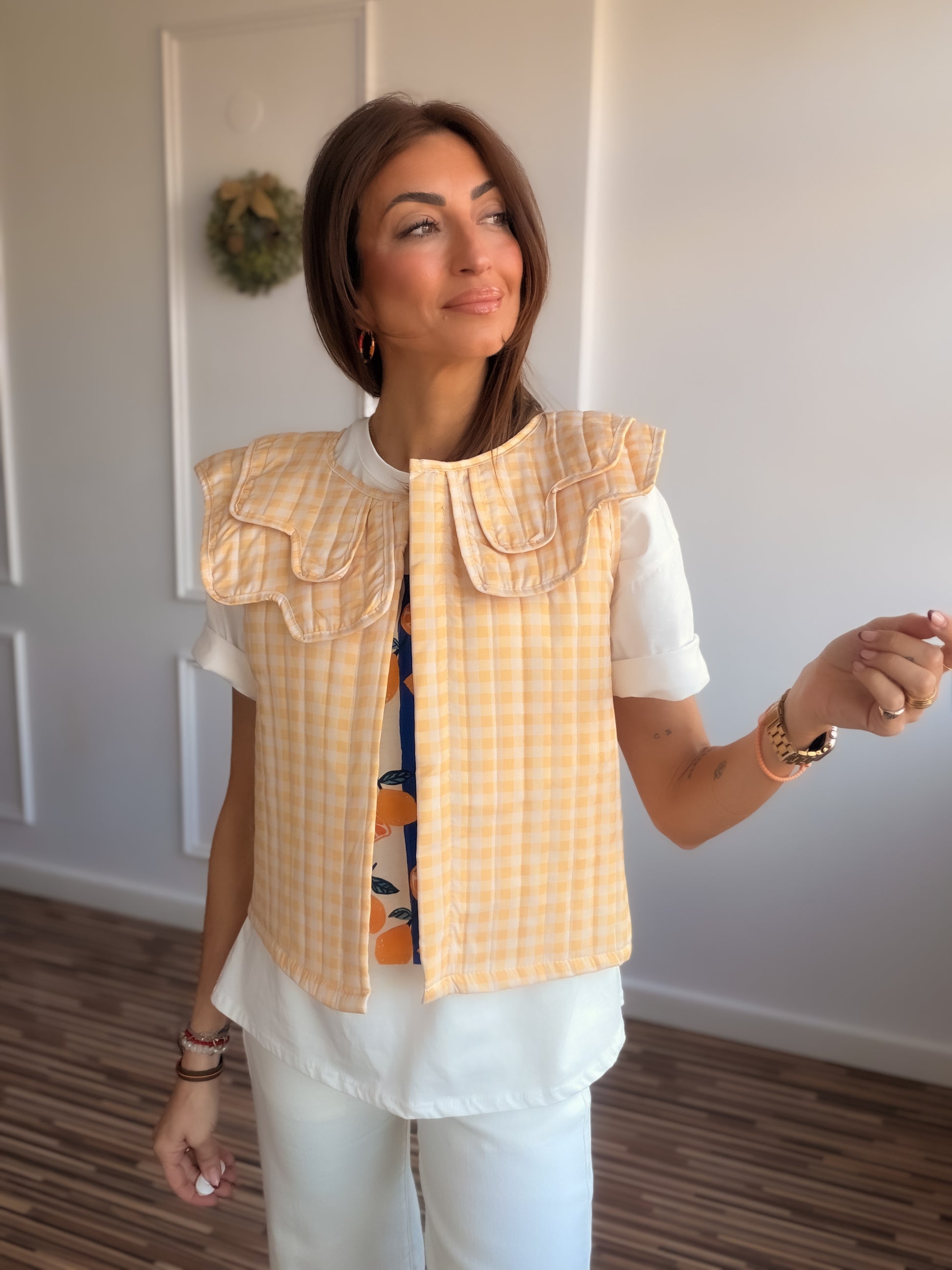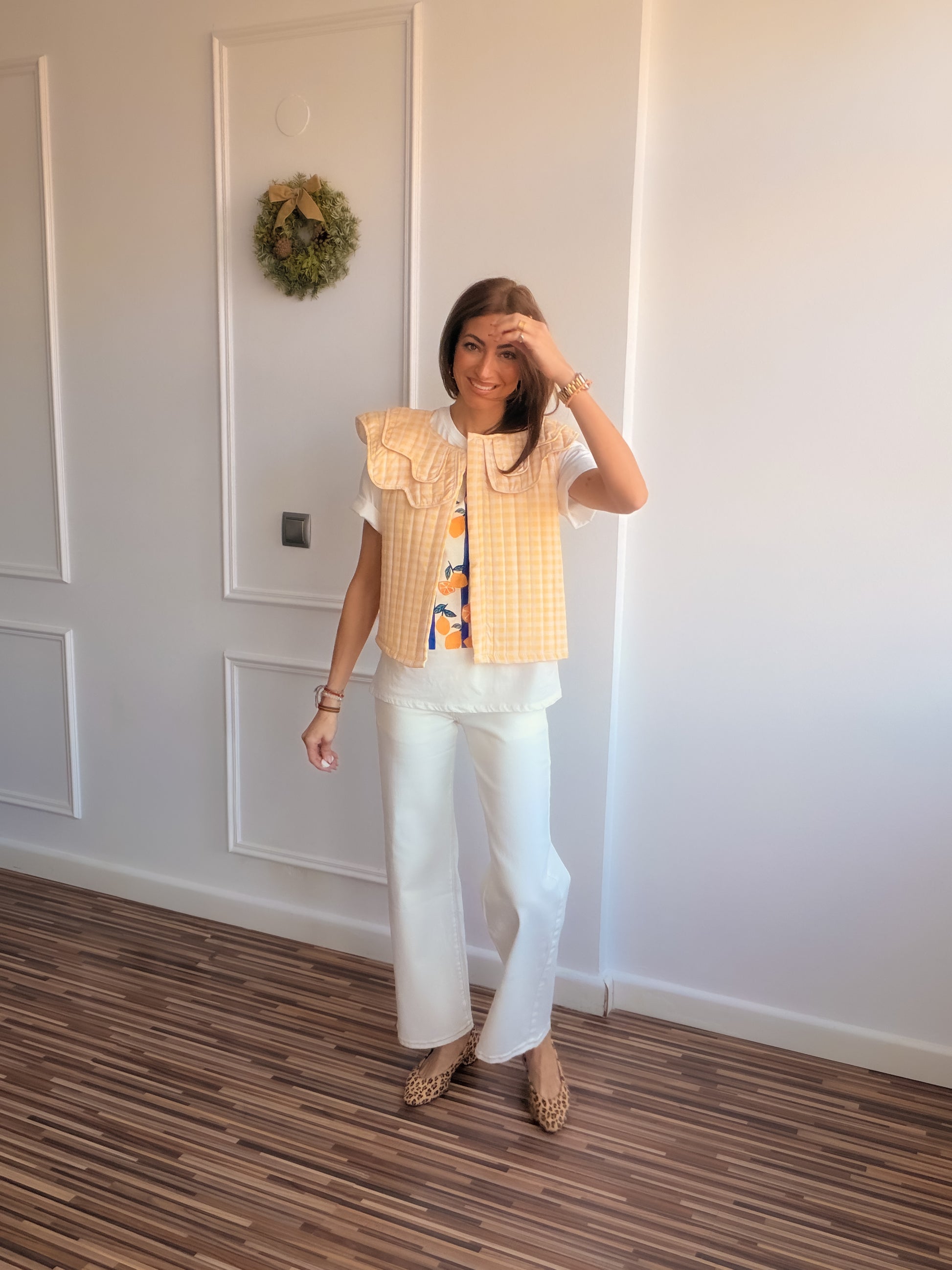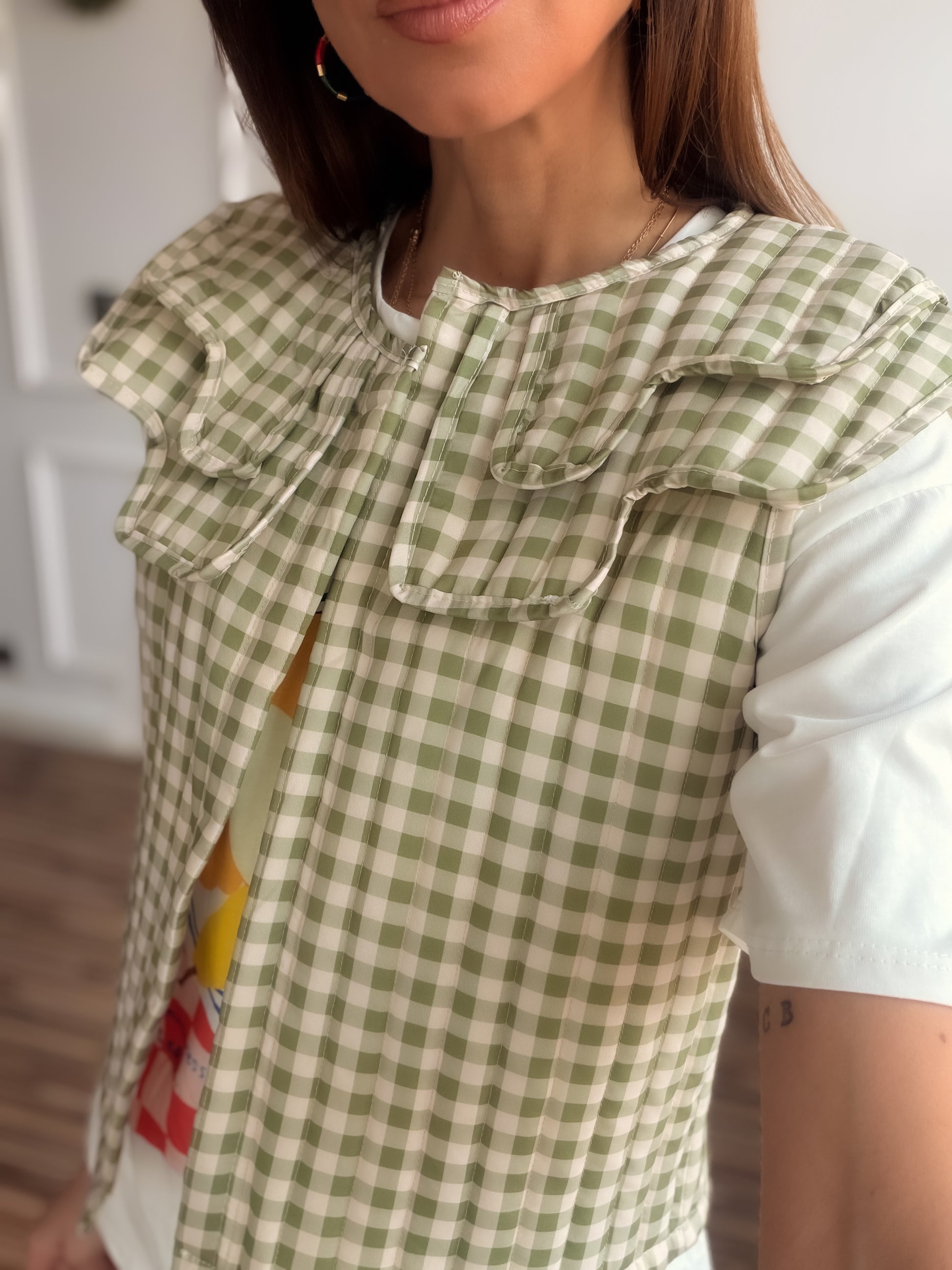 Chaleco acolchado en tejido Vichy cropped con volante al cuello.
