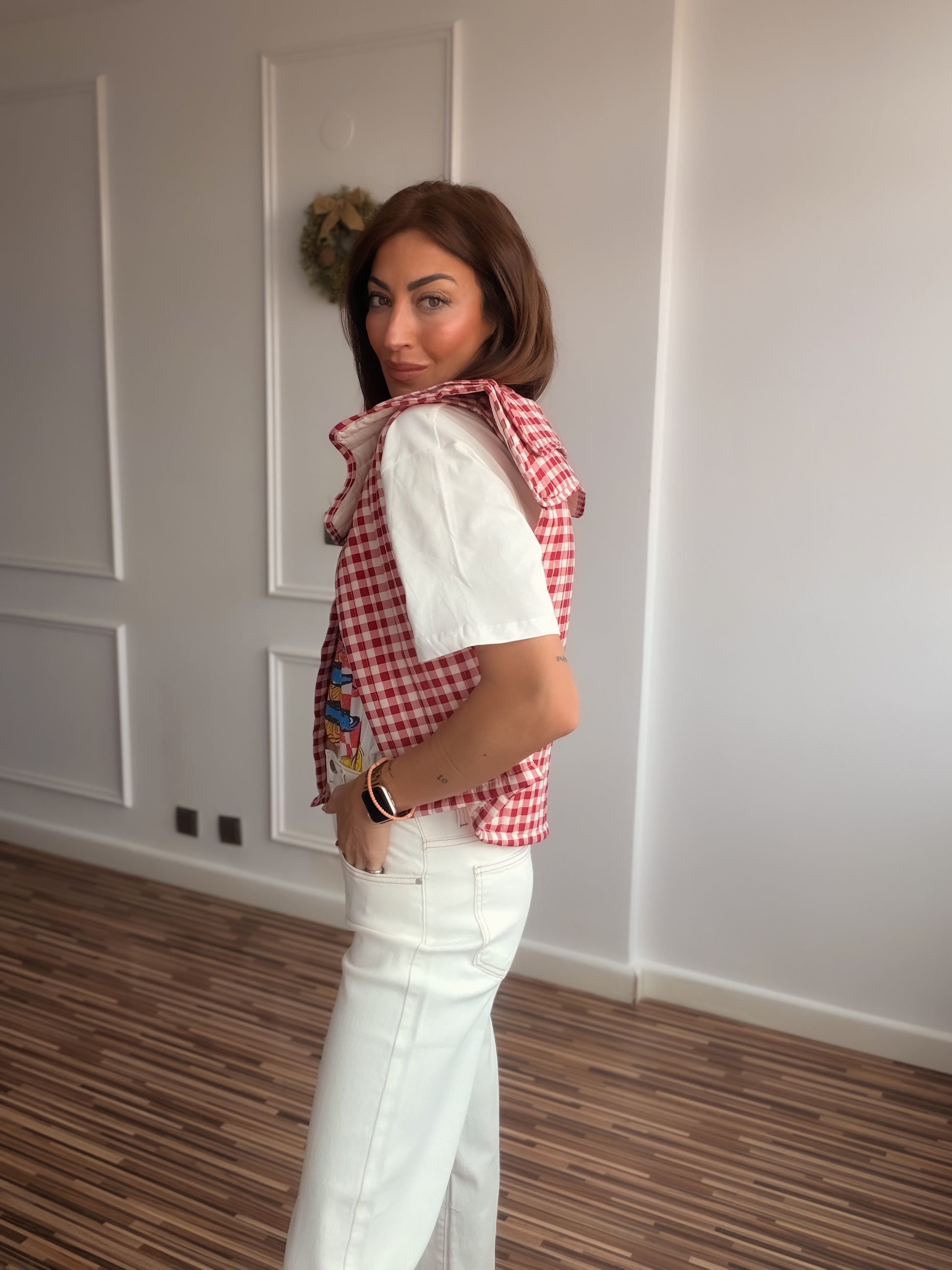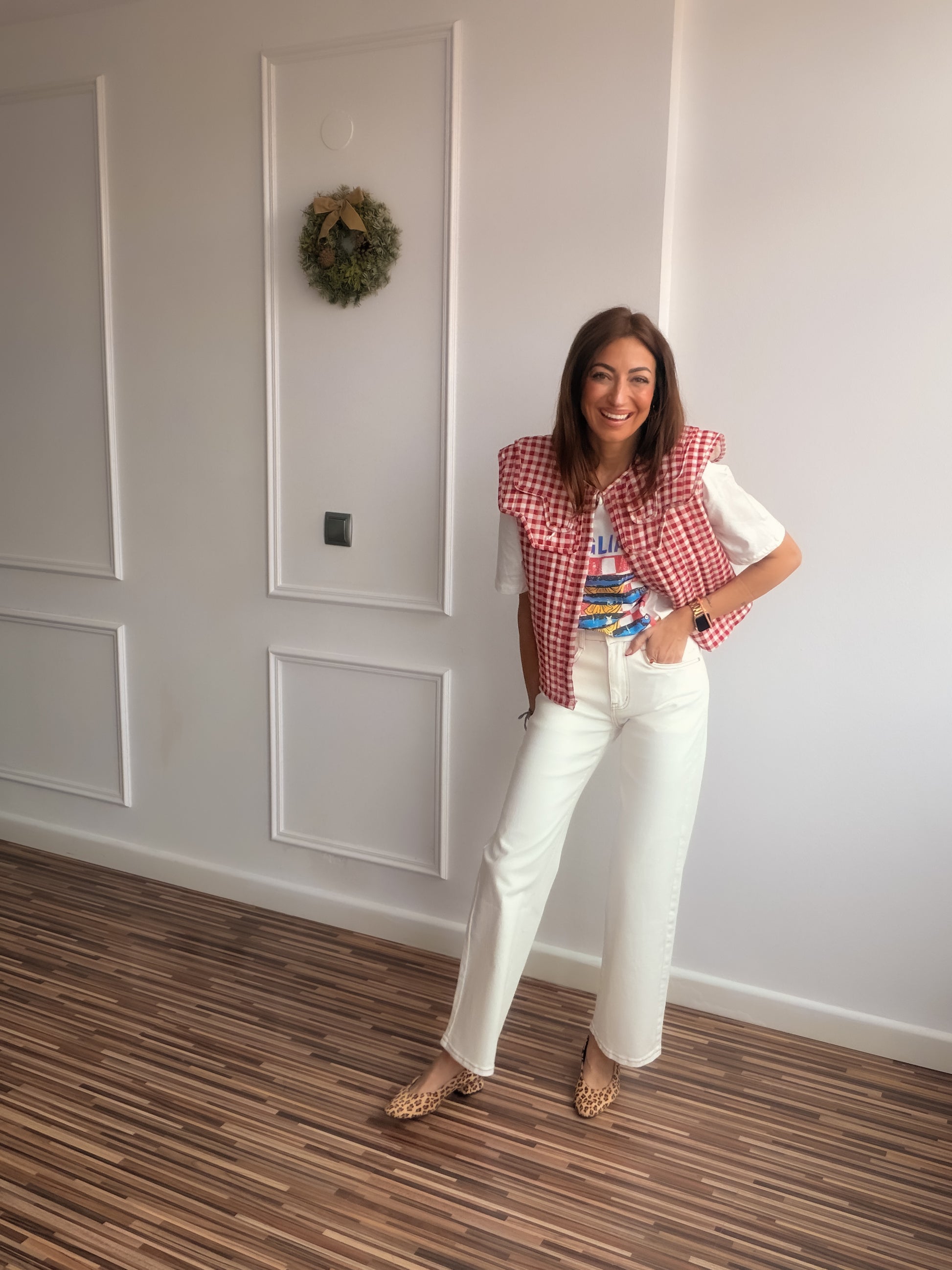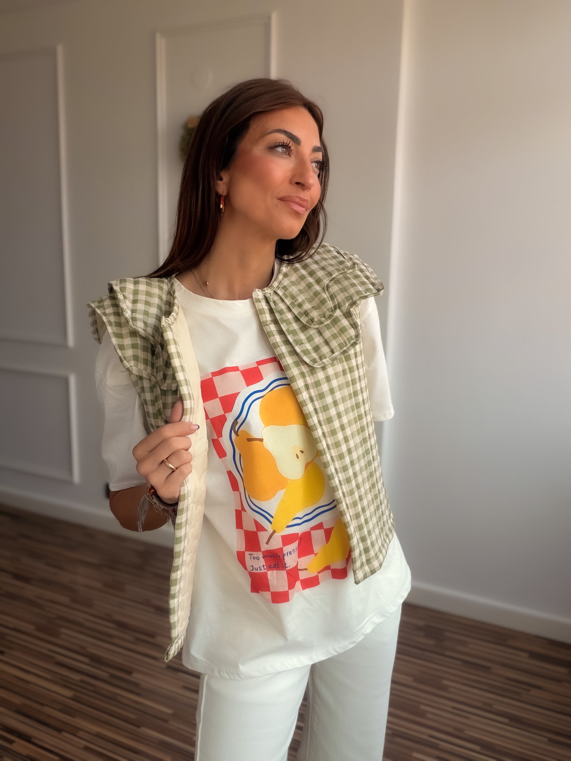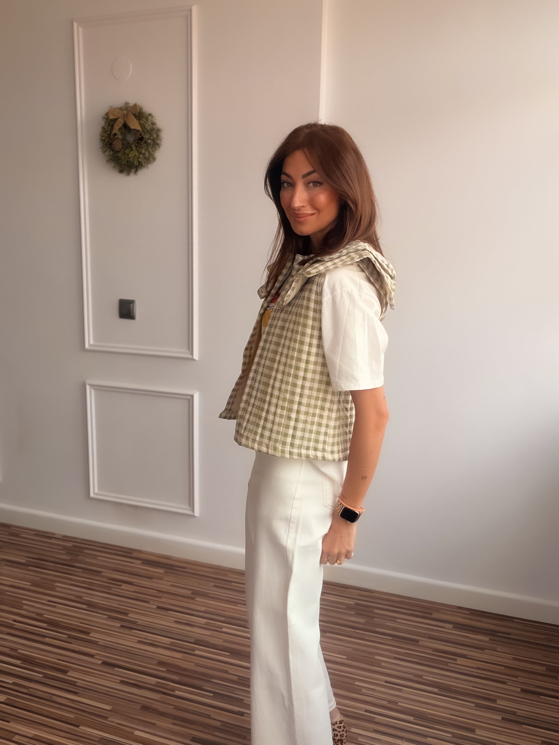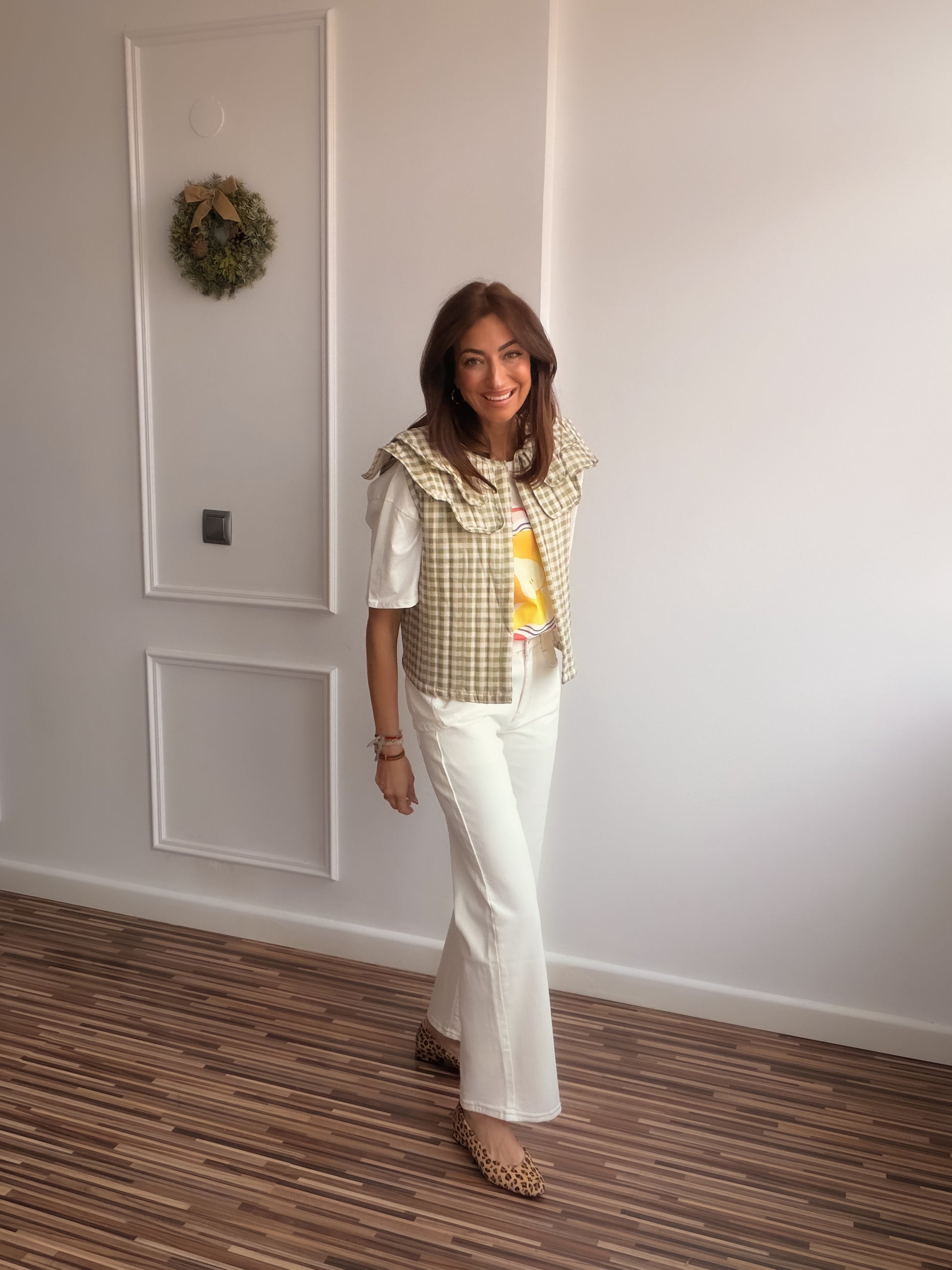 Chaleco acolchado en tejido Vichy cropped con volante al cuello.