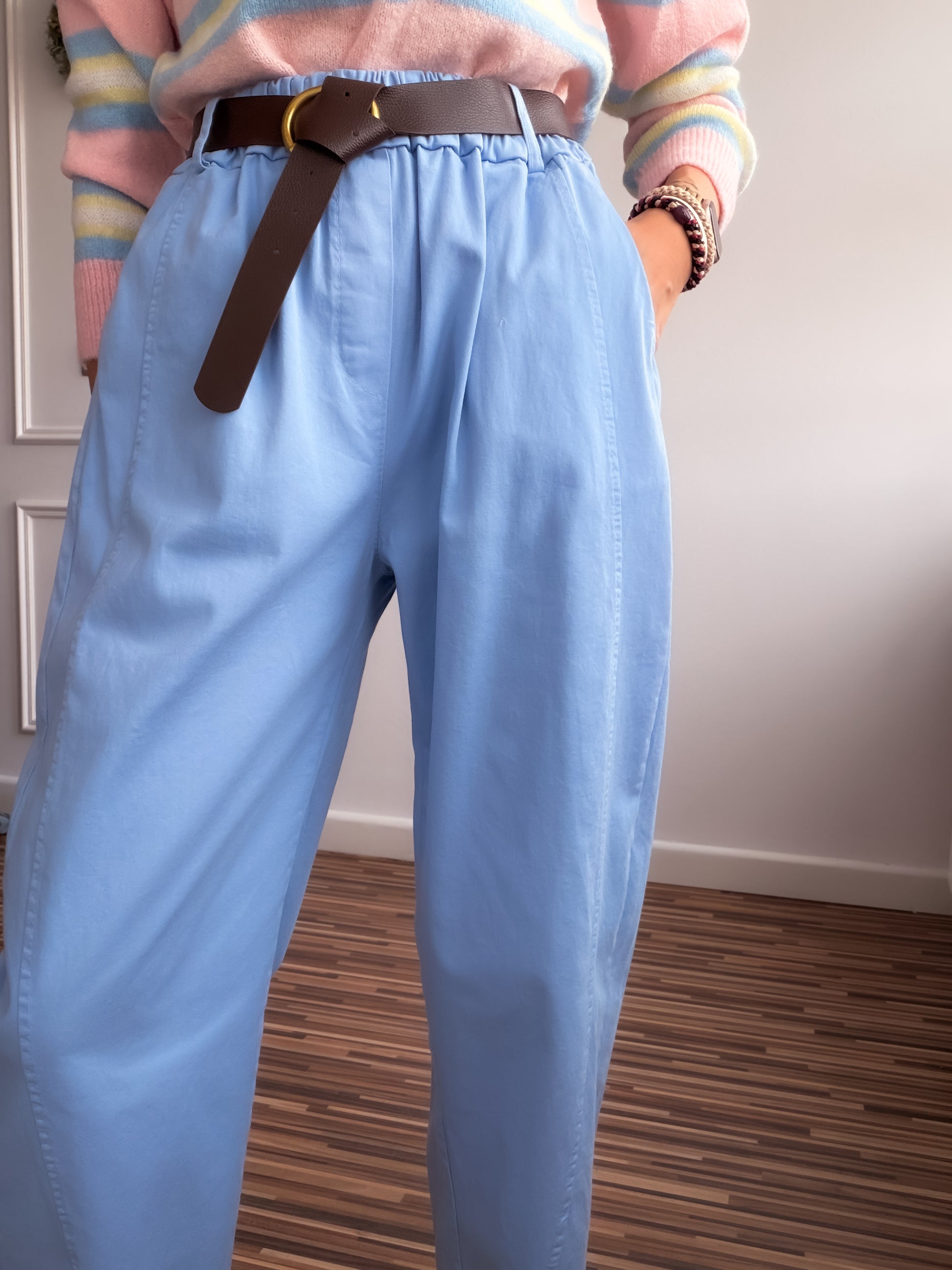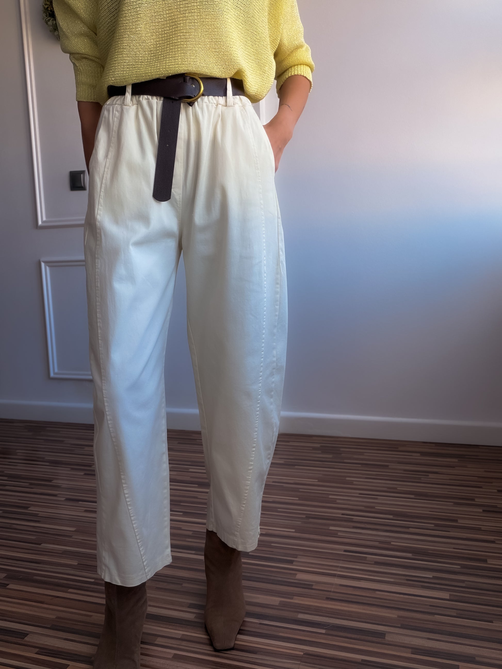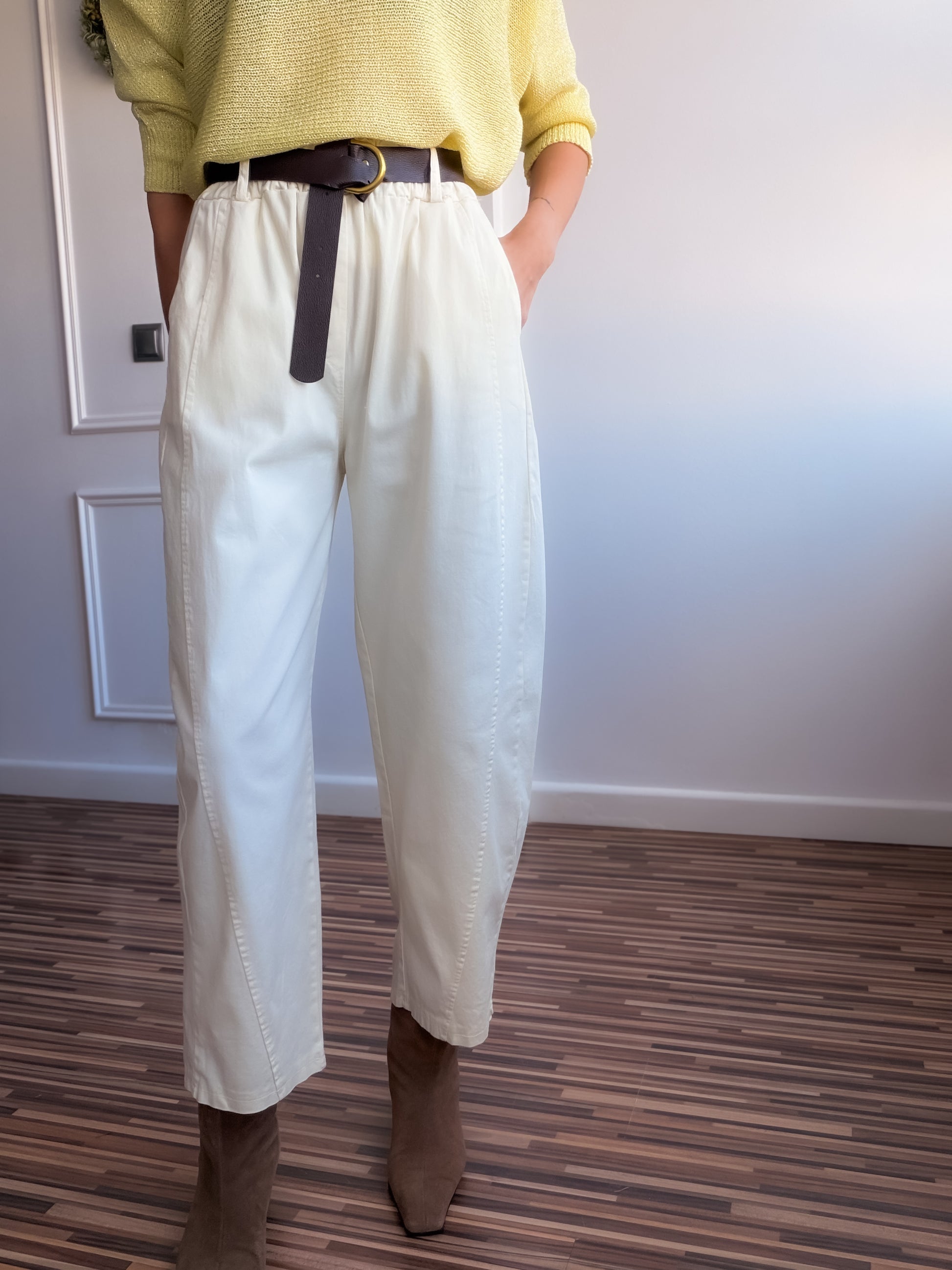 Pantalón fit balloon de talle alto y bolsillos laterales.Con cinturón y cintura elástica en parte trasera.