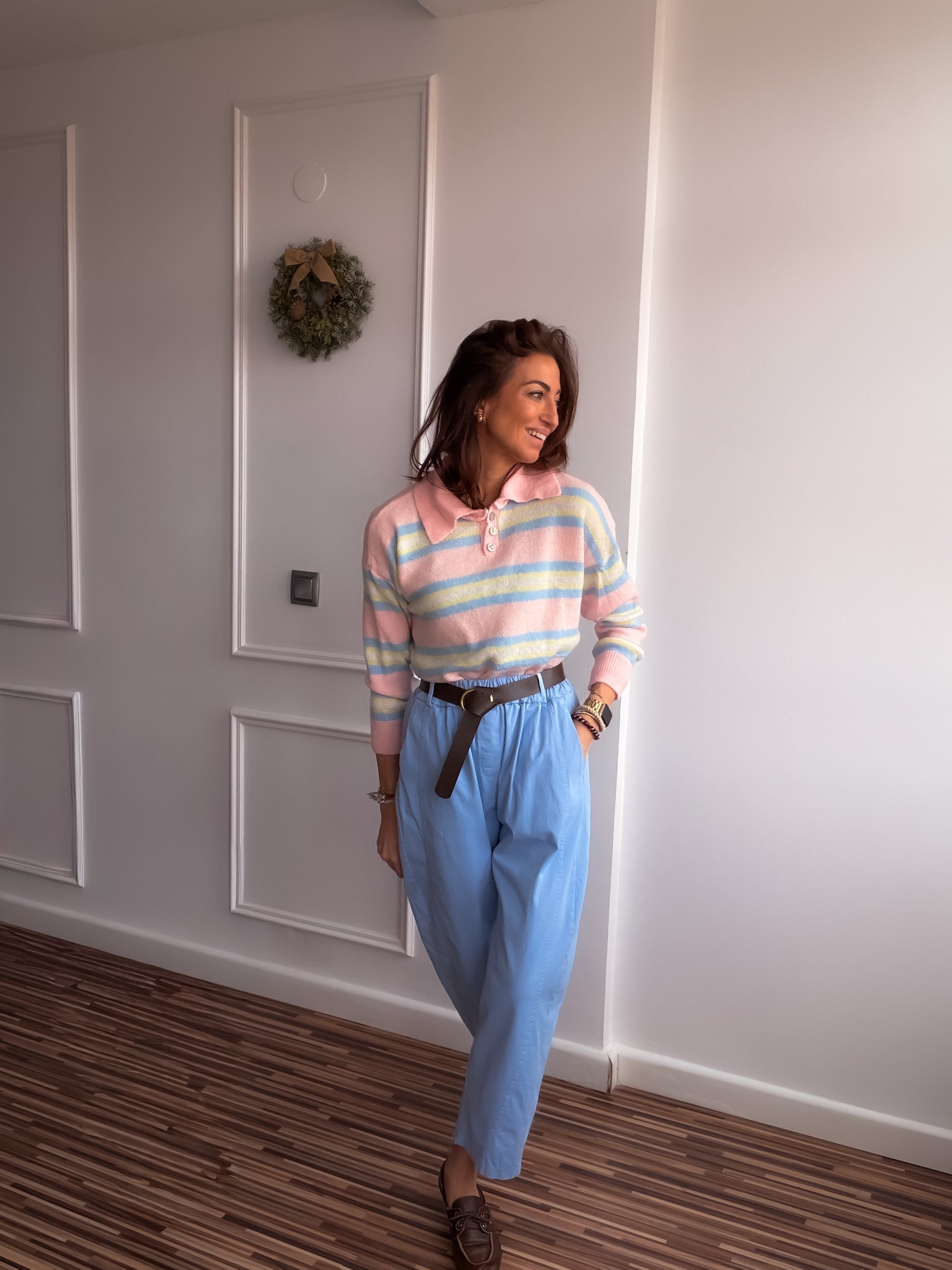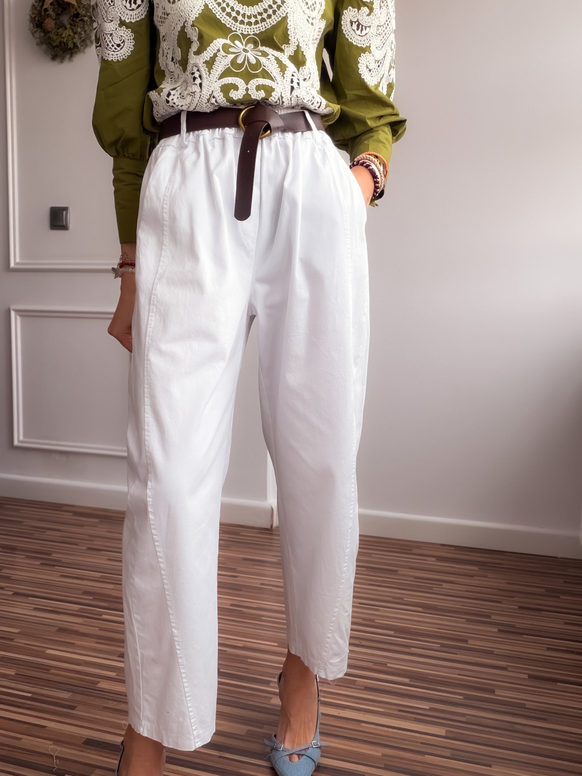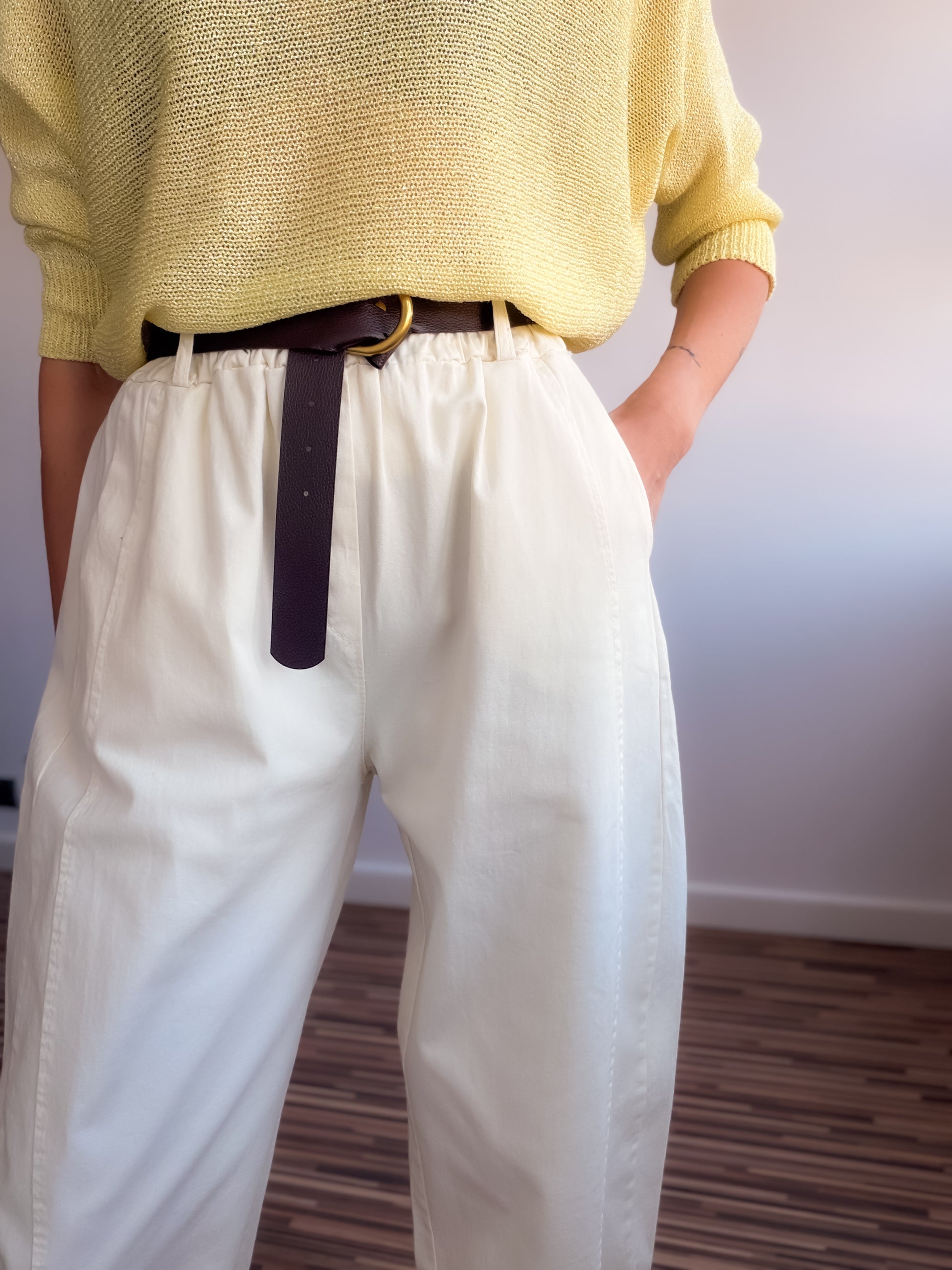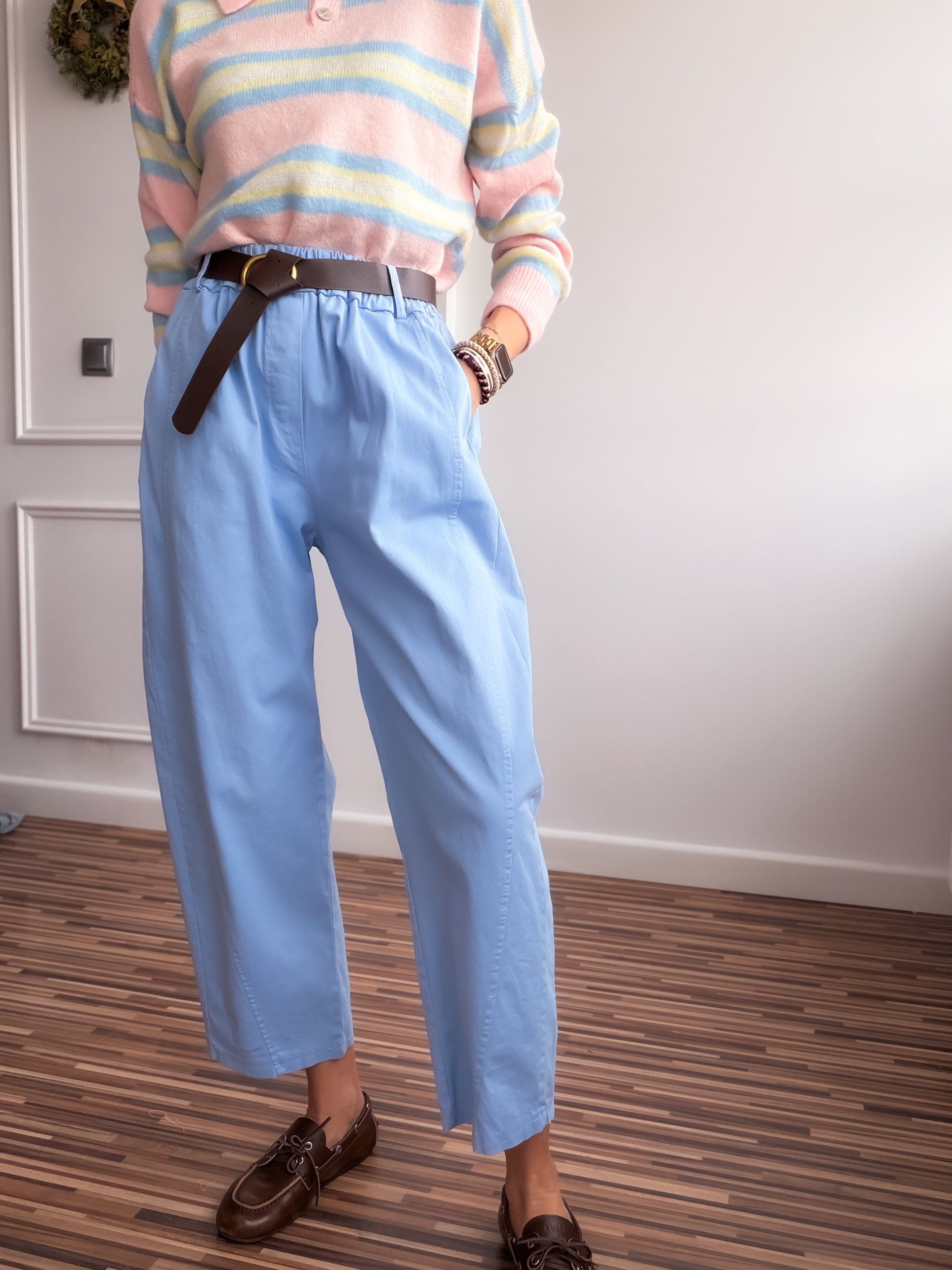 Pantalón fit balloon de talle alto y bolsillos laterales.Con cinturón y cintura elástica en parte trasera.