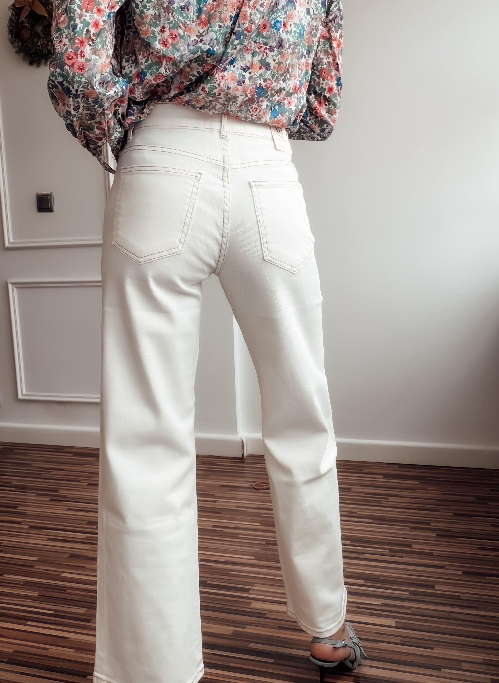 Pantalón top ventas, corte recto, tiro alto en color blanco roto , pespuntes en marrón , cinco bolsillos.