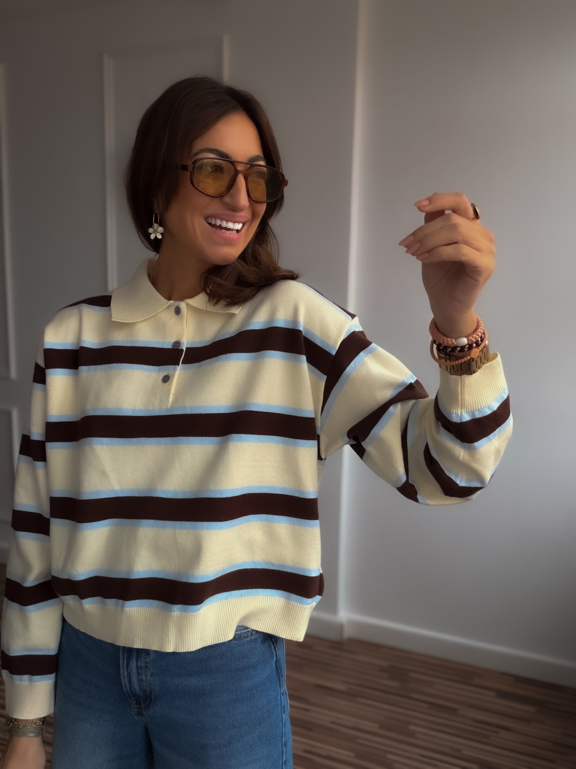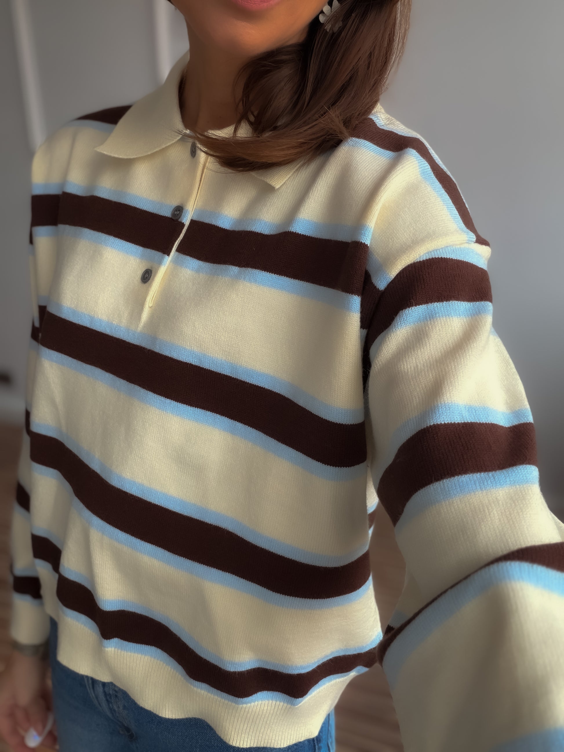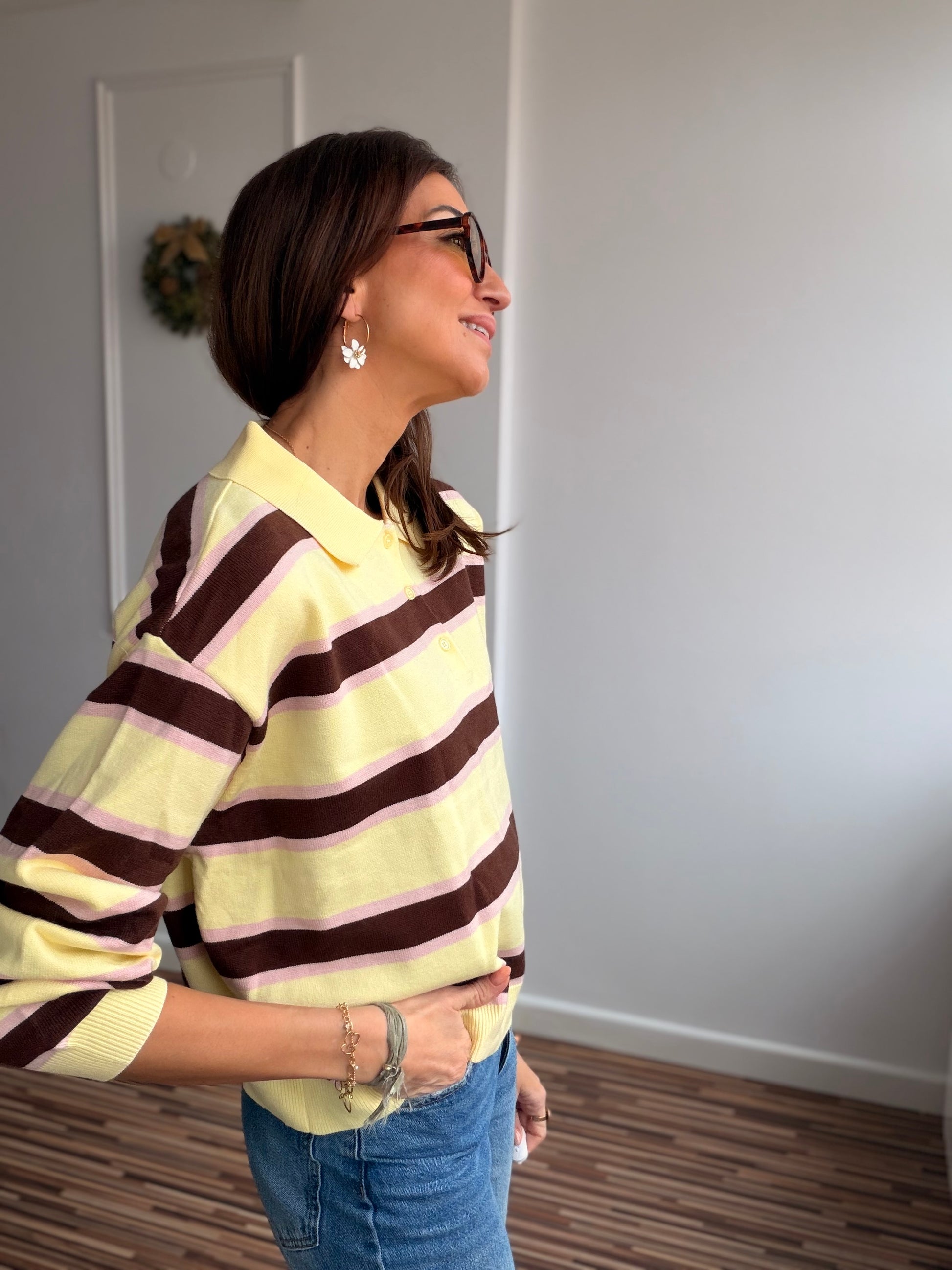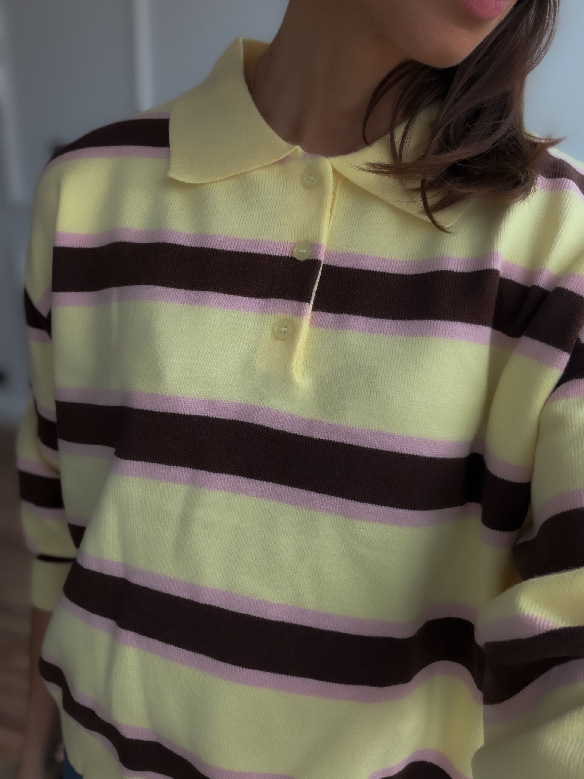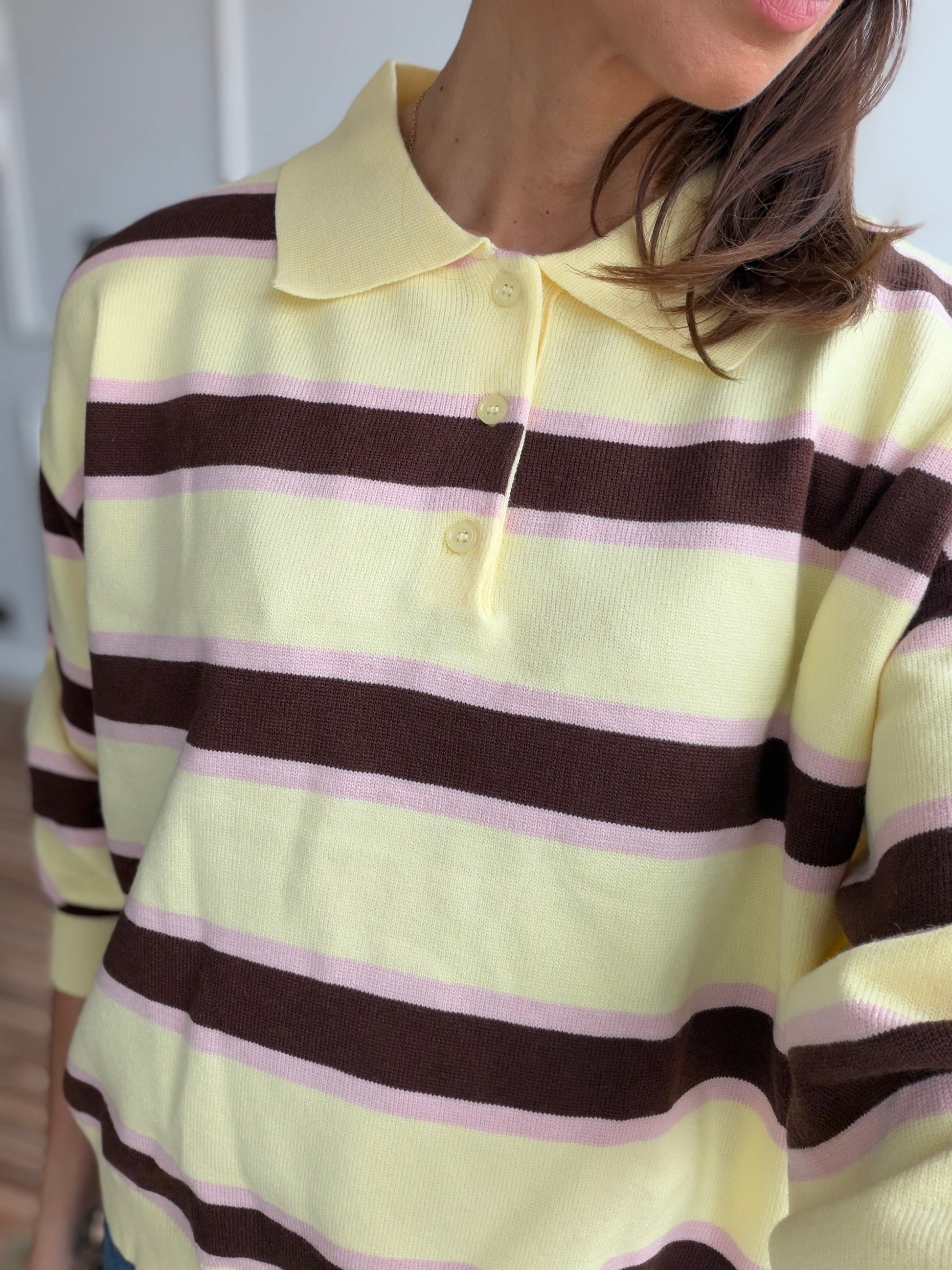 Polo en tejido piqué de algodón , en rayas amarillo mantequilla , marrón y rosa o azul.