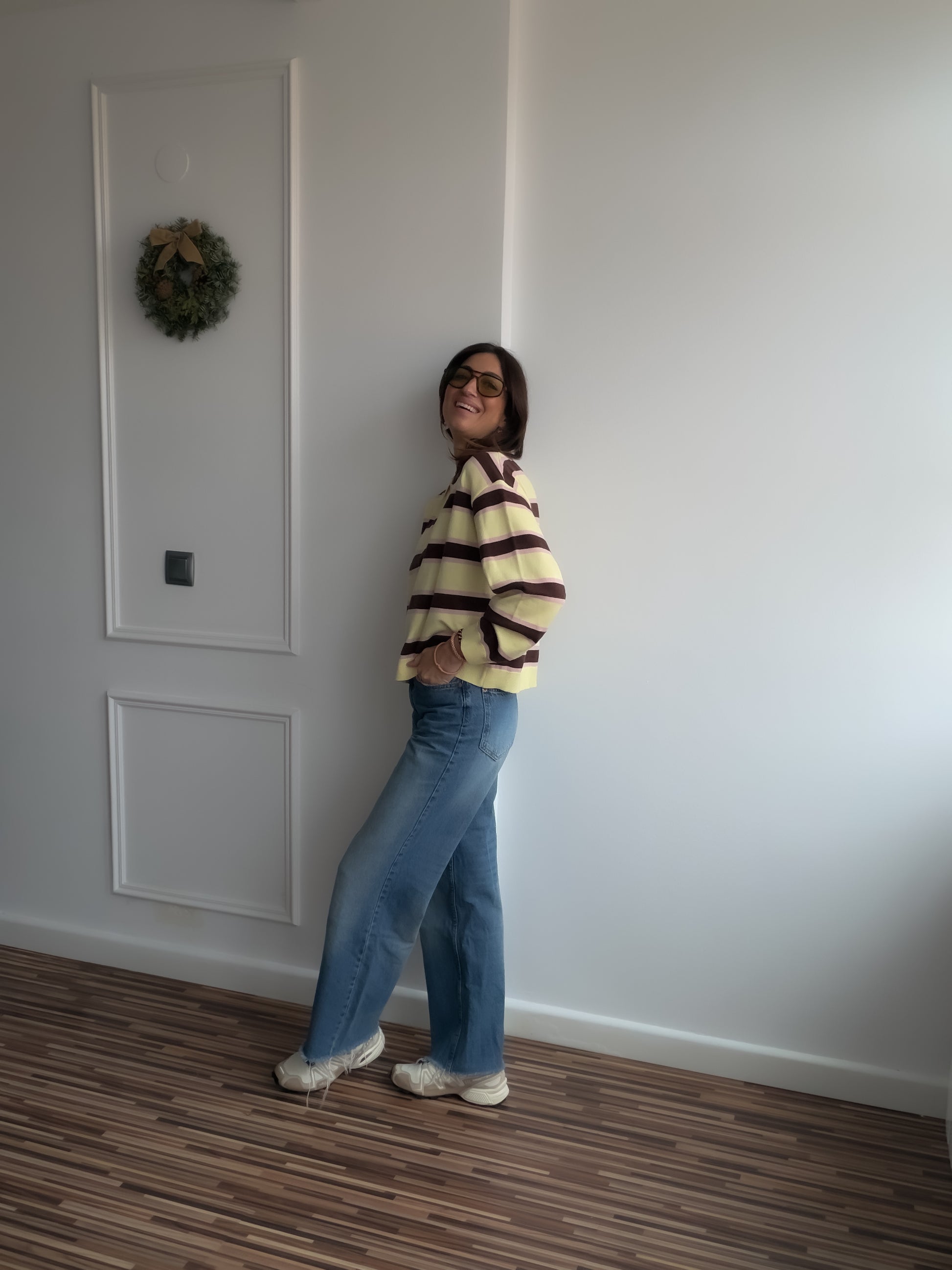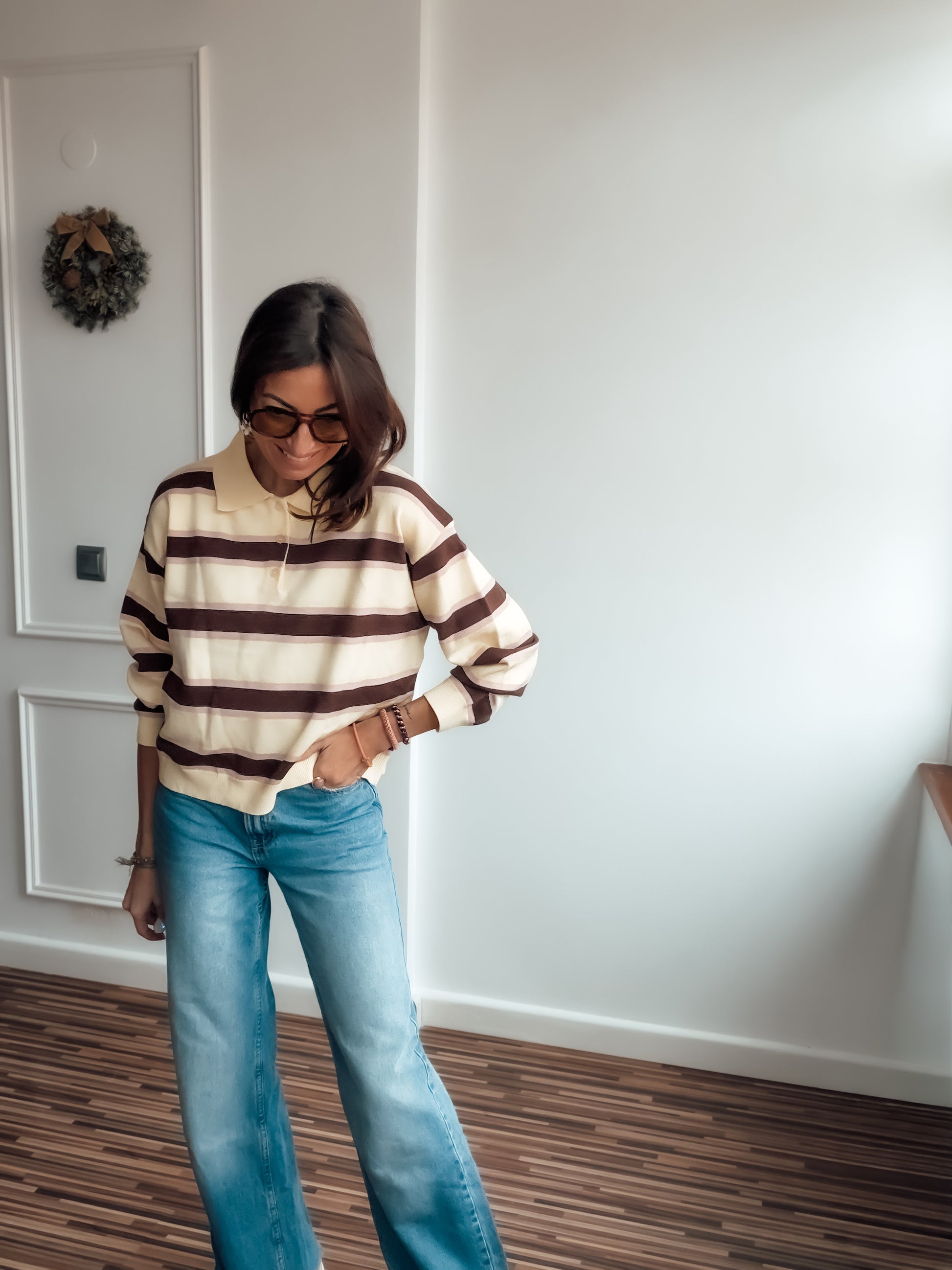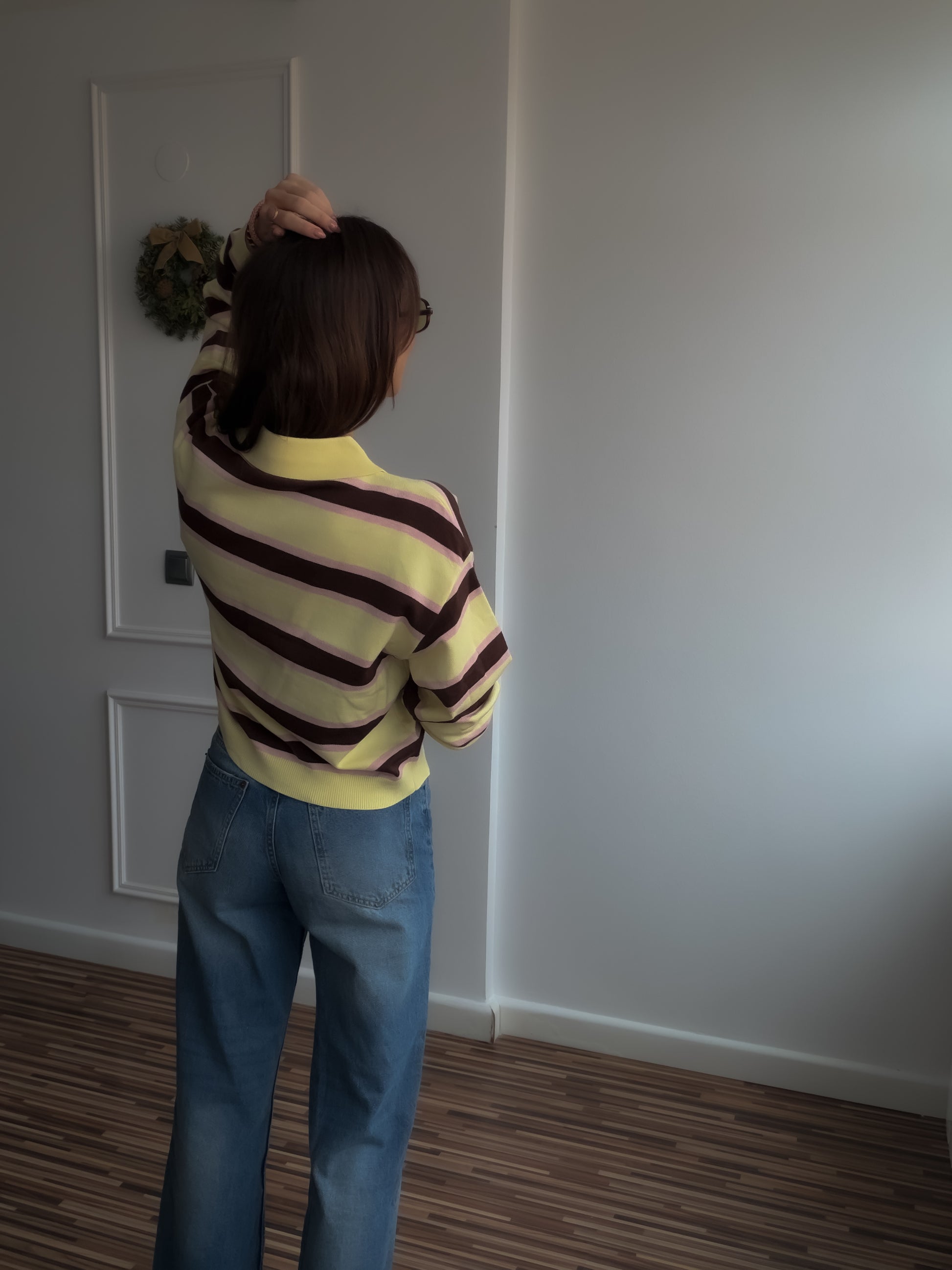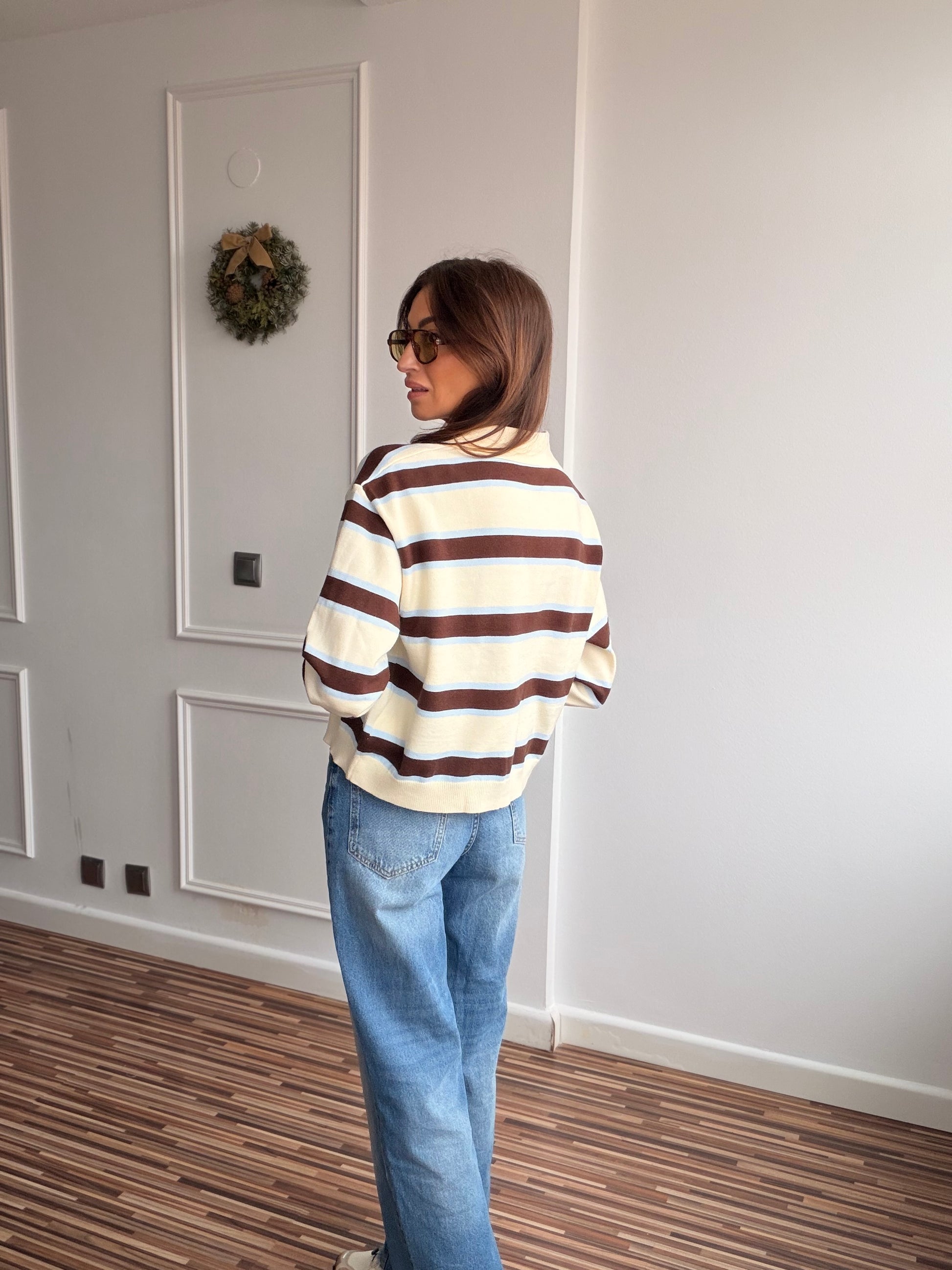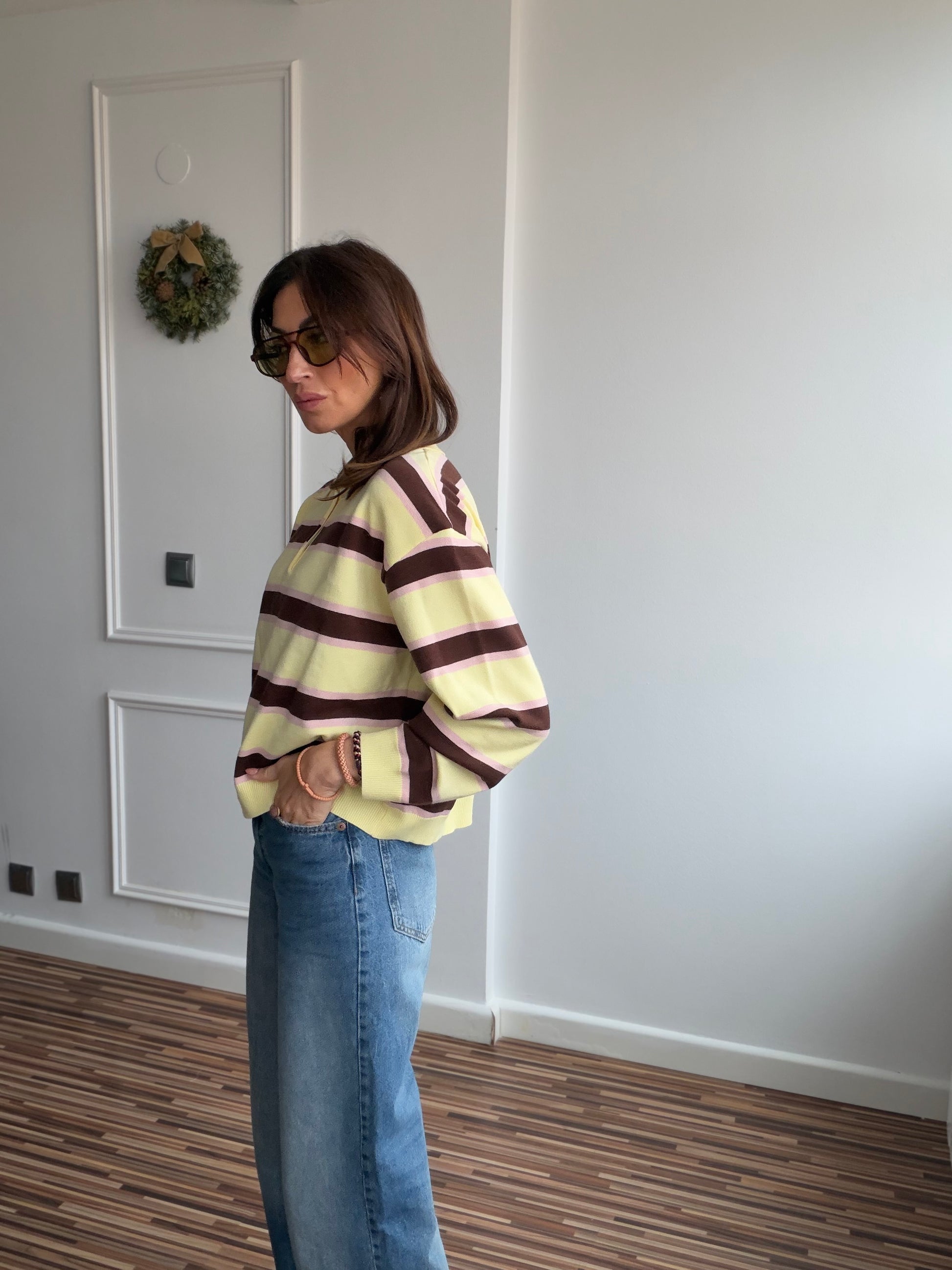 Polo en tejido piqué de algodón , en rayas amarillo mantequilla , marrón y rosa o azul.