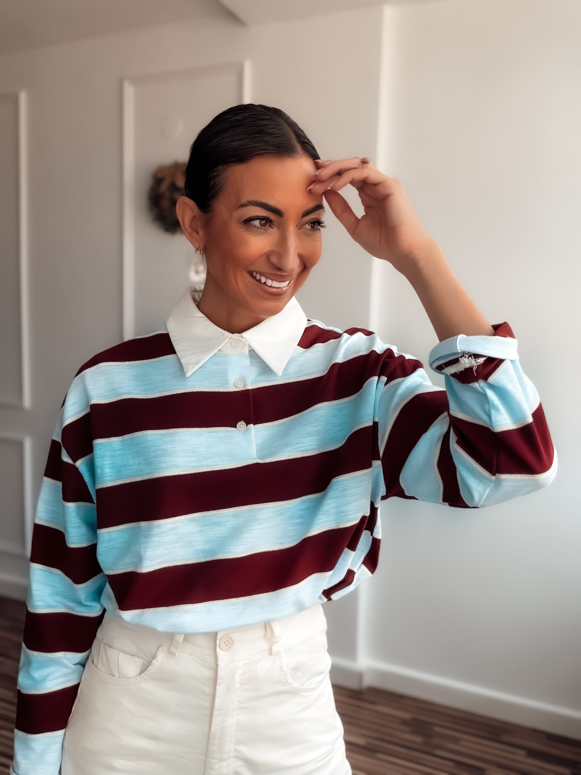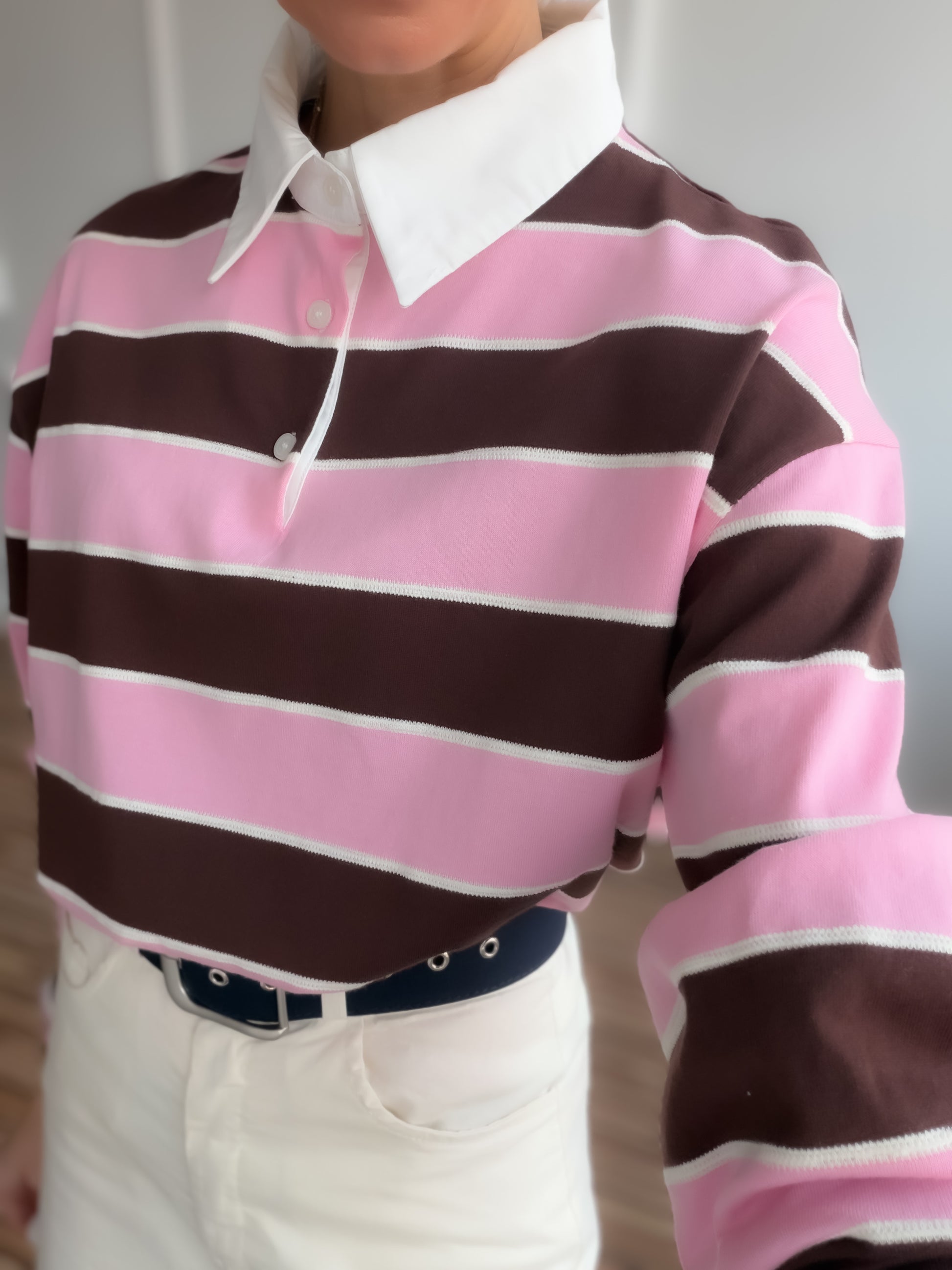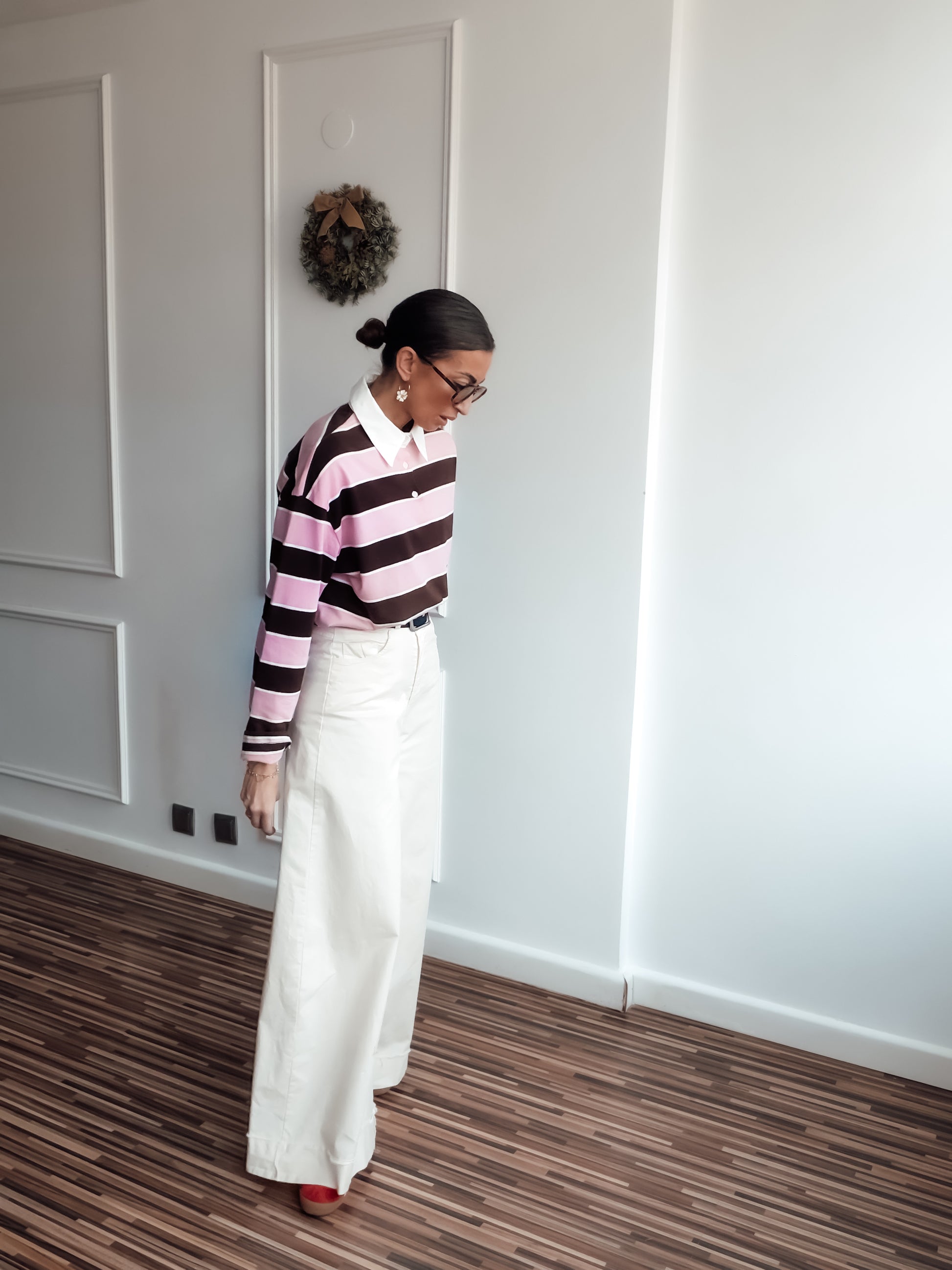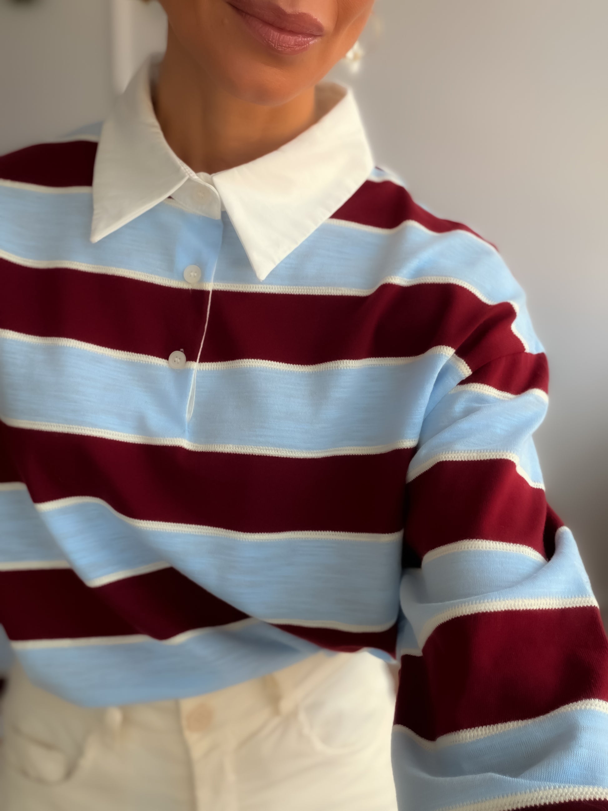 Polo en tejido algodón de rayas y cuello camisero.Ligero con botonadura en parte superior.Corte oversize