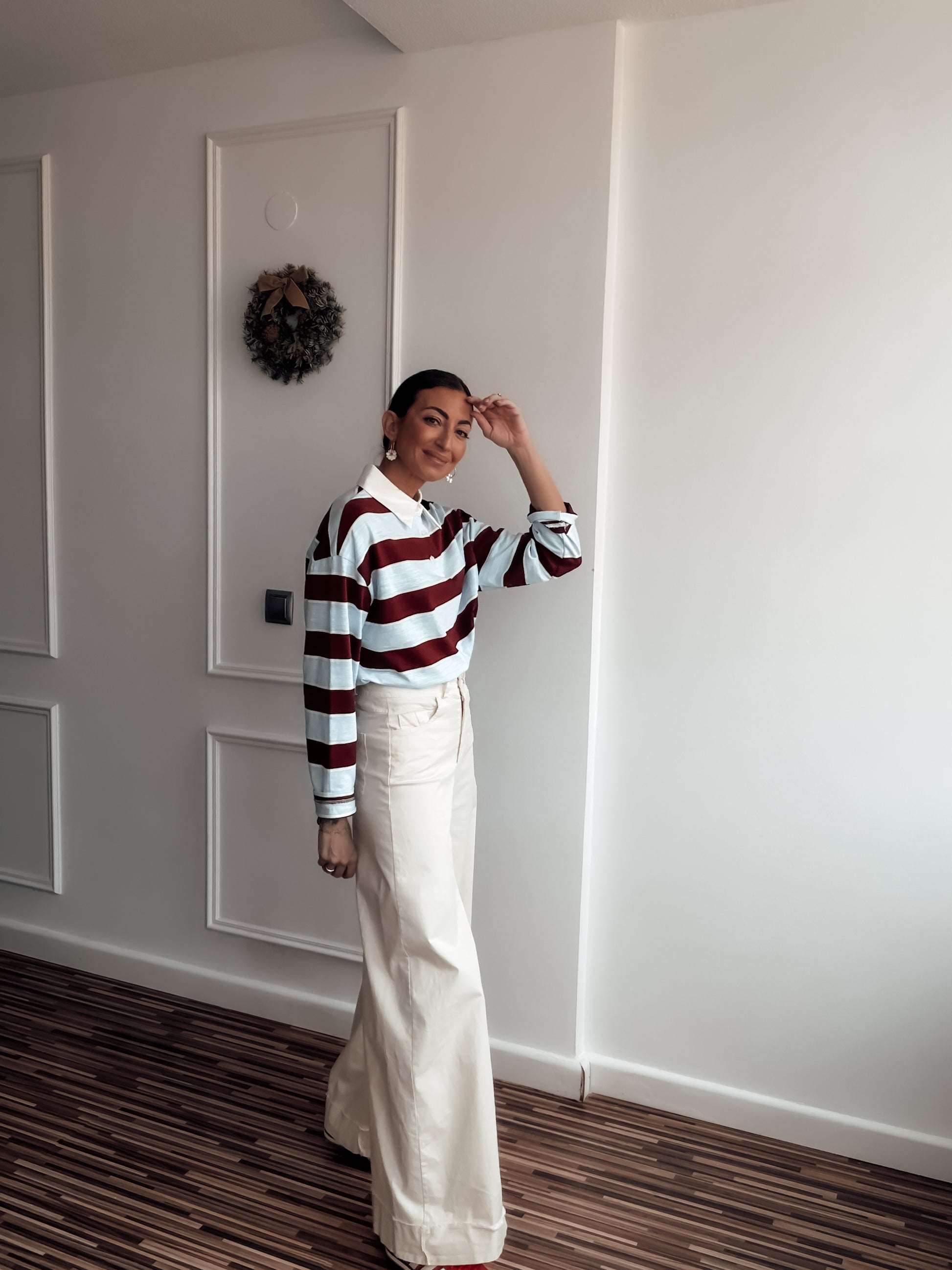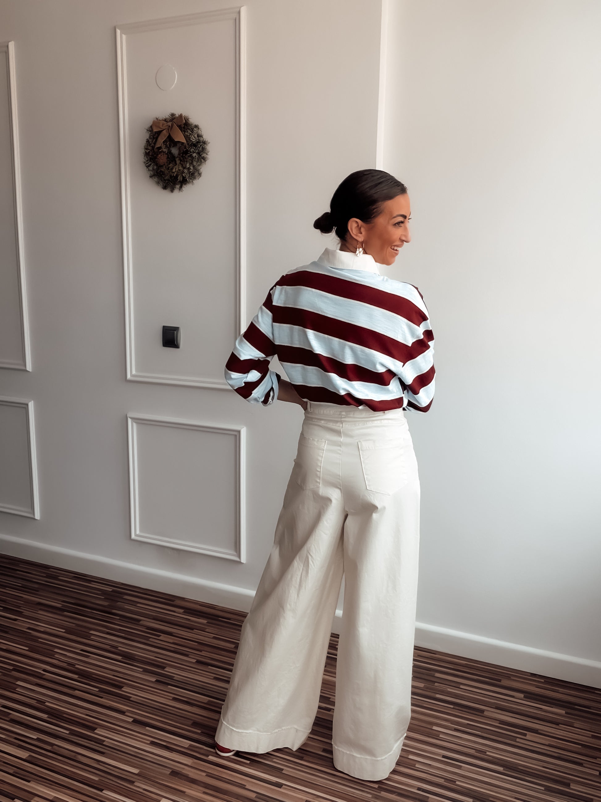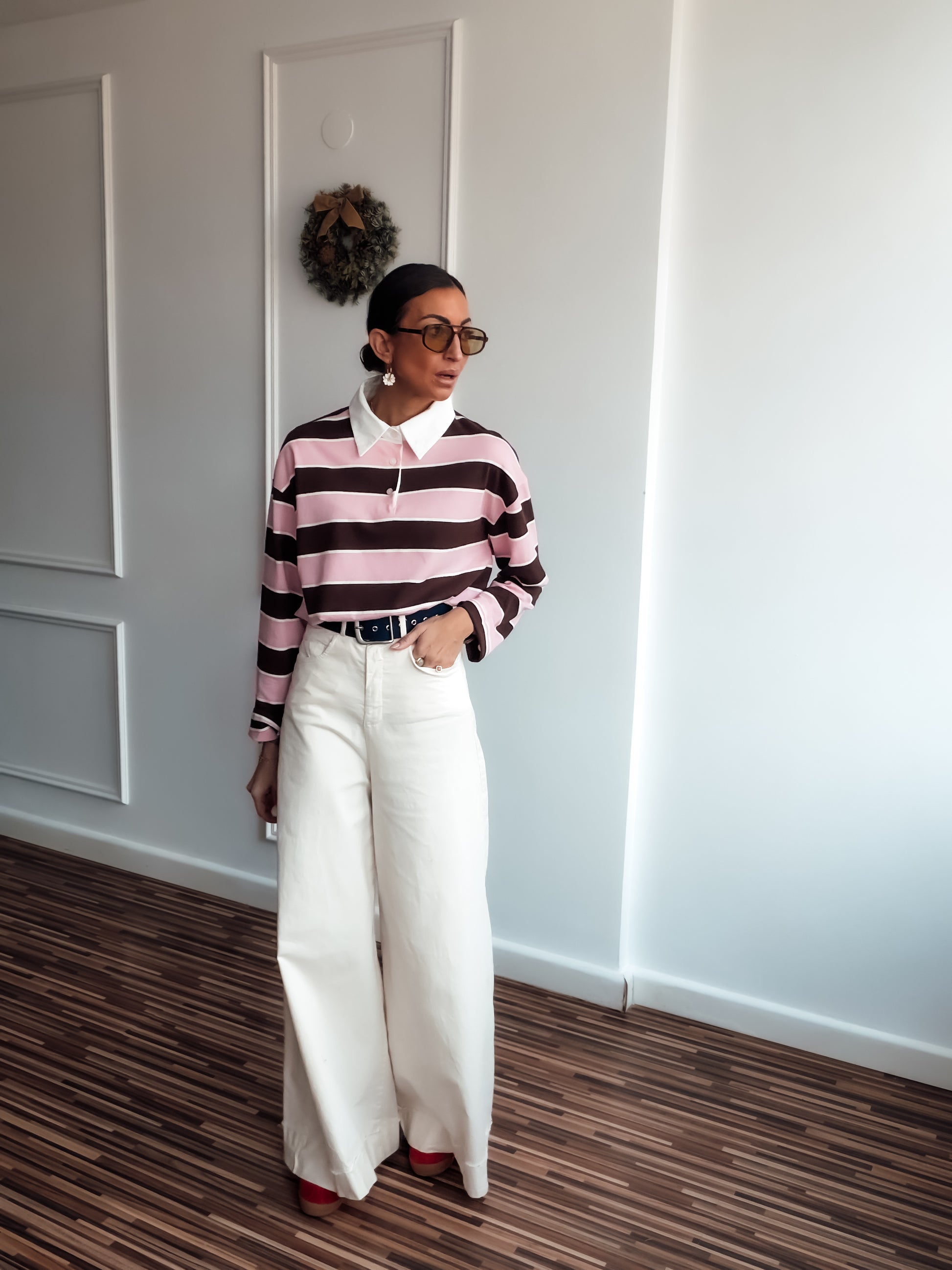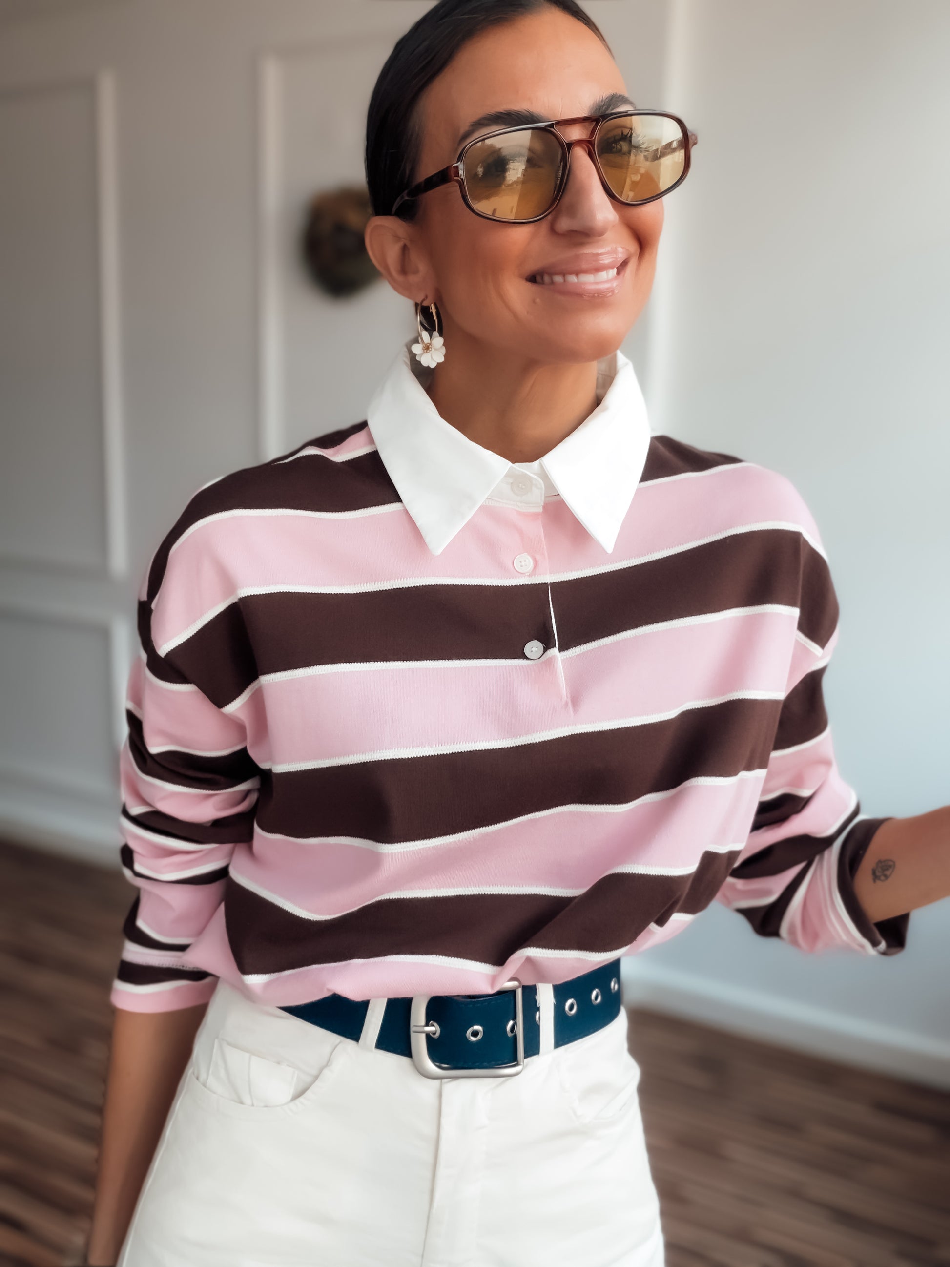 Polo en tejido algodón de rayas y cuello camisero.Ligero con botonadura en parte superior.Corte oversize