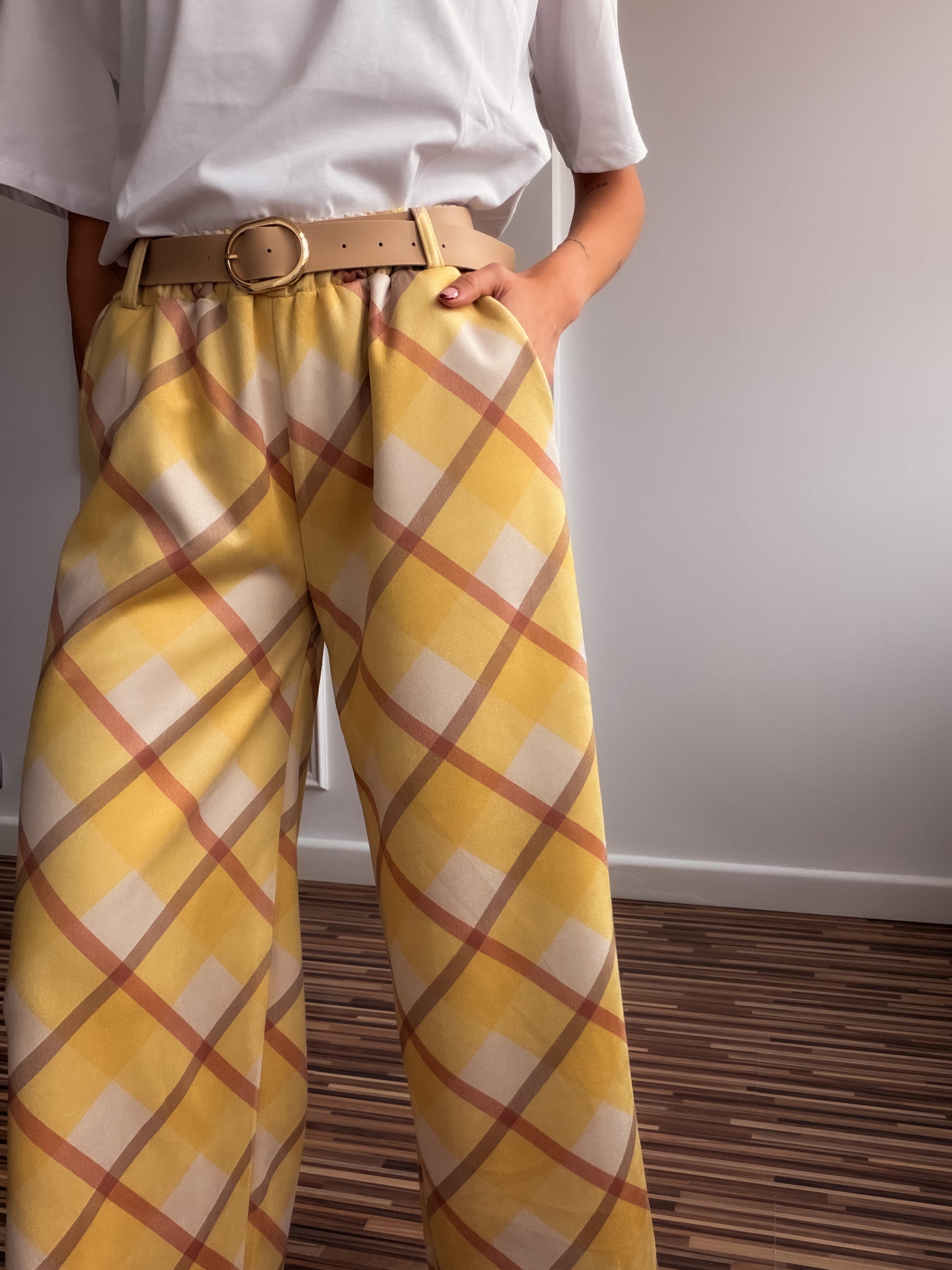 Pantalones con elástico en cintura y cinturón , bolsillos laterales y corte recto.