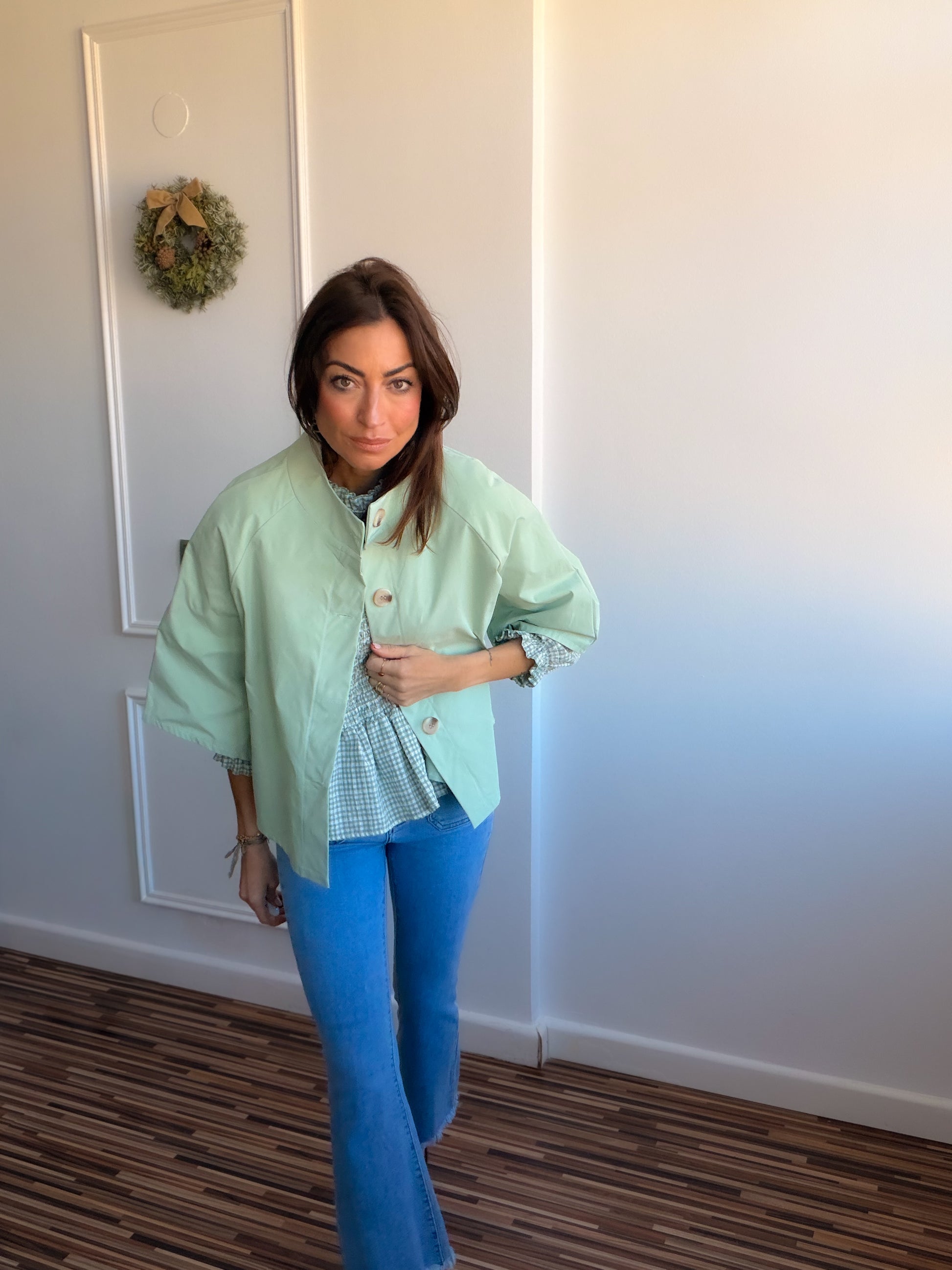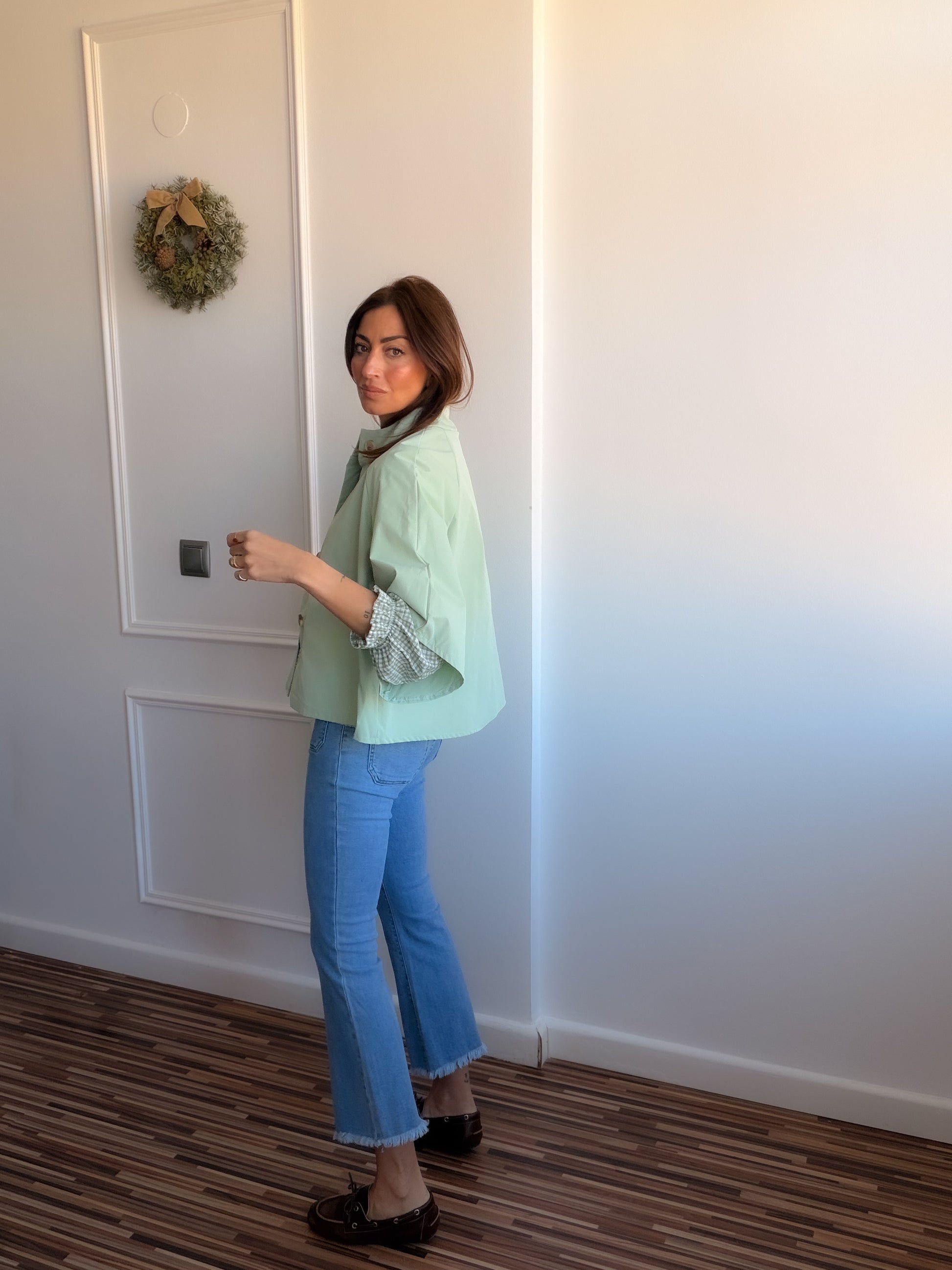 Trench corta vientos ligero corte crop y manga francesa, bolsillos laterales y cuello ligeramente subido.